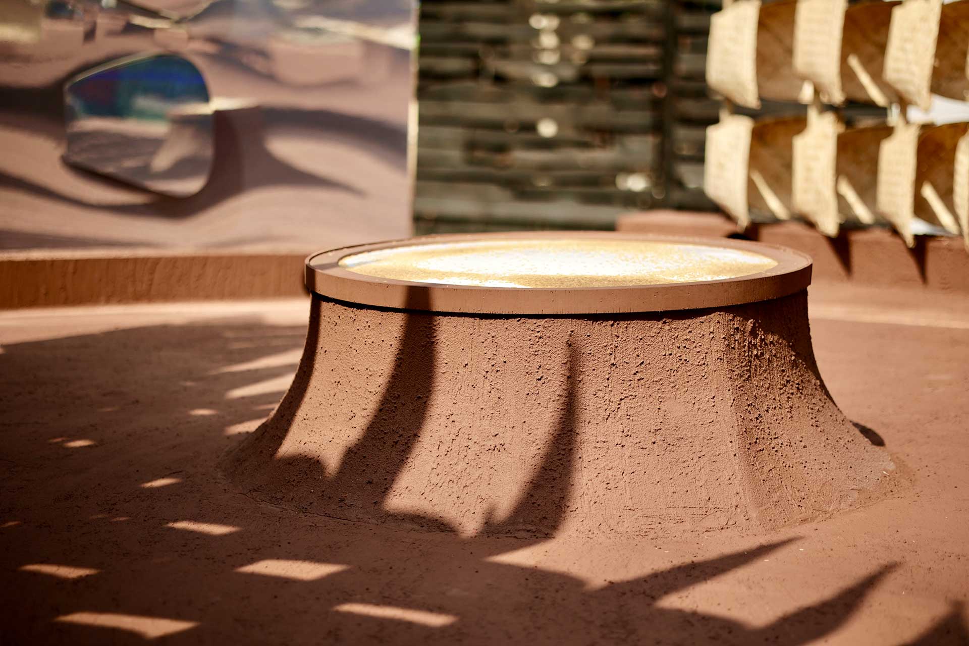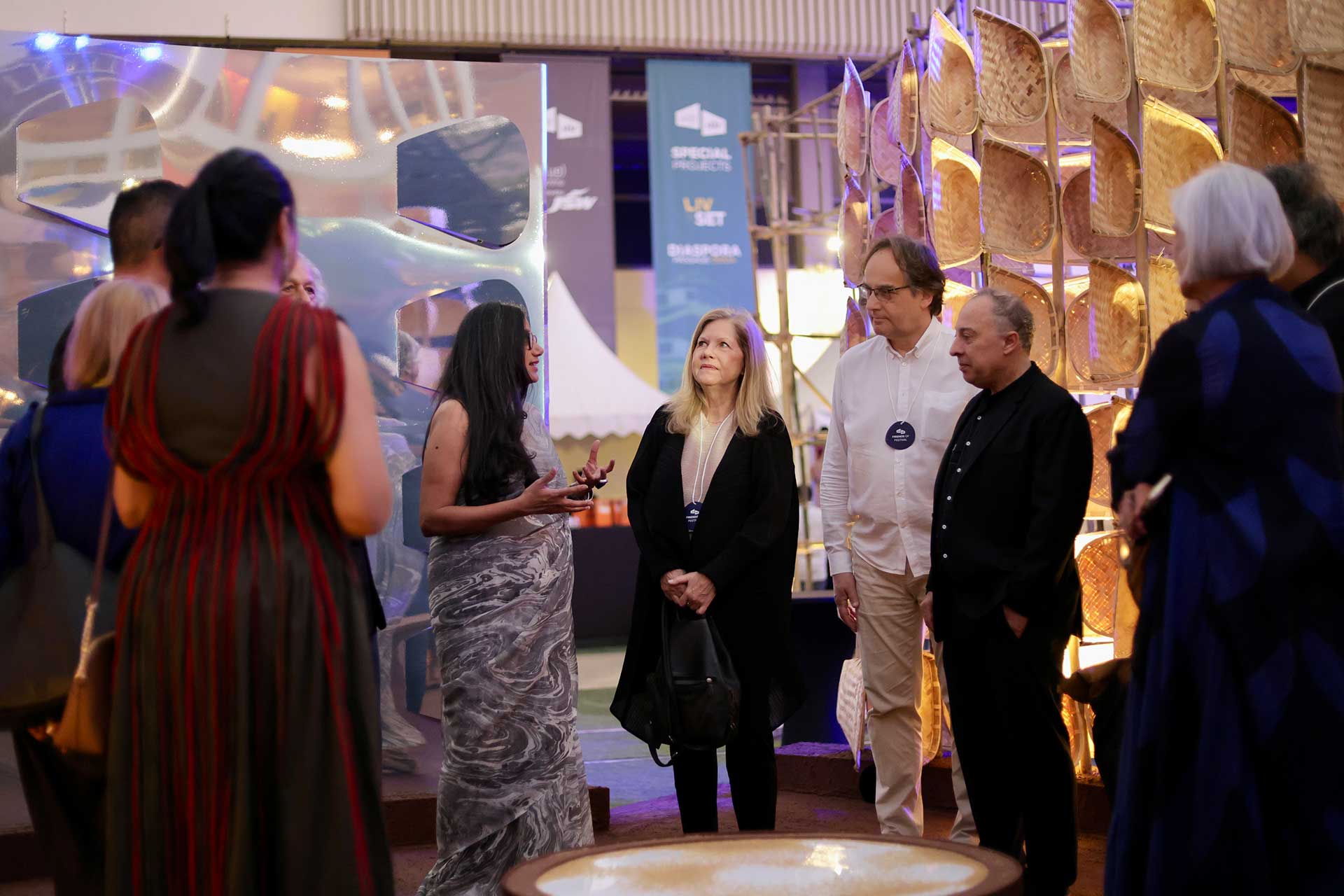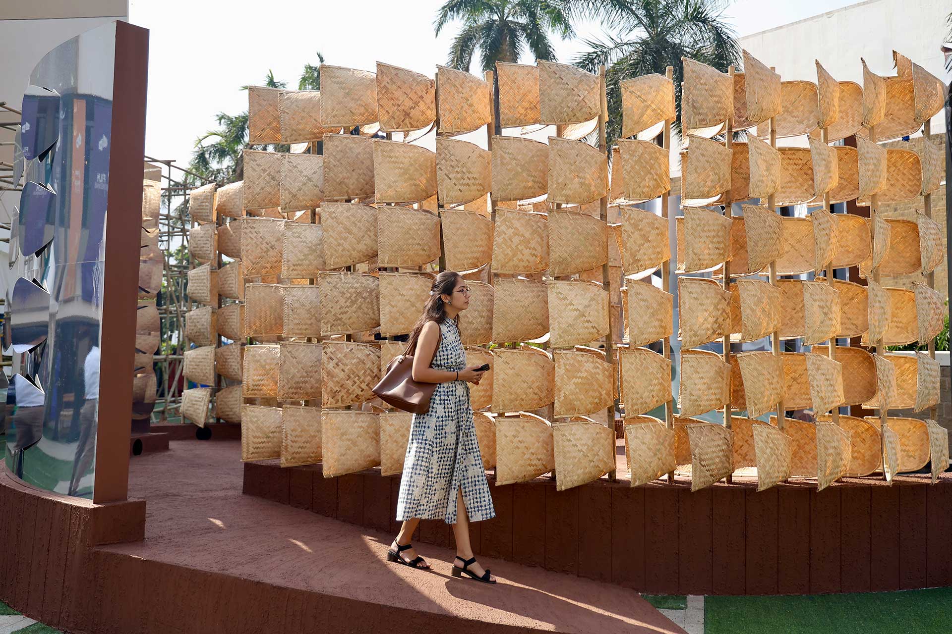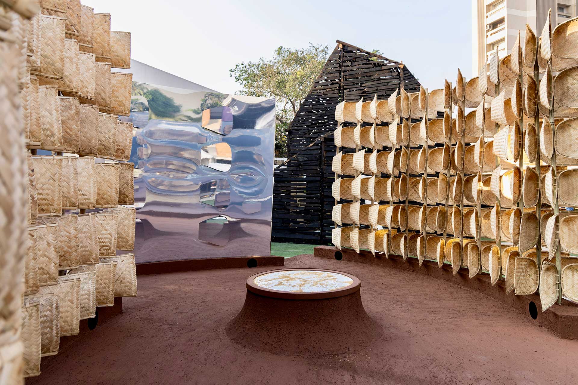 Conceived as a multisensory spiral, the pavilion gathers visitors inward, guiding them through concentric layers of bamboo sieves that modulate light, shadow, sound and motion. At its core, vibration becomes visible and sound acquires rhythm, turning the humble act of sifting into a fully immersive spatial encounter. Mumbai is evoked not as a fixed form, but as a living passage—an ever-shifting convergence of lives and desires, where energies rise, dissolve and reassemble in continuous flux.