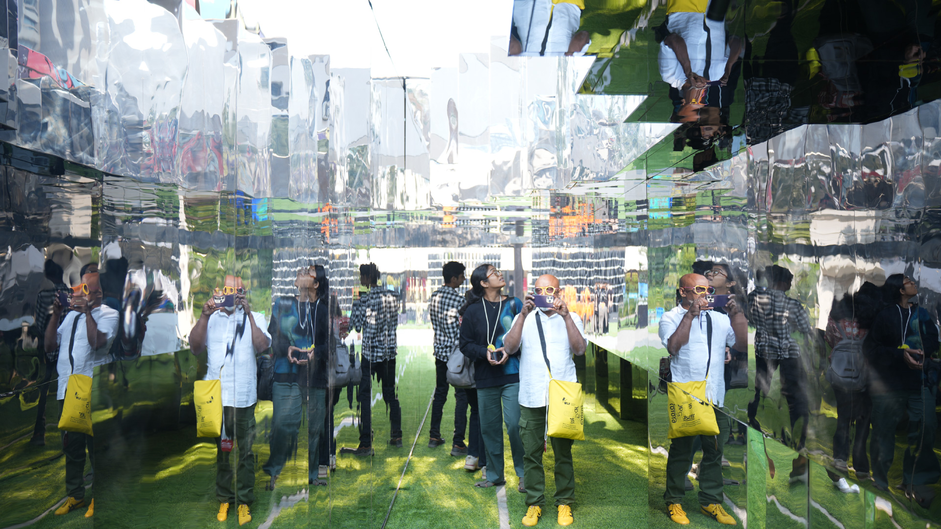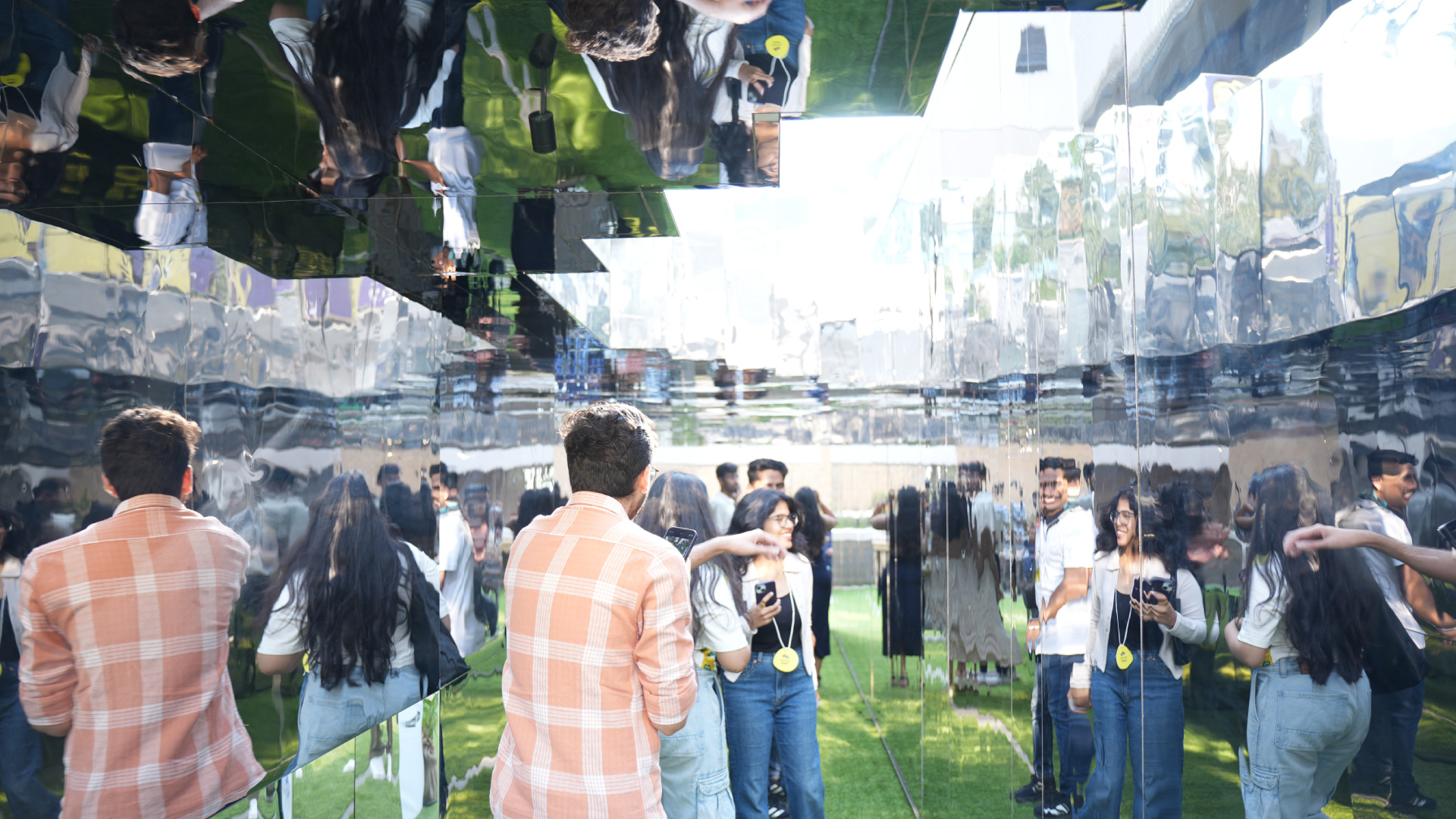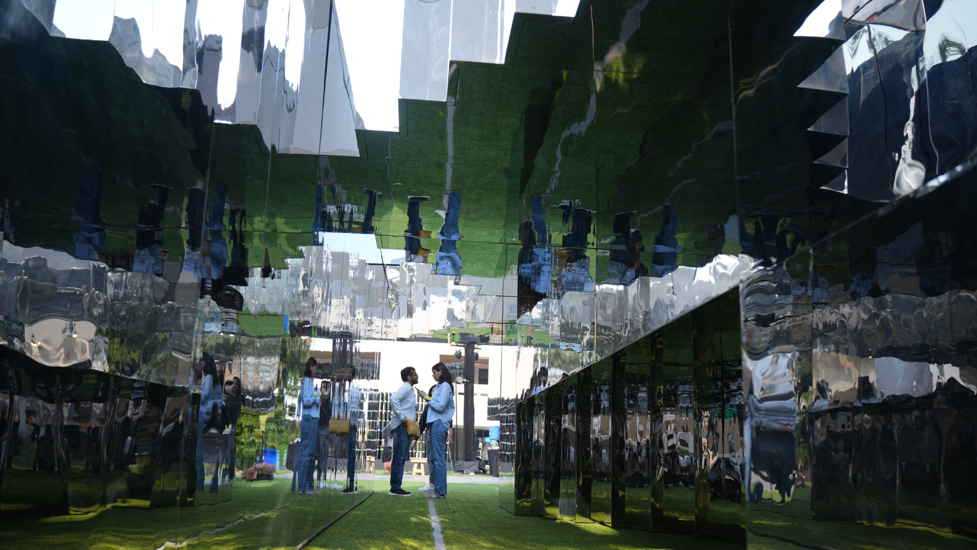 Conceived as a monolithic stainless steel structure with space folded unto itself and refracted ad infinitum, this peculiar mise-en-scene of the baoli becomes a stage for vivid fantasies. Plain steps reflected on fathomless mirrored planes—distinctions between the tangible and intangible blur as SHROFFLEóN, led by Maria I Jimenez-Leon and Kayzad R.Shroff, reflects on the sustainable, versatile materiality of stainless steel in collaboration with Jindal Stainless. The studio’s restraint in choosing this mono-material, from structure to cladding, opens avenues to explore details, joineries, finishes and the properties of a singular element—an experiment in stainless steel’s duplicitous simplicity, turning what was two-dimensional into multi-dimensions.