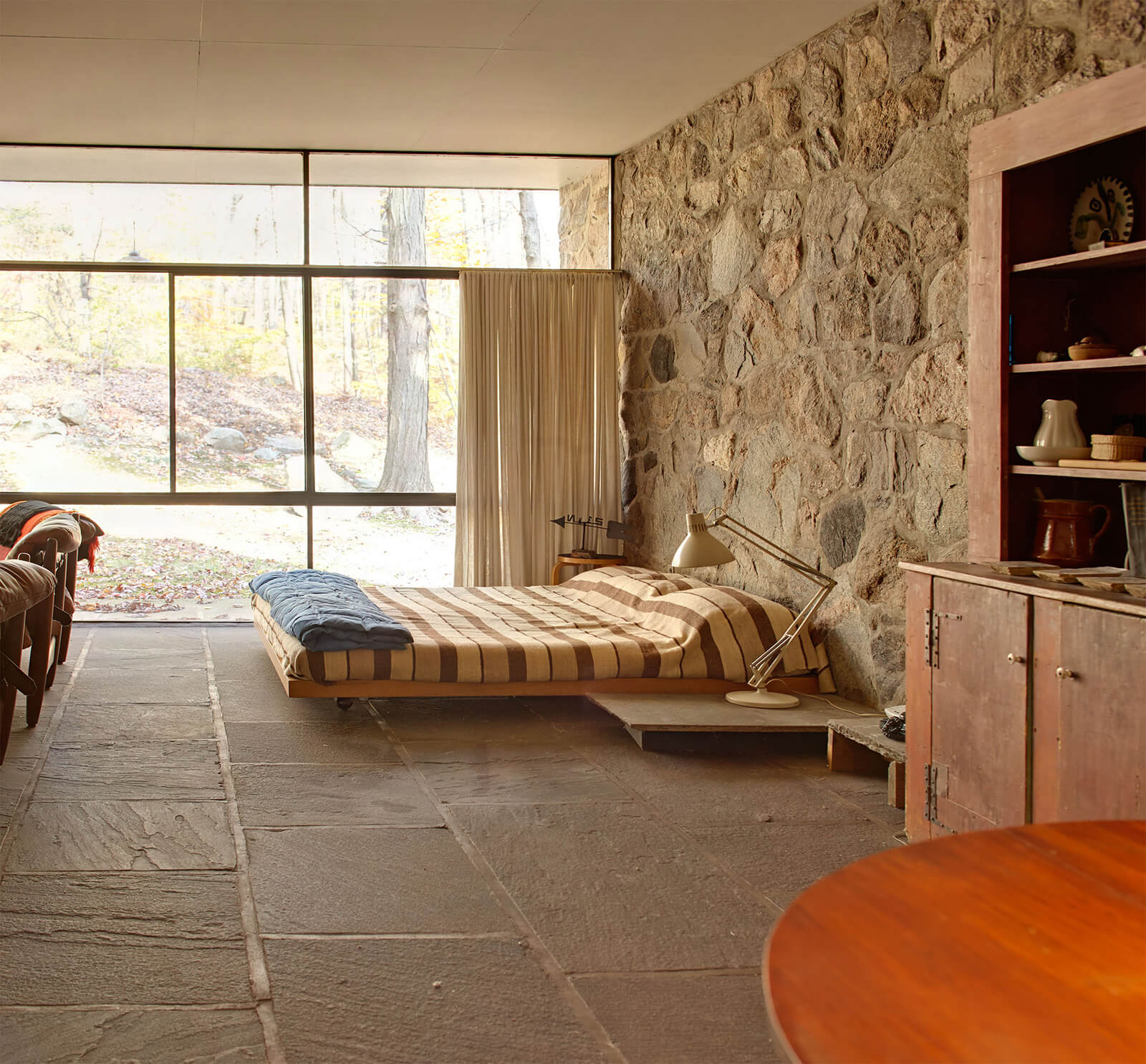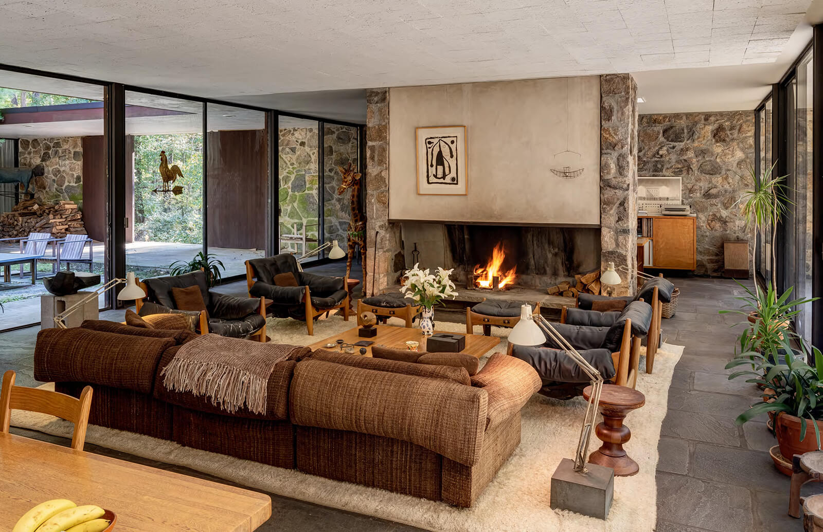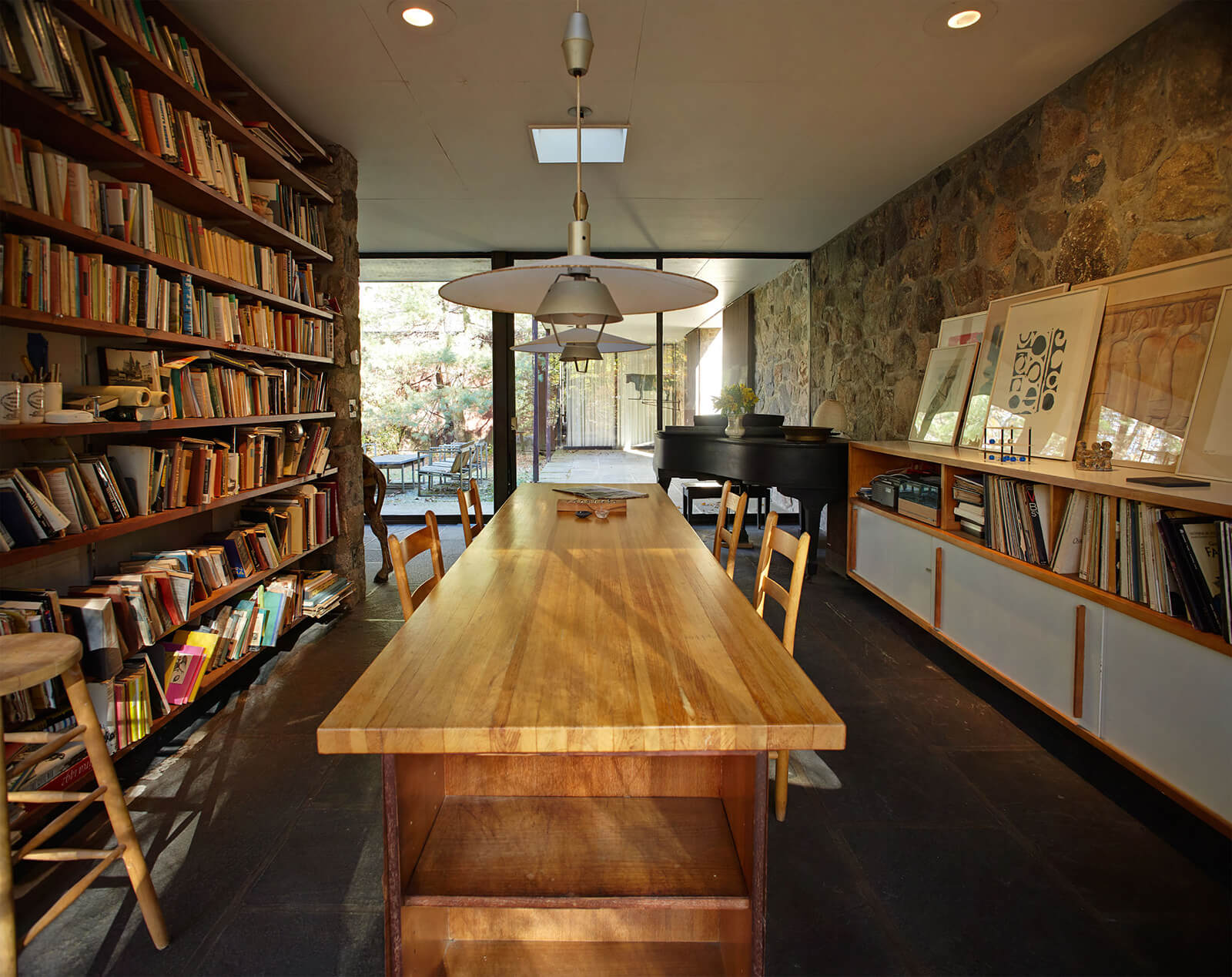 FN: To be in the house continued to be dramatic. The living room opens like a big screen porch; all the sliding panels open and in the summer the inside and outside essentially become undivided. We would always be outside. Then the house would become a part of nature. Another aspect is the simplicity of the design. There is a chimney, a few stone walls, and a bunch of sliding glass panels. That gives you the ubiquitous ability to do things with the interior which you can’t do when you have traditionally defined rooms. With the visual extension to the outside, the interior space feels so large that the furniture inside has to have a substantial weight to hold it.
