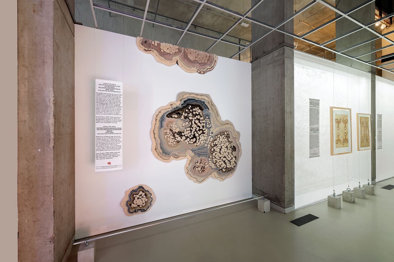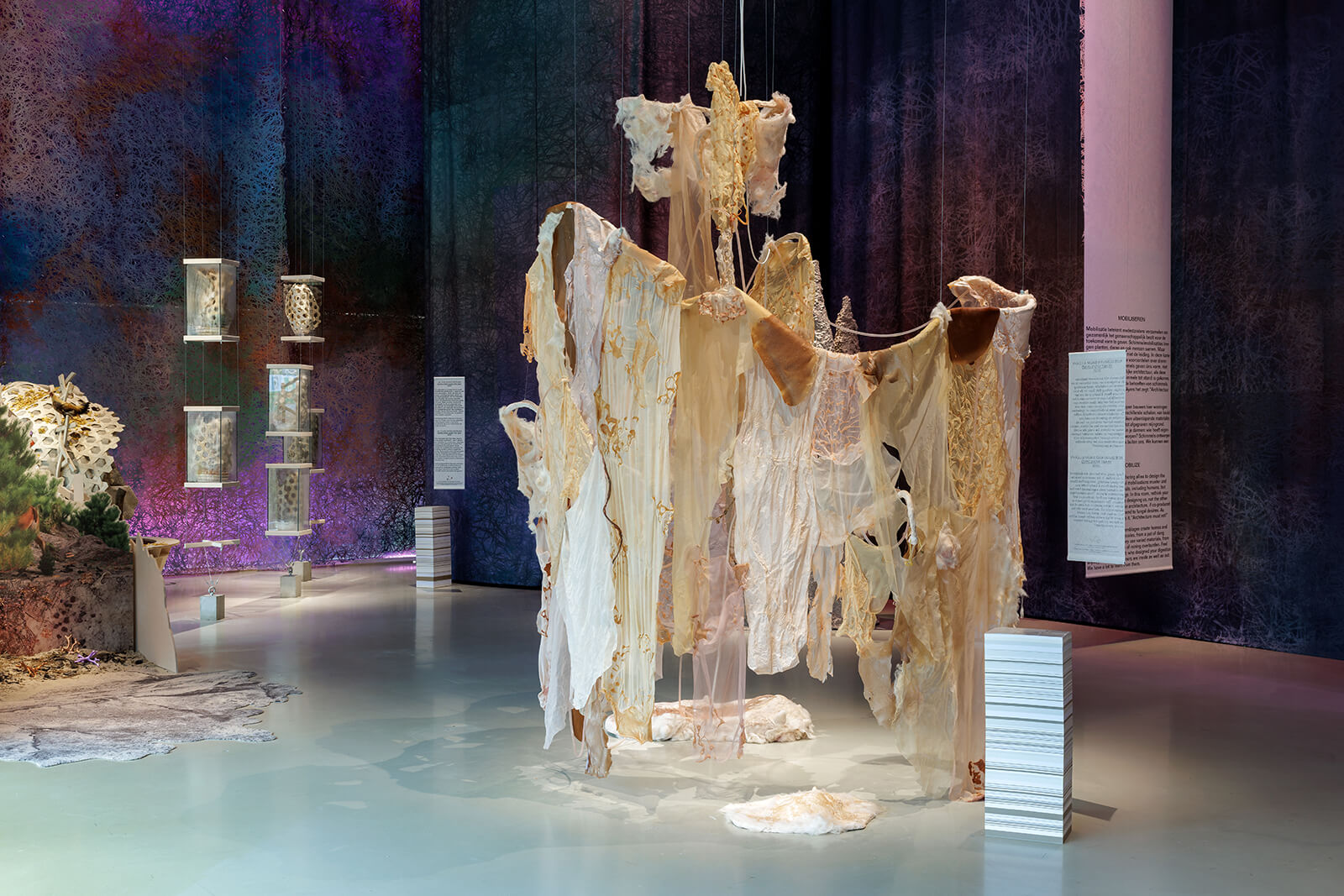 On the contrary, the next gallery, Mobilize, takes on a more optimistic note, showing how fungi and humans can co-exist. For instance, ecologist Rob Dunn and artist duo Baum and Leahy’s yeast worlding (2025) spotlights the productive, symbiotic yeast present in the human body. Taking on a more active role, in Danish architect Phil Ayres’ installation, Architecture must rot (Chair for Biohybrid Architecture, 2025), fungi become the primary participants in ecological design. Other artworks and projects on loan use the visual language of mycelium to turn Nieuwe Instituut’s staid, precise galleries into a teeming landscape. Live tree stumps taken over by fungi that will then nourish the forest floor remind us of the fragility of life, but also the vitality of co-existence; ‘redesigned’ archival documents demand that institutions such as the Rotterdam-based museum rethink what decay means for archival material. Rather than calling the work that fungi do in order to produce worlds an act of design, the curators term this performance anti-design. The results are open-ended, focusing on process rather than outcome, already a more forbearing lens with which to view installations/projects in a design museum.