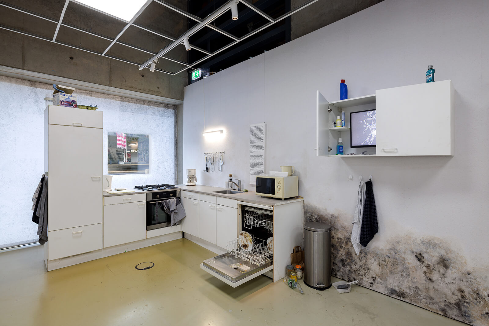 For the showcase, most artworks and installations on display were specifically created. Artists and designers collaborated with anthropologists, infectious disease specialists, ecologists and even amphibian experts to make obtuse scientific data and research intelligible to broader audiences. The exhibition is divided into separate sections, each one portraying the unruly protagonists of the show in different lights. In the first gallery, Break, it actually becomes an antagonist, attacking kitchens and hospitals, erupting in places it is not welcome, disrupting our best efforts towards ‘purity’. For instance, an installation by ecologists Ivette Perfecto and Zachary Hajian-Forooshani and the artist Filipp Groubnov maps the spread of coffee rust, prevalent in industrial, monocultural coffee plantations throughout Latin America.