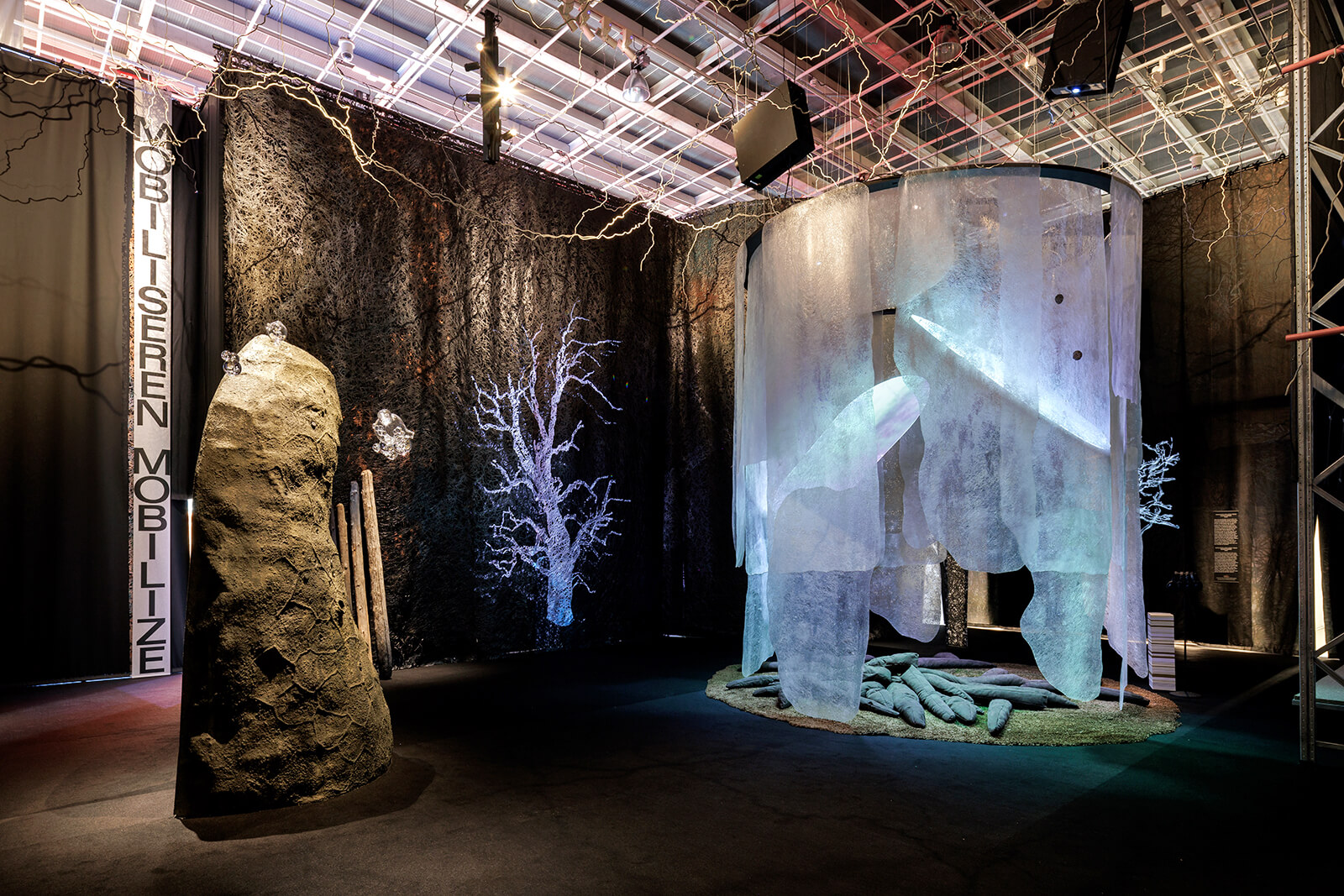 Similarly, the second gallery, Assassinate, tells the story of the deadly mycelium in the air, expounding that the will to purify, to sanitise and to simplify only leads to devastation, as witnessed in single crop plantations. For instance, in Of Boar and Fungi: A Nuclear Love Affair (2025), Bettina Stoetzer, Asa Sonjasdotter and Rotterdam-based art collective Berkveldt present a video installation depicting how radioactive matter from the 1986 Chernobyl disaster remained in circulation far longer than calculated, all because of boars hunting for truffles.