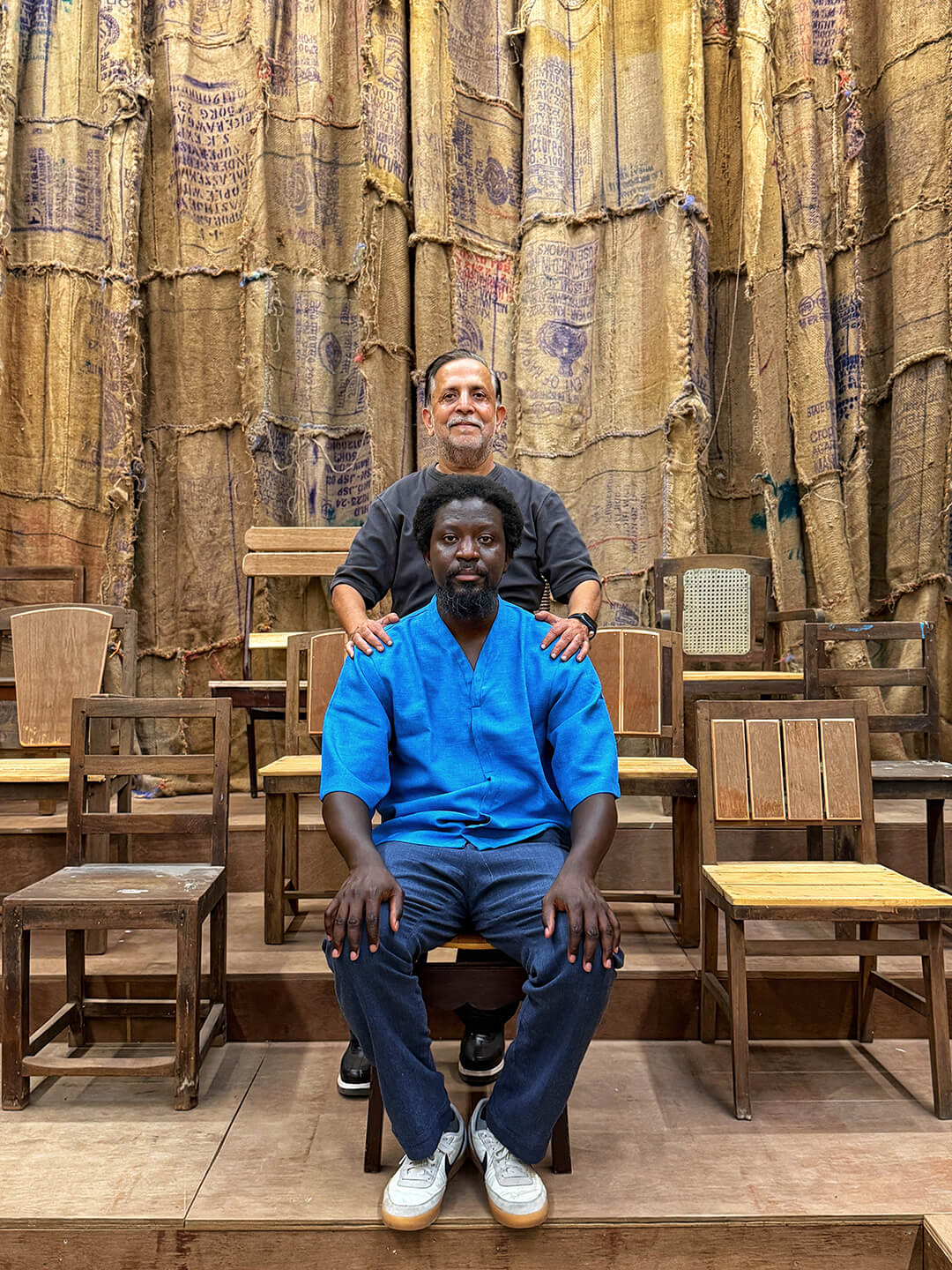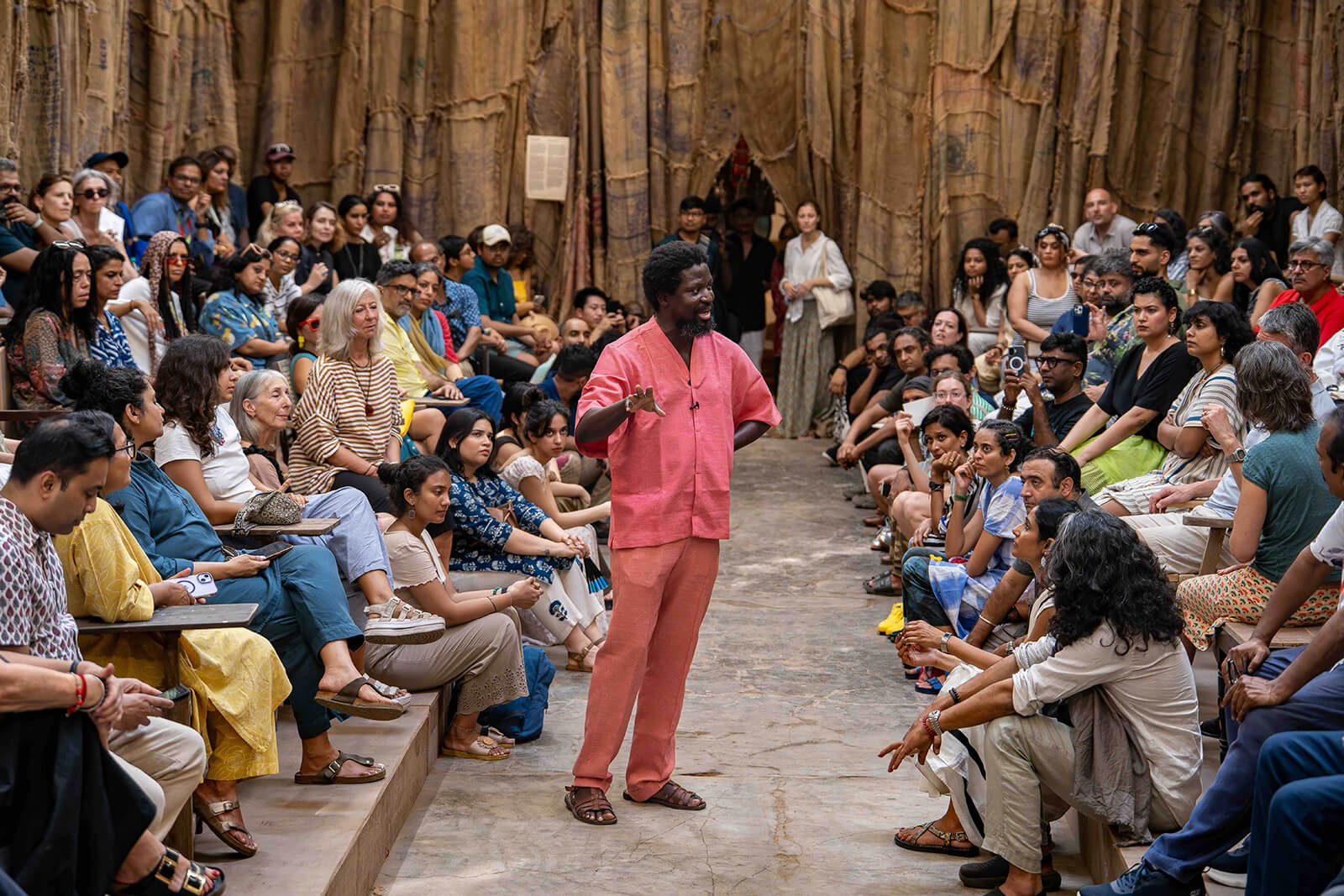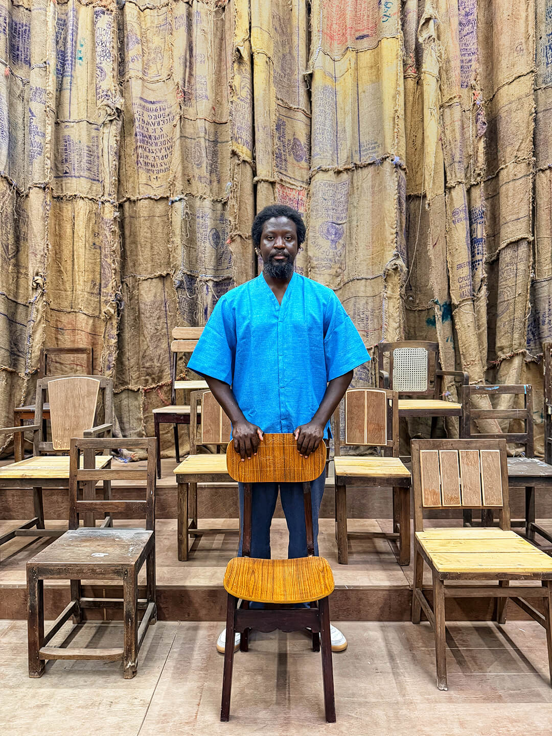 “We always imagine that when objects are old, and they've been used, charred, scarred, there are all these wounds within them, some repaired; we always think that they are at the end of their life cycle. But sometimes I like to think that that's when they actually begin to live,” says Ghanaian artist Ibrahim Mahama in a conversation with STIR about Parliament of Ghosts—his commission for the sixth edition of Kochi-Muziris Biennale, taking place in Kochi from December 12, 2025 – March 31, 2026. Used jute bags, marked with stamps, stains and rips, are sewn together to form the walls of the structure, which occupies a hall at the disused Anand Warehouse in Kochi’s historic mercantile Mattancherry ward. Chairs in varying states of use and disarray line the stepped hall, creating an installation that is simultaneously a venue, inviting people to interact with and use the structure as they wish.
