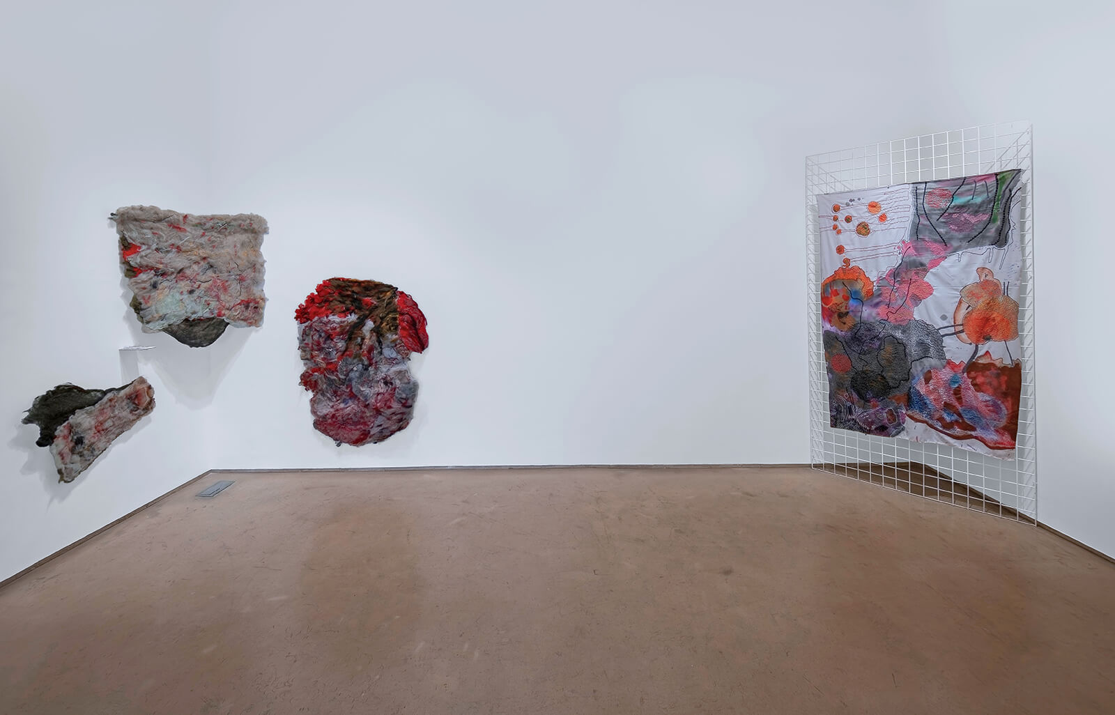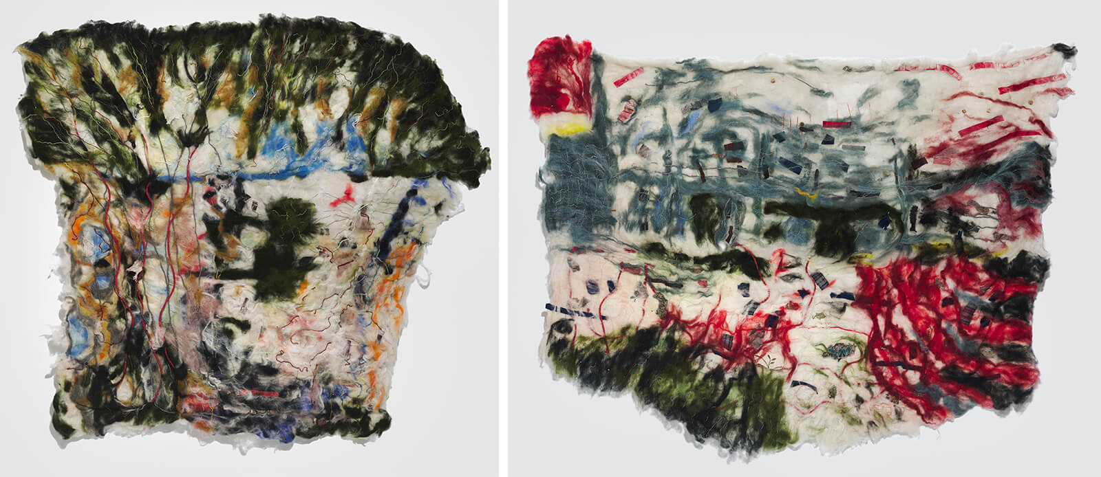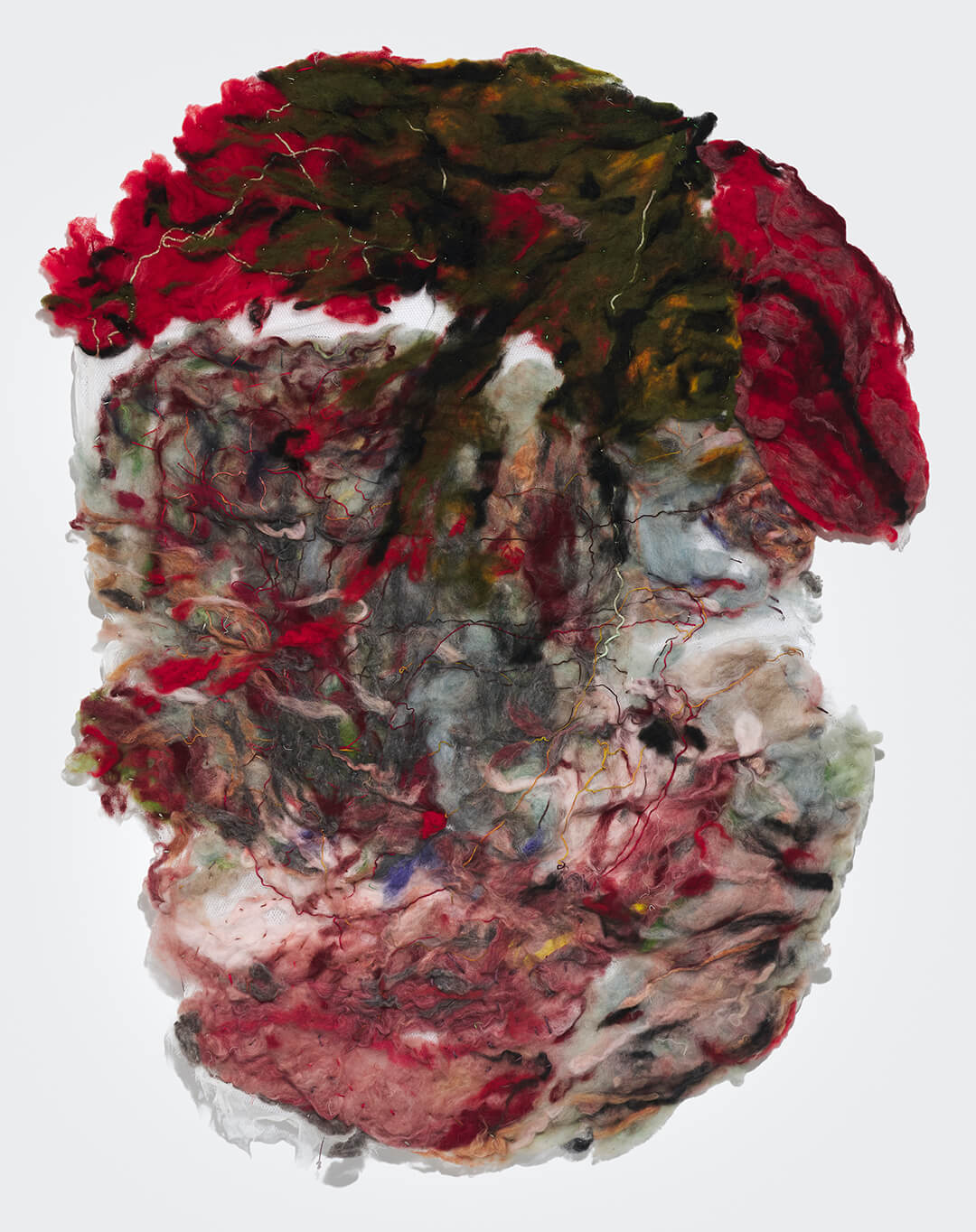 Sri Lankan artist T. Vinoja’s interest in textile practices can be traced back to her childhood – her mother is a seamstress. “When you are born, you are covered in fabric. Similarly, when you die. I see textile as the second skin of our body,” she said to STIR. Seeing wounded people during the war, the concept of skin became particularly significant for her, simulating a visceral transference of pain. This influences the material she works with – like felt – matted animal fur which she uses to map a landscape, highlighting every living being’s connection to the homeland – which takes a fatal form in works like Burning Home, depicting the immediate aftermath of an explosion, currently on view at her solo exhibition A Moving Cloak in Terrain at Experimenter’s Mumbai gallery in Colaba.