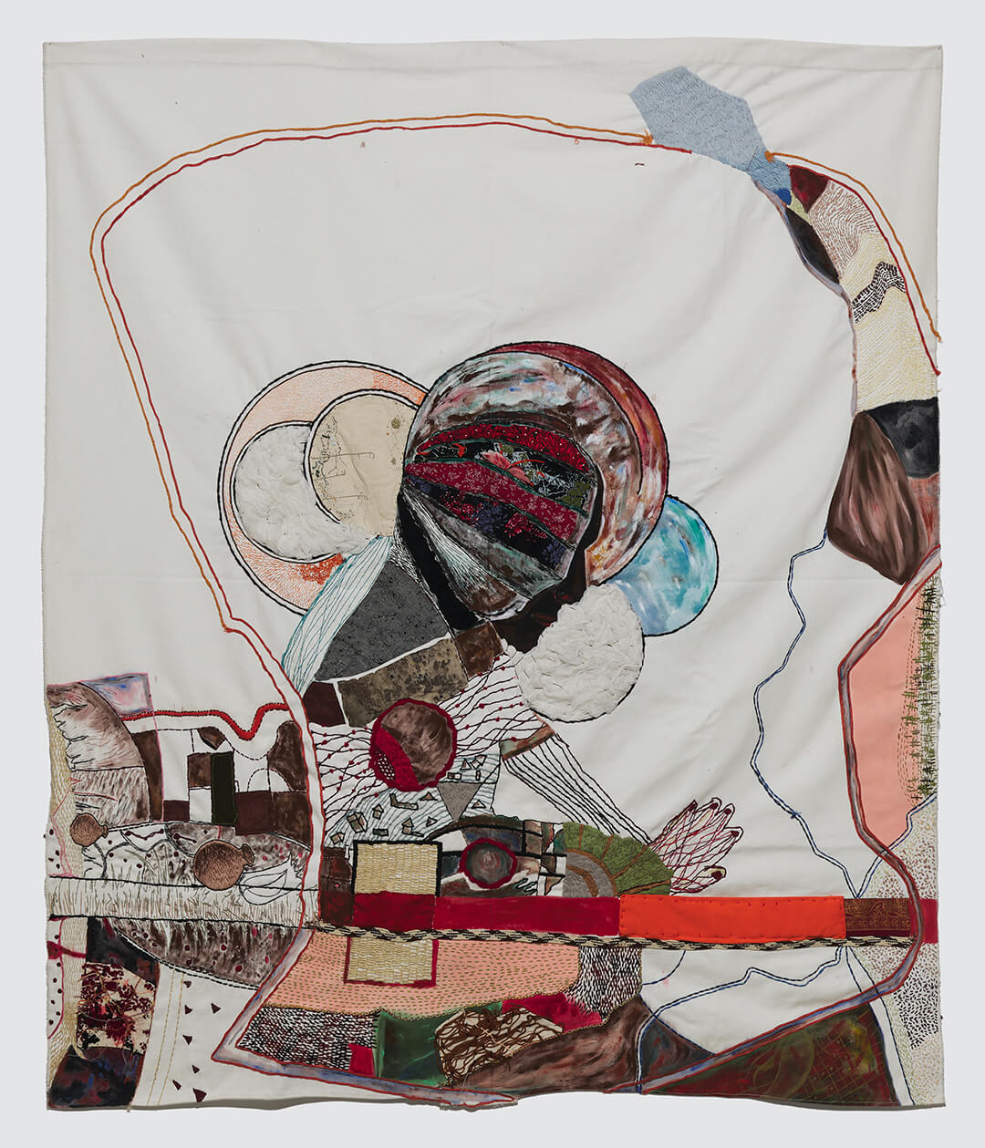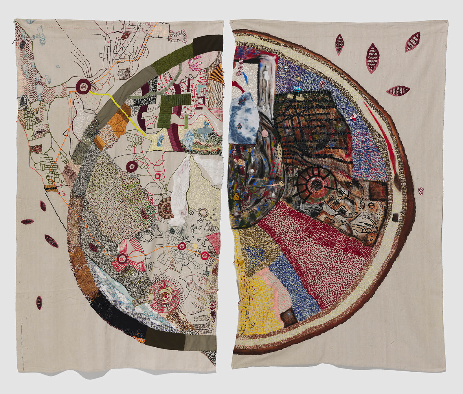 In an early textile self-portrait made three years into an undergraduate degree at the Department of Visual and Technological Art in Eastern University at Batticaloa, Vinoja’s work already evinced traces of the visual language she would continue to develop. Bunker & Me (2015) portrays a young girl waiting in an underground bunker, pondering, as the sounds of war reverberated around her. “Temporary shelters were made with saris and sarongs,” said Vinoja. “Even the wedding sari, which is preserved for life, was used by many to make bunkers. Then the injured would be covered with whatever fabrics were available at home. That’s why textile is so significant and such a powerful medium – although a marginalised one in contemporary times.”