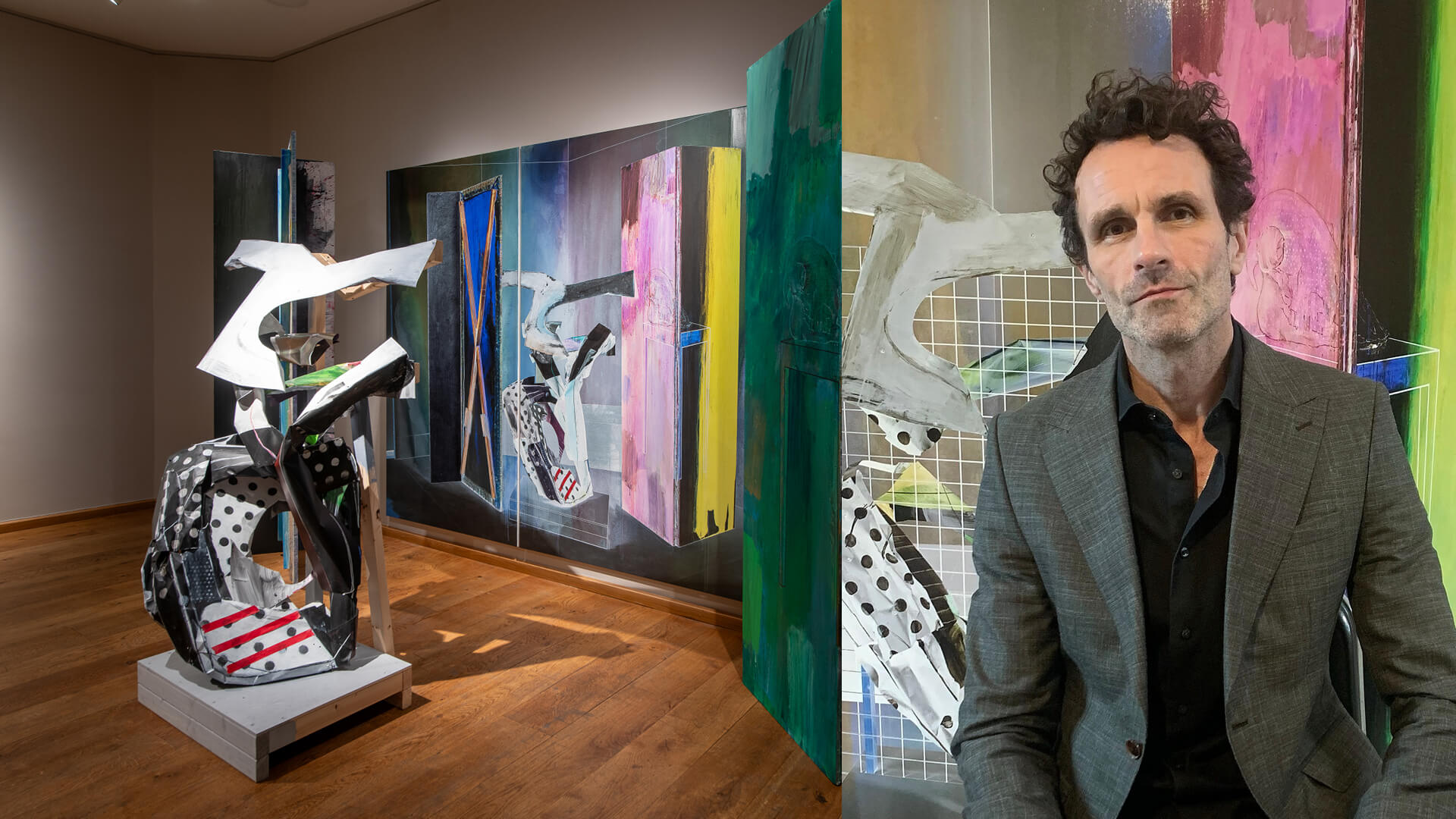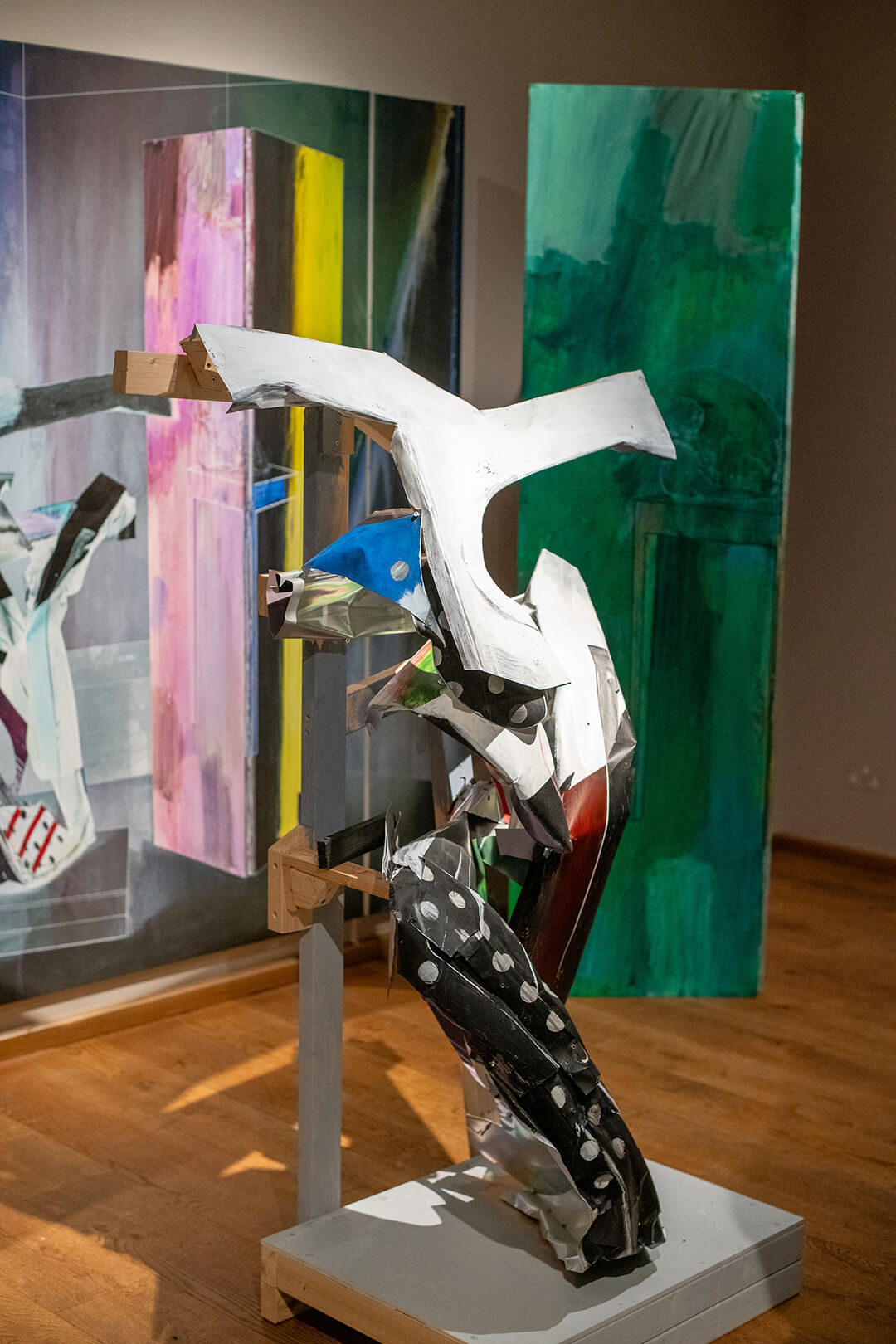 In this exhibition, for example, there are sculptures which are quite provisional. They’re good enough to play their part in the two-dimensional works, but they’re almost an illusion of themselves. They add a layer of language which is then reinterpreted and reiterated in the two-dimensional world.