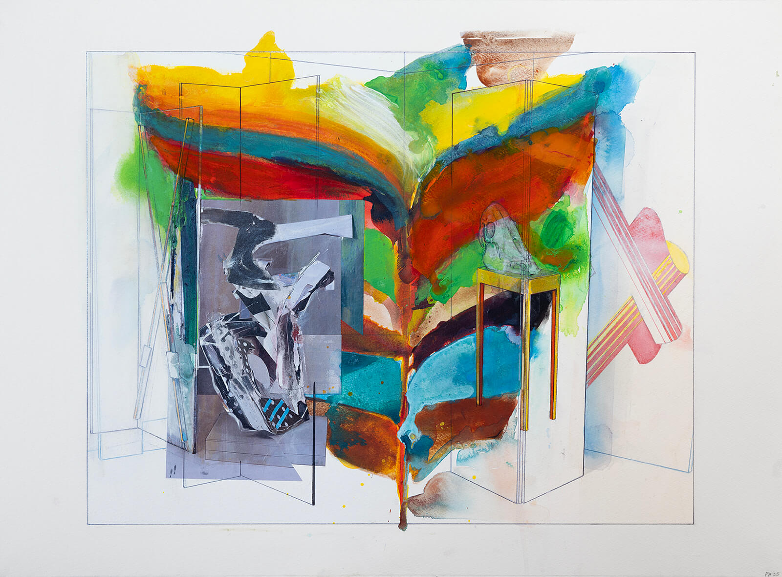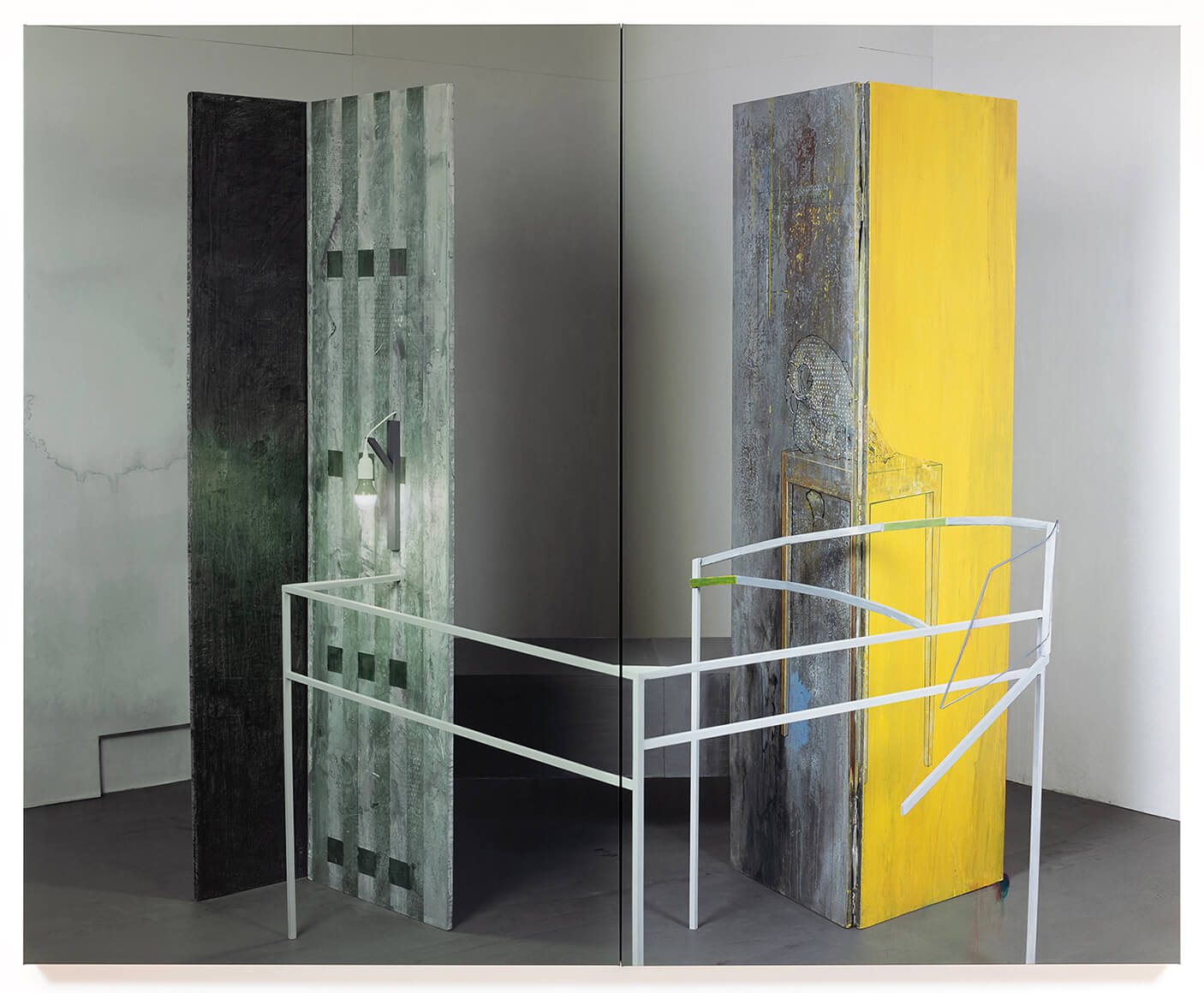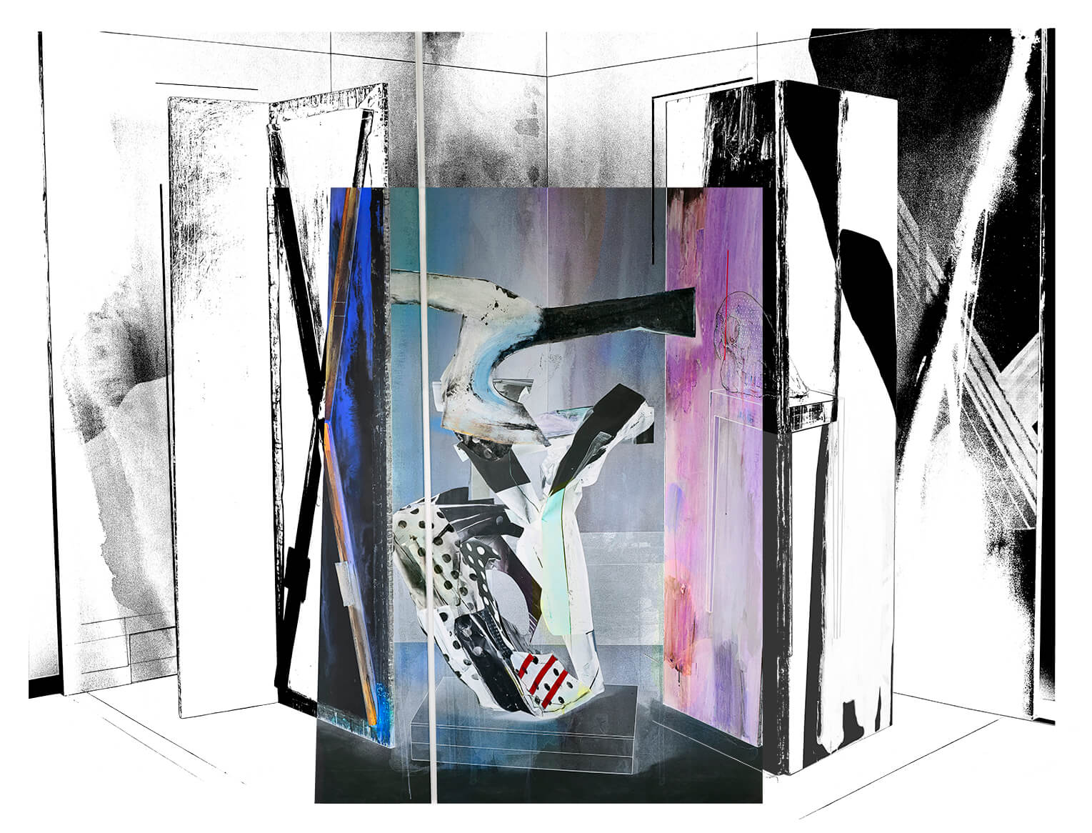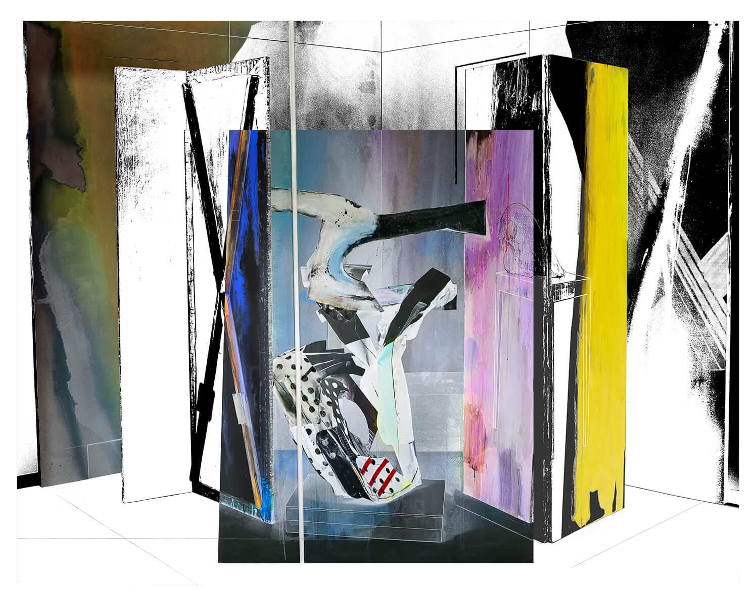 I move between photographically recorded information based upon three-dimensional architectural setups that are recorded through digital means and brought together with hand-applied painted marks and screen printing. This allows me to move between the analogue, mechanical and digital, allowing me to reference layers of art history and temporal making.