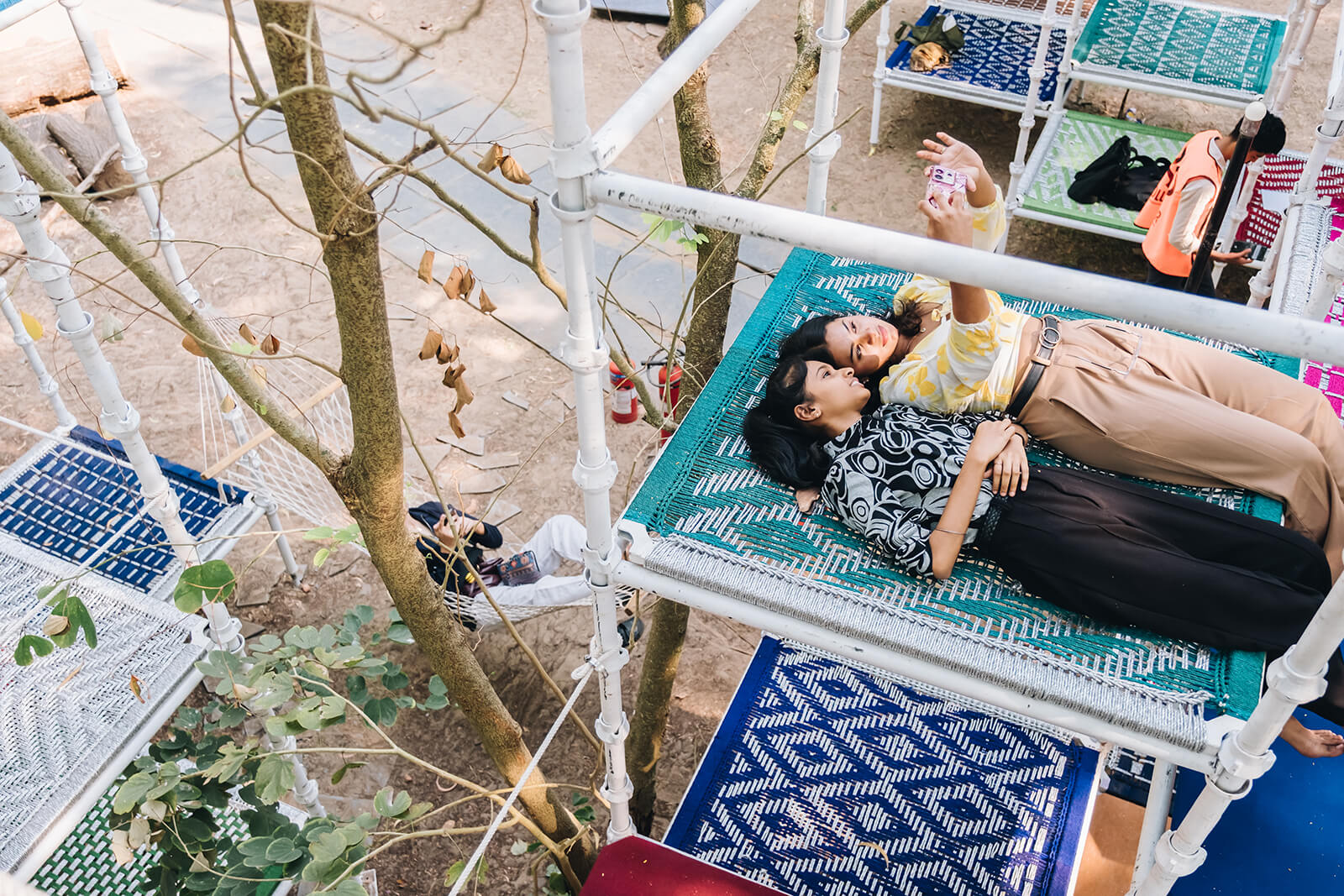 The Art Park also hosted a series of interactive installations, such as Monsoon Breeze, a functional bamboo and terracotta work that modelled sustainable traditional cooling techniques. Polish sculptor Tomasz Koclęga’s work, Suspensio Spiritualis, supported by the Polish Institute in India, featured a series of large, amorphous humanoid shapes, curling in on themselves in an expression of human fragility. During the day, children took rein, joining workshops that encouraged them to tell stories, craft, birdwatch, read and even slackline. A favourite, clearly, was the modular installation, The Changing Charpai, which saw visitors of all ages clambering, relaxing and navigating through a jungle-gym-esque structure constructed of charpais, resurrecting the communal spirit they once represented.