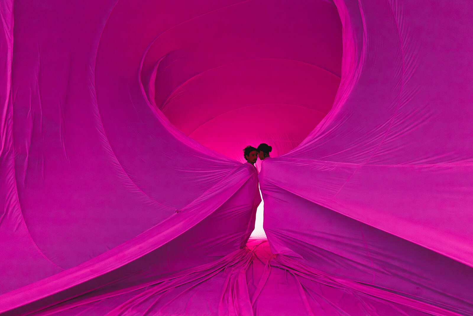 Multiplay 02: Soft Systems extended to the Portuguese-era Directorate of Accounts and was an attempt to create unconventional spaces for play, rest, care and intimacy. Doctor Bwanga, for instance, provided a rare moment of solitude, allowing viewers to enter a thatch-and-wood telephone booth and seek counsel from an AI model trained to serve as the ‘essence’ of Zambian artist Bwanga Kapumpa. Breathe, by Teja Gavankar, offered a meditative respite through a rocking chair connected to a thatched structure that came alive, syncing to the movements of seated visitors and becoming a collaborative lung. Multiplay’s high point was undoubtedly the contemporary dance piece You, Beauty by the Australian dance company Chunky Move, supported by Asia TOPA, Arts Centre Melbourne and Creative Australia. The surreal, dreamlike performance featured two contemporary dancers and a massive, amoebic inflatable that served as both prop and venue. The heaving, breathing and morphing of the structure and dancers modelled the dialogue of intimacy, dependence and manipulation that occurs over the course of a relationship.