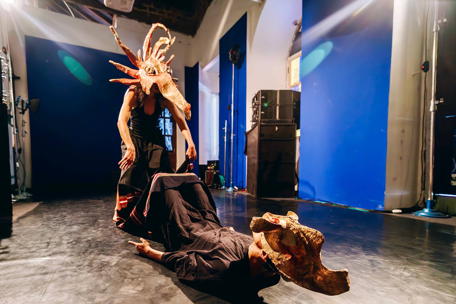 Performance was a cornerstone of the festival, with unconventional, visceral and confrontational programming making a strong argument for the benefits of experiencing art in person. Dread, confusion, happiness, submission, laughter and discomfort—unique performances skilfully drew out these emotions in their most concentrated forms for attendees who often sat only inches away from the performers. One such composition was Duty Free: Paradox of Platypus, performed by Joshua Sailo and Abhaydev Praful and curated by Ranjana Dave. The interactions between two performer-entities and their instruments (a hollow cello and a contorting body) heightened, before one dancer assumed the form of a creature, donning a long, gilded, insectlike mask. The animalic movements were mesmerising, and when accompanied by the audience’s guided vocalisations, they became an invitation to rethink movement, sound and their overly polite boundaries.