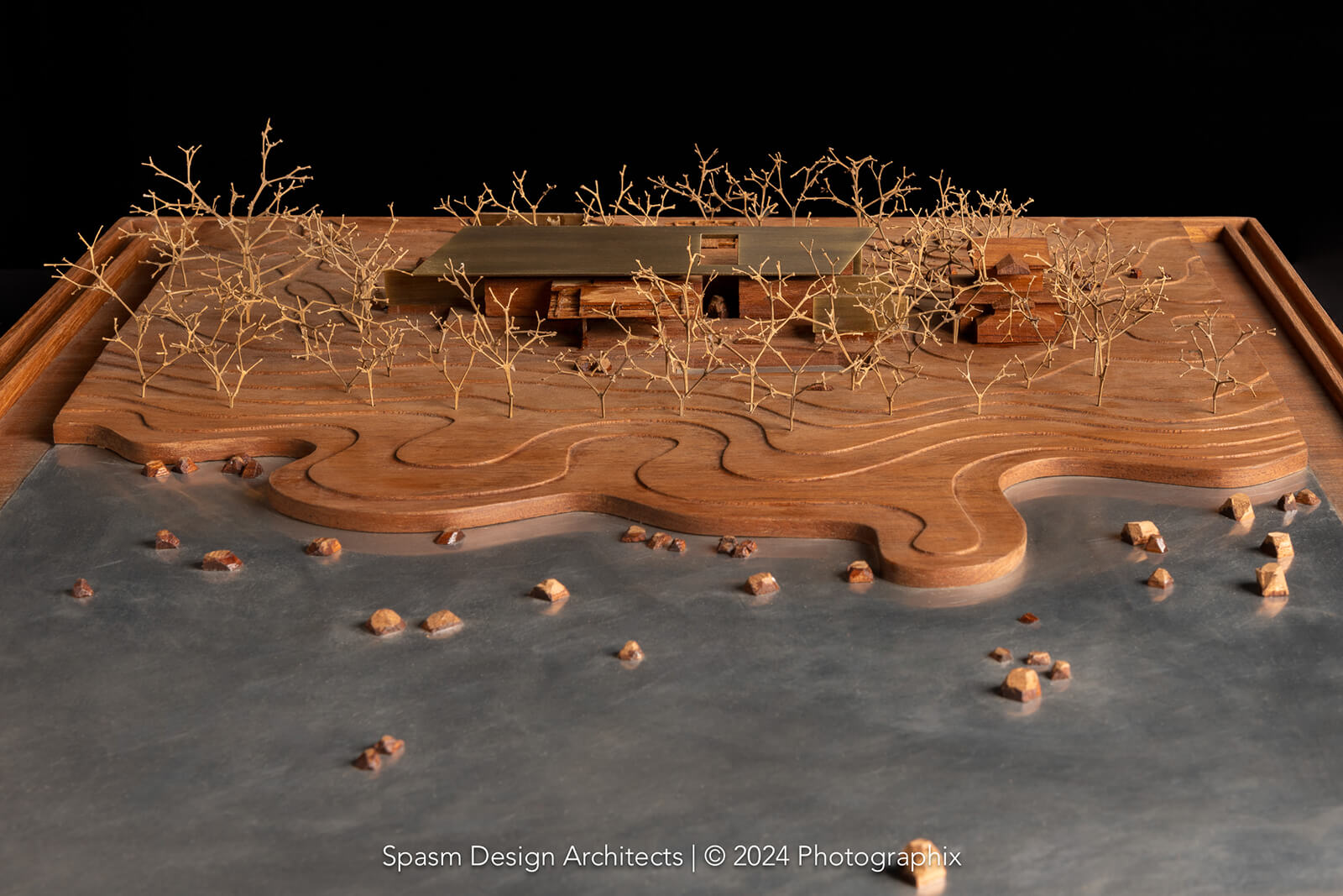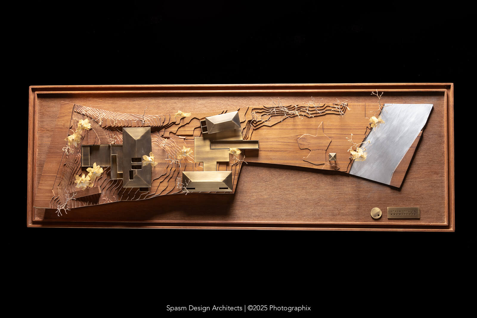 The architectural exhibition translated this diversity of work into a deliberately restrained spatial language. Conceived as a ‘wordless exhibit,’ Two Point Perspective avoided explanatory text altogether. Instead, thirty brass block models—each corresponding to a project—formed the core known as the ‘SPASM Island’, positioned centrally within the presentation, and surrounded by drawings, large-scale maquettes, short films and material mock-ups. The exhibition design itself was conceived as a ‘black box’, stripped of colour and visual noise, offering a neutral setting against which form, shadow and material could speak.