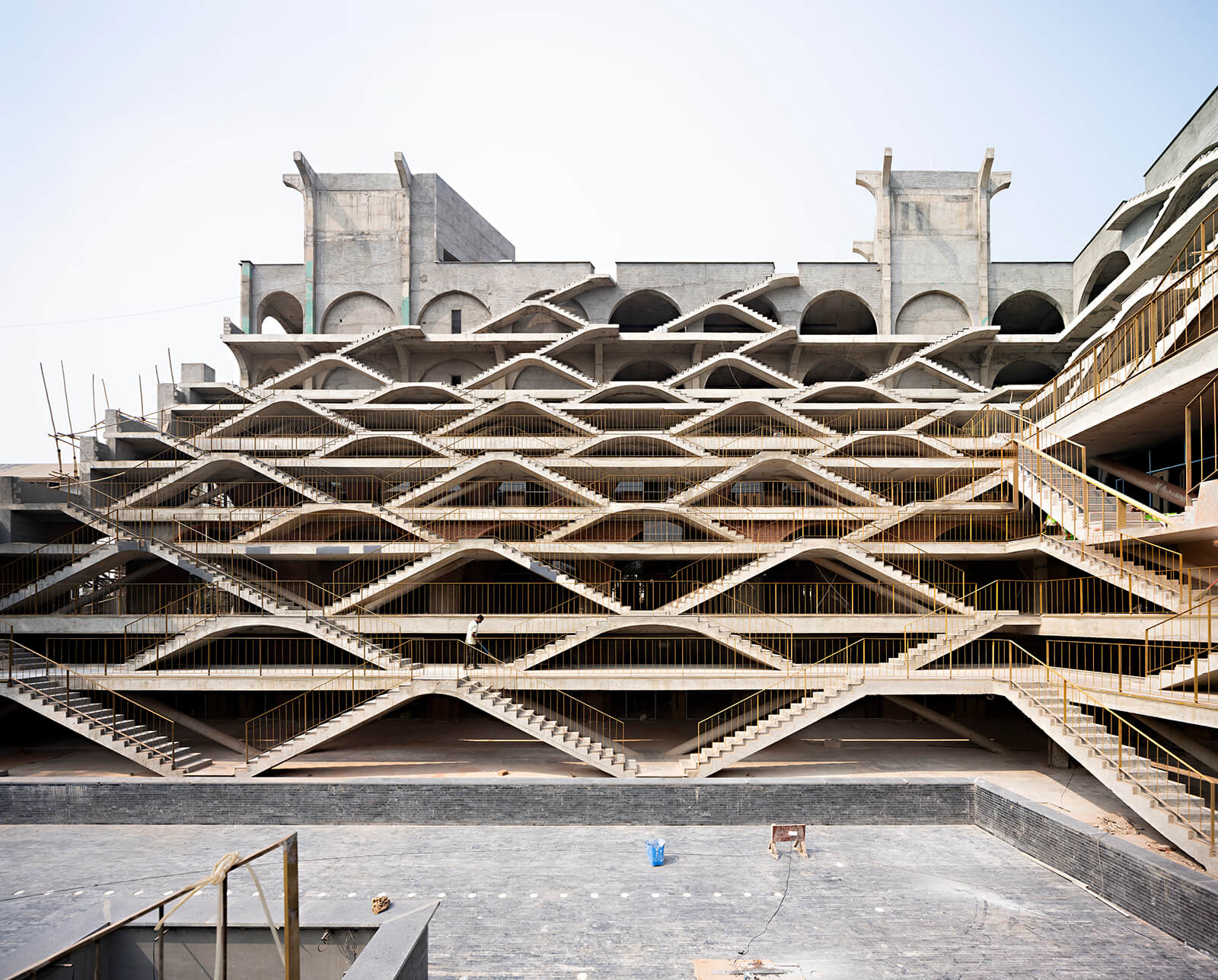 Designed by New Delhi-based Architects Collaborative, the Noida home is inspired by the traditional Rajasthani Kavad, featuring an array of three monolithic volumes.