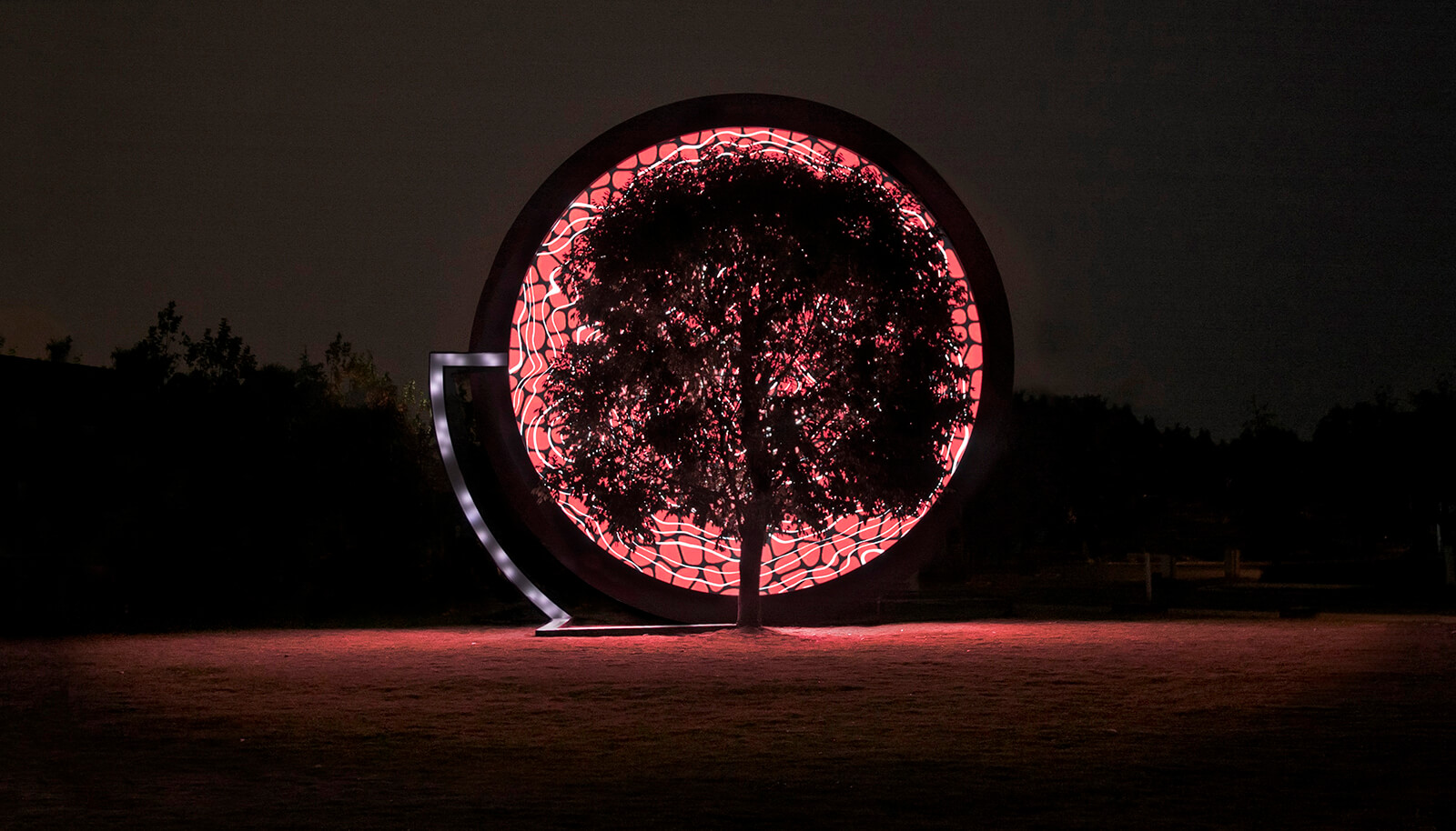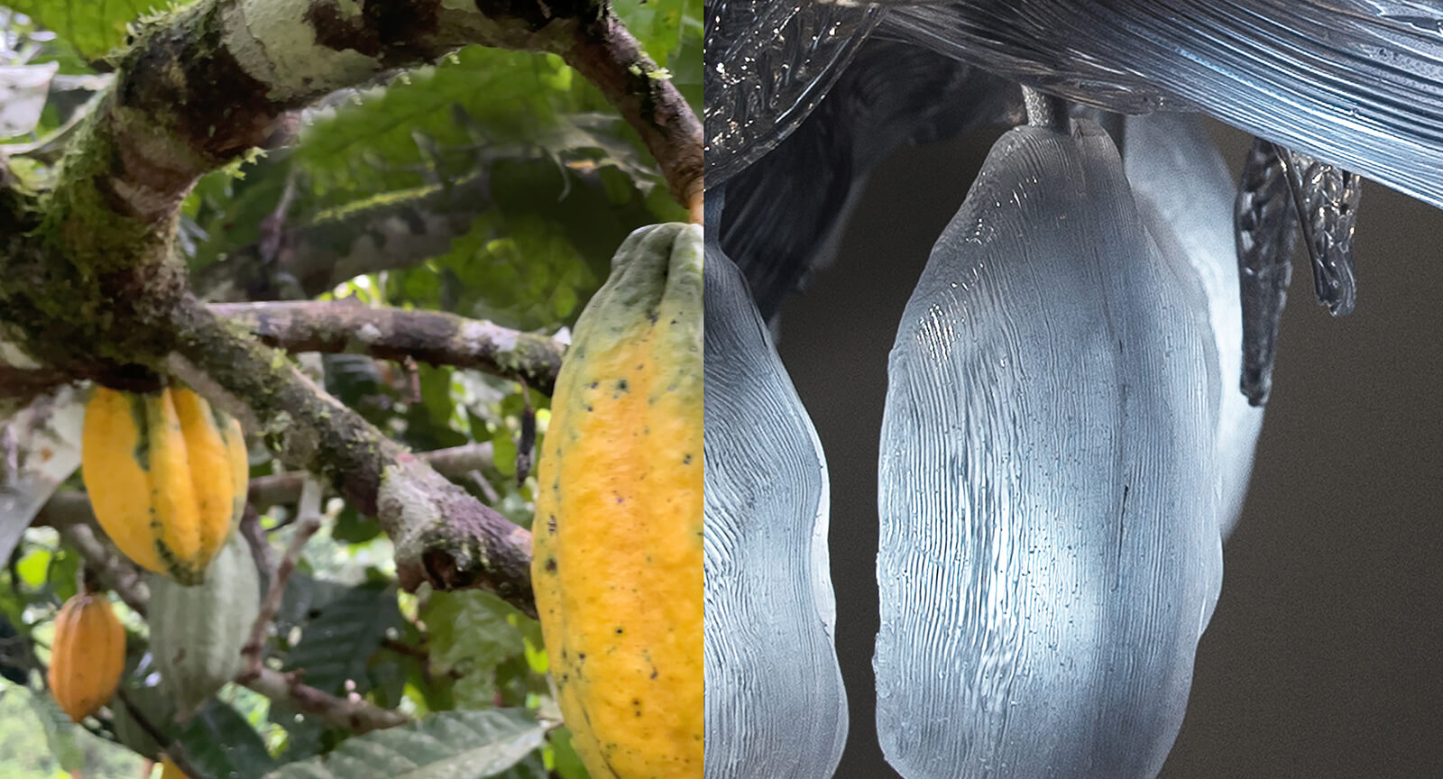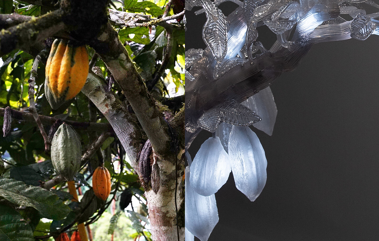 Another project, Econtinuum, developed in collaboration with plant neurobiologist Stefano Mancuso, uses sensors to capture data on tree communication – through metrics like CO₂, humidity, VOCs – as they share nutrients, send warning signals and learn from one another beneath the forest floor and, with the help of eco AI, mimics the electric and chemical chatter of trees. Most recently, Origin connects real-time environmental data from a cacao tree in Indonesia with its digital twin in China. By showing how it drinks, grows and breathes, turning data into movement, rhythm and light, the installation aims to expose how our food system is built on fragile connections.