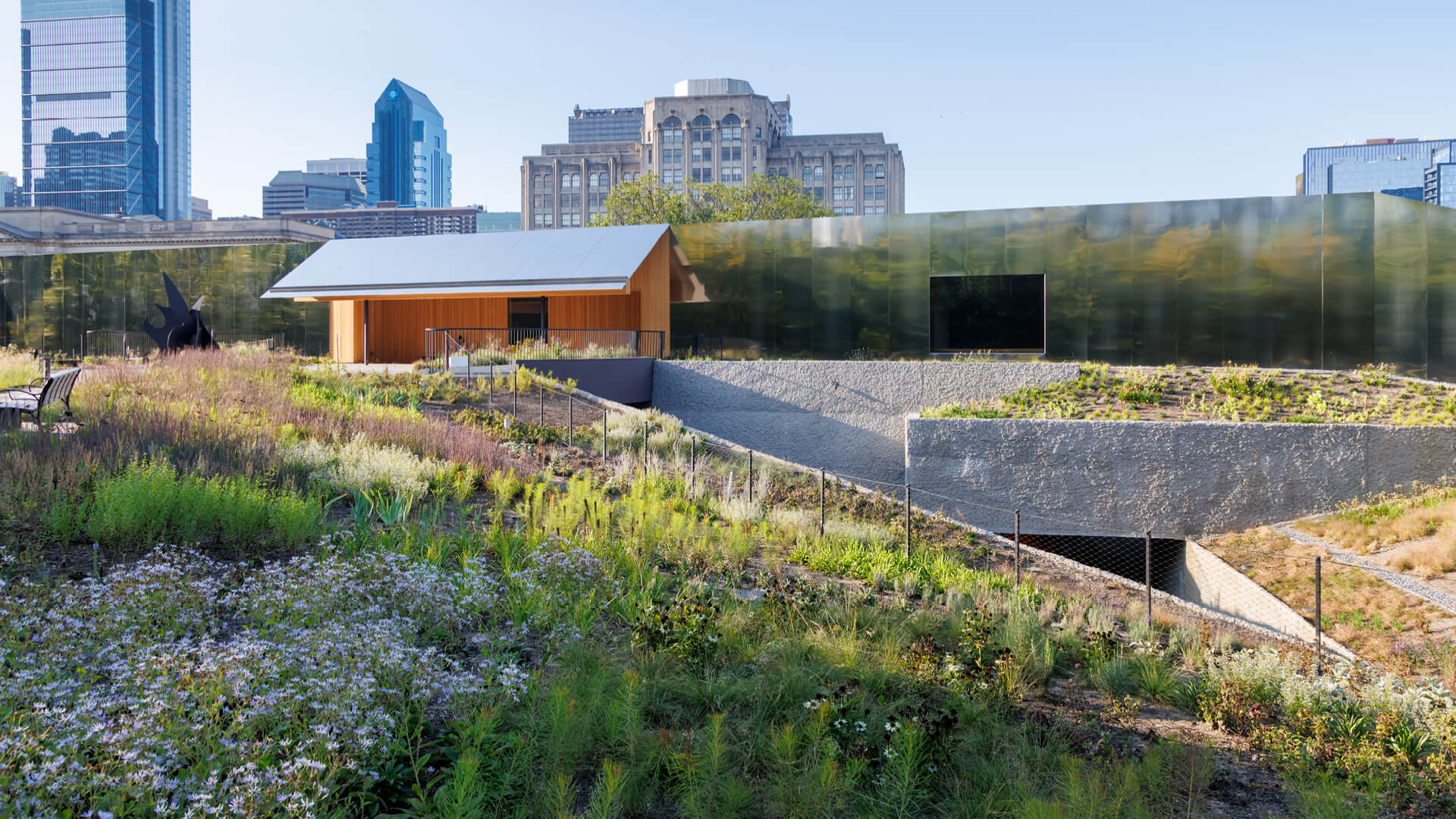 A long, reflective metal wall forms the project’s only architectural face from the Parkway, reducing the drone of the highway while creating a backdrop for a public meadow. The structure behind it—domestic in scale and quietly clad in blackened wood—resists the heroic gesture typical of museum entrances. Instead, the architecture reveals itself slowly. Below the surface lies an intricate sequence of galleries shaped around two sunken gardens: one is a circular pool of planted earth to the east, and the other is an angular Vestige Garden to the west—both bringing daylight deep into the building. From the mezzanine of the Highway Gallery, visitors catch glimpses of passing cars outside before descending through concrete-lined passages toward the open-plan galleries, where Calder’s mobiles and other sculptures unfold in shifting light and shadow. The building is not a container but a mediator between inside and outside, and between planted forms and metallic structures.
