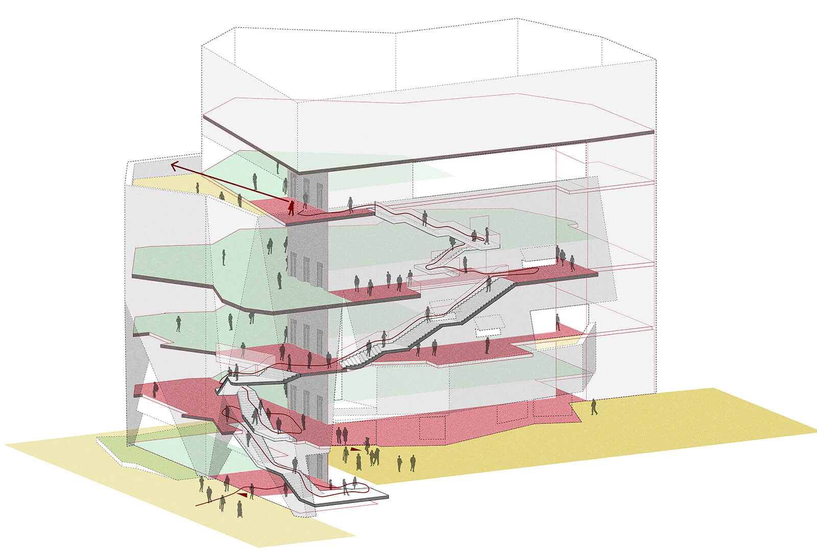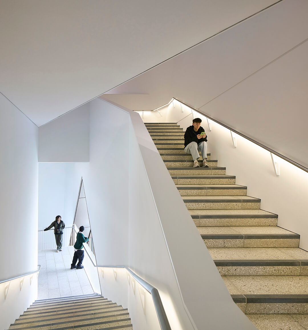 On a larger scale and in its spatial planning, these design choices go further: there are no bag checks or large desks to contend with when you enter from either entrance, and this continues through to the top of the building. As you move up through the levels, the stairs seem to move rhythmically with the visitor’s traversal too as they narrow and open up, beckoning curiosity; the soft lighting throughout complements this experience.