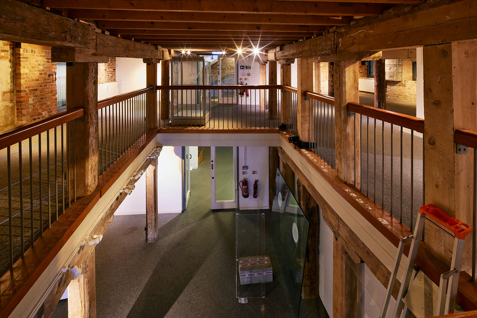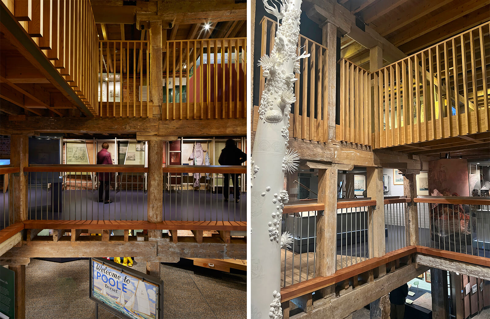 This central gallery space is distinctively representative of ZMMA’s transformation of the Poole Museum. The erstwhile grain warehouse, now Grade II listed, makes way for a three-storey-high void in the middle, making the experience of going around remarkably more open, while at the same time quite intimate, without a sense of overcrowding guided by the circumambulation around this hollowed-out space. Even with the added verticality, a sizeable part of the original timber framework has been retained after careful restoration, bringing to life ‘the warehouse’s evocative ship-like timber framework’. With the age of the timber columns and many of the structural details visible, the vertical expansion is pronounced, making the architecture intuitively a part of the museum’s historic displays.