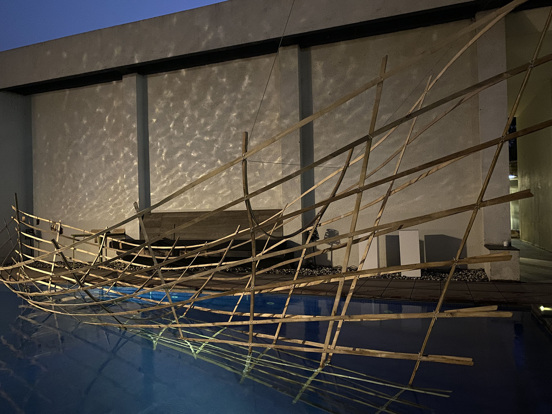 The idea of the passage of time, movement and change as a pattern is what we connect through the boat as a symbol of travel across time and place. Made by hand with bamboo, it is but a structure of a dream in its bare bones of construction.