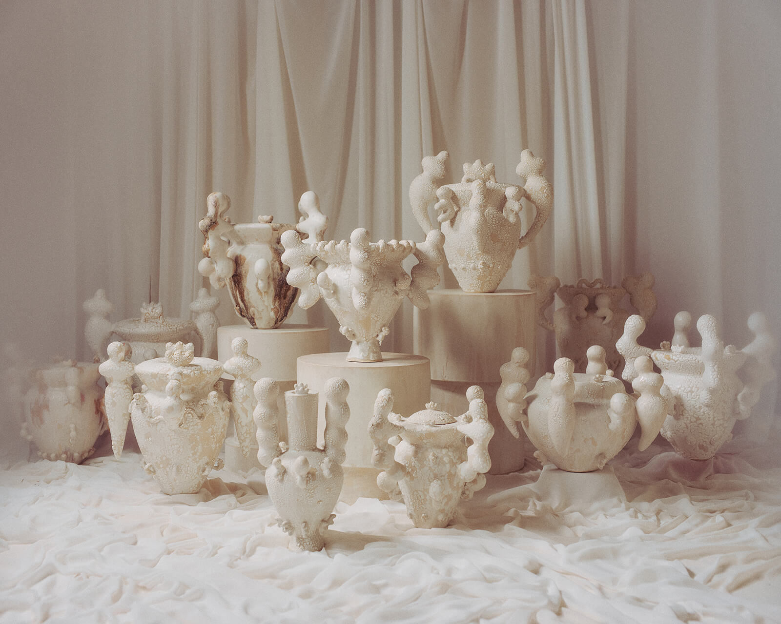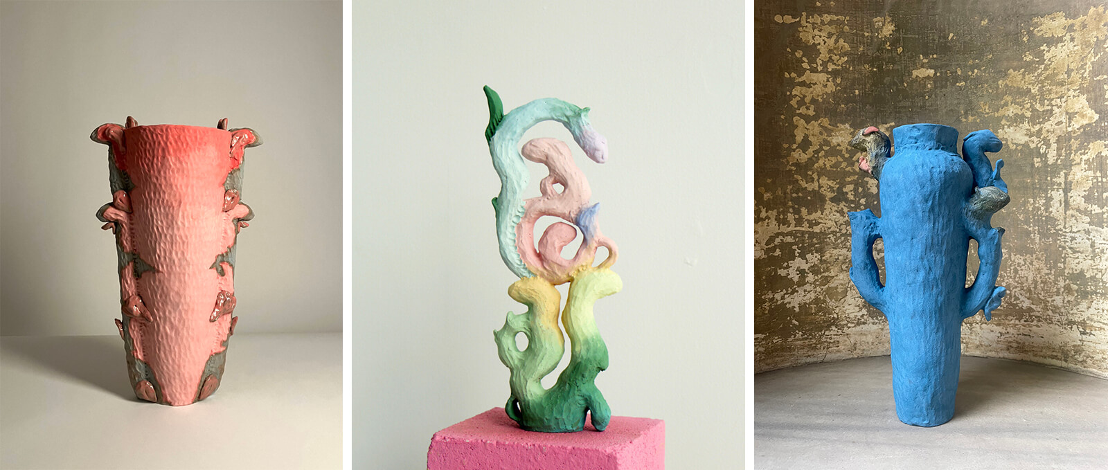 Several exhibitions and installations produced by 5VIE collectively translate the abstract notion of ‘qualia’ into spatial, tactile and performative encounters, where objects are no longer inert artefacts but active mediators of perception and emotion. For instance, SWING Design Gallery presents Cosmic Meadow by Australian ceramic artist Elizabeth Lewis. The vibrant handcrafted vases draw on ancient animal sculptures and mythological architecture, resulting in their obscure, biomorphic forms. Japanese artist and a mother of four, Noe Kuremoto, presents an installation, JŌMON: A Mother’s Anthem, curated by Berlin-based independent writer, editor and curator Anna Carnick. Paying homage to the ferocious, hopeful and complex qualities of motherhood, the showcase features stone vessels symbolic of endurance, remembrance and transformation. The contemporary interpretations of some of the most ancient forms of pottery, dating back to the Jōmon period (circa 14,000 – 300 BCE), evoke the feeling of ancient Japanese talismanic figures.