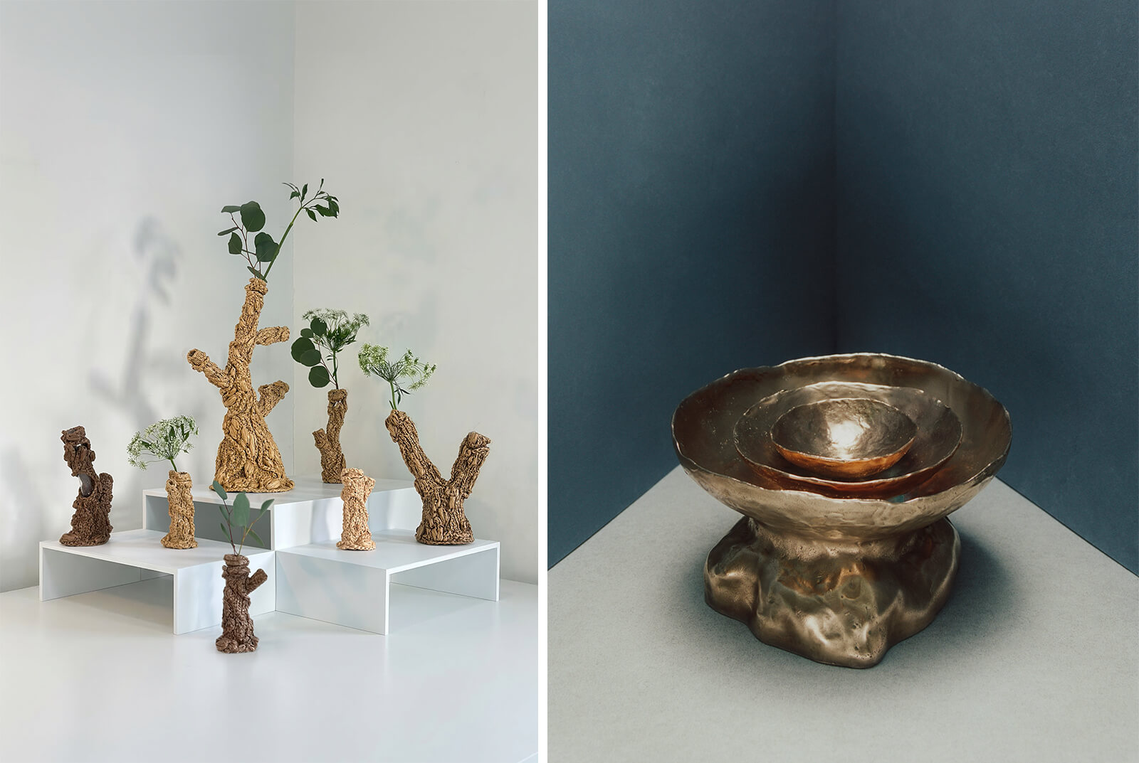Seoul and Milan-based designer Ji-youn Woo presents two bodies of work—Renascor and Vertical Garden—brought together under the concept A Structured Garden. First introduced at Edit Napoli 2024 and later expanded during Milan Design Week 2025, Renascor explores organic growth through tactile materials and fluid, sculptural forms. In contrast, Vertical Garden approaches nature as a system, using modular metal structures to translate botanical expansion into a precise structural language. Together, the works interpret the evolution of natural ecosystems as part of everyday environments. Milan-based designer Giuditta Vettese presents a bronze sculpture, La Fiamma che non Brucia (The Flame That Does Not Burn), in the form of a ‘domestic altar,’ that carries water. The sculpture is accompanied by a performative interaction that oscillates between body and sound, portraying a series of gestures as ritual. Collectively, through these gestures, Vettese implores visitors to look at energy as something that can transform into matter and simultaneously transcend beyond it.