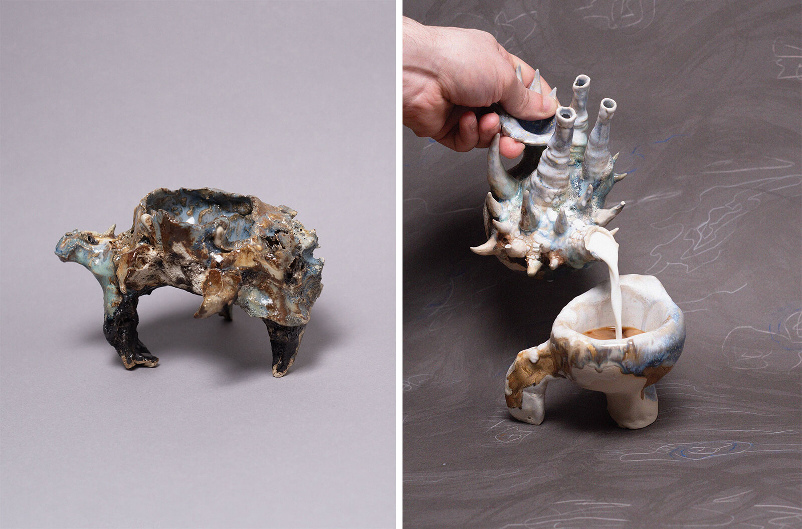 French association Hauts Reliefs presents six pieces of 18th and 19th-century furniture designs transformed by contemporary designers and artisans. The display includes a Louis XVI (1754 – 1793) coiffeuse turned into a bar cabinet and a reinvented 19th-century games table, forwarding the conversation on upcycled design. Transforming routine actions into rituals, Liquid Rituals is set to be presented by a ceramic research and production studio of the same name, whereby two independent Italian designers—Giulia Braglia and Gabriele Nasole—work between the Netherlands and Italy. The ceramic objects fuse function, material intelligence and artistic legacy through fluid geometries that paint a dreamscape through forms.