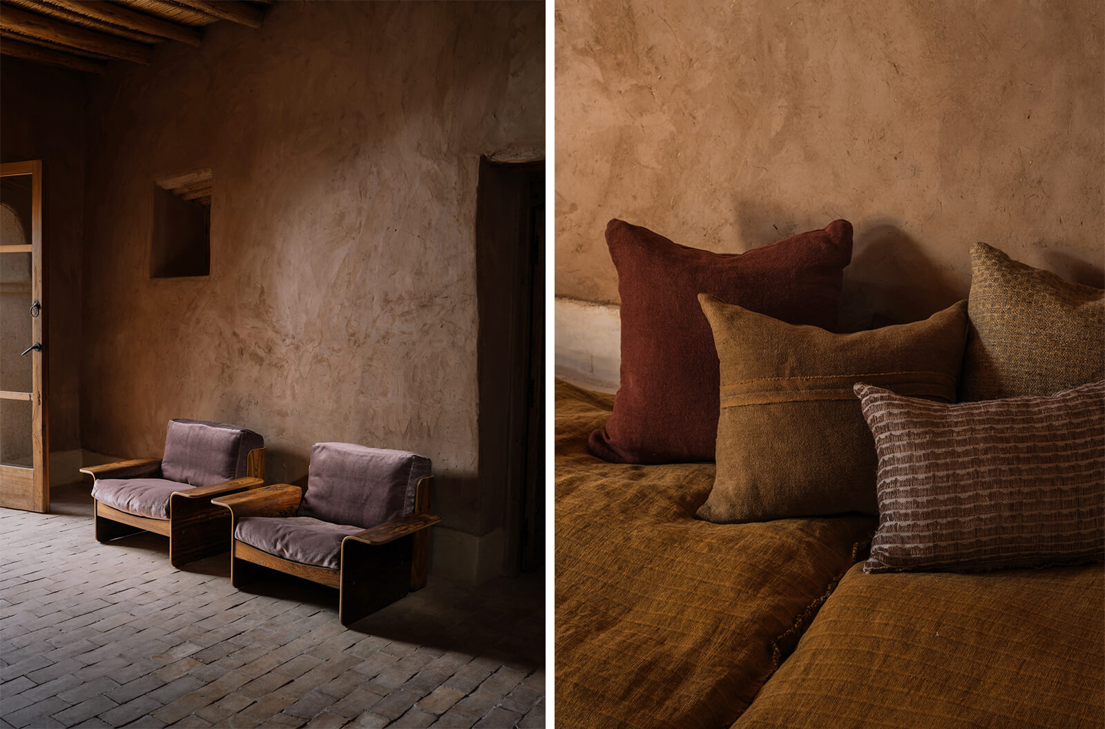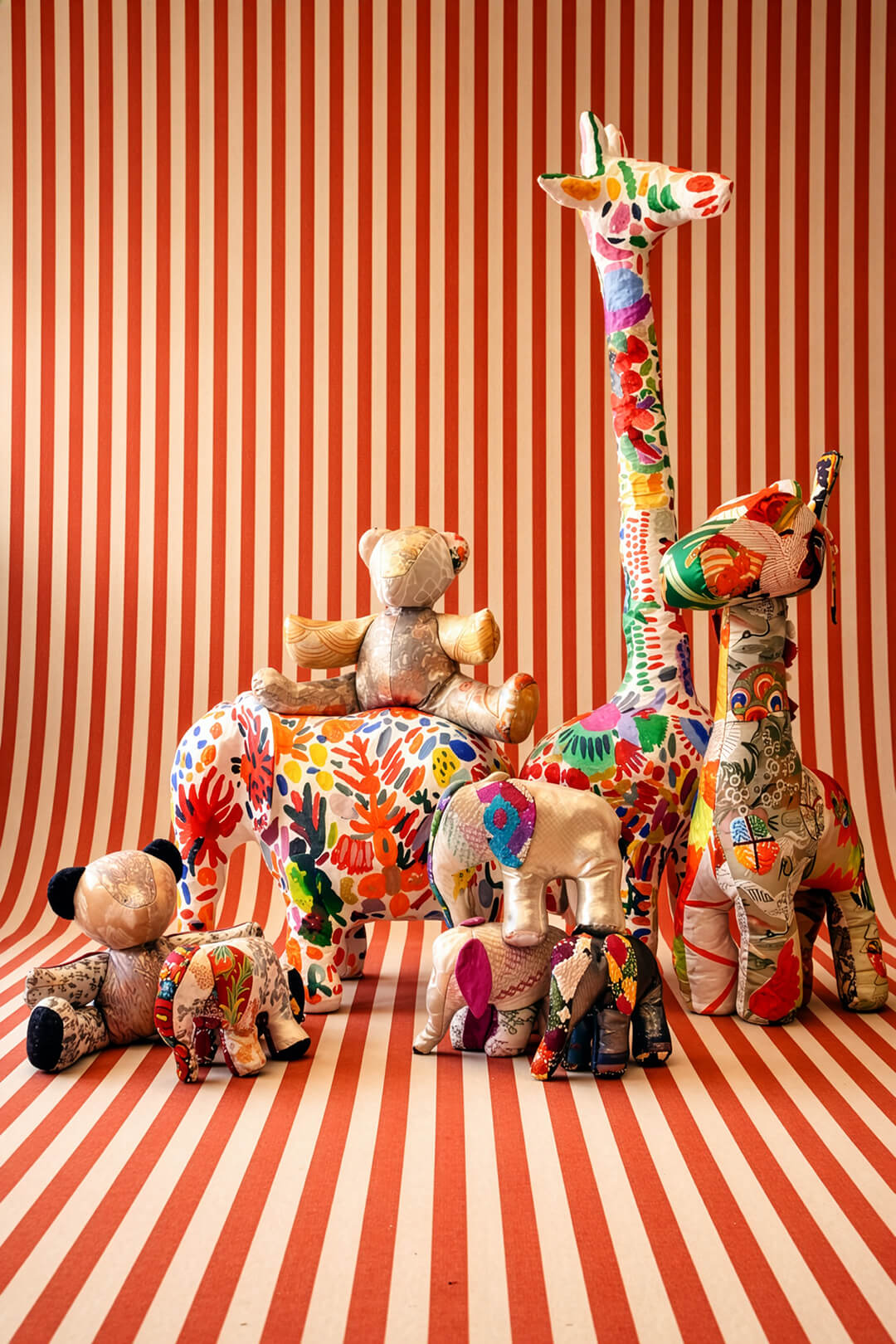 Azimuth by Belgian textile company Designs of the Times centres texture, tactility and storytelling through fabrics such as mohair velvet and hemp’s raw green. Handcrafted fabrics give rise to irregularities, catering to both the visual and tactile senses, featuring colours such as desert sand, clay whites, burgundy and olive. Elsewhere, CABINET OF CREATURES, a showcase by luxury label RIANNA + NINA, features pieces made of rare vintage and archival textiles that have been sourced from around the world, including remnants of their own production process. Through research and cultural sensitivity, the brand uses shapes, textures and patterns to form playful and curious creatures full of life.