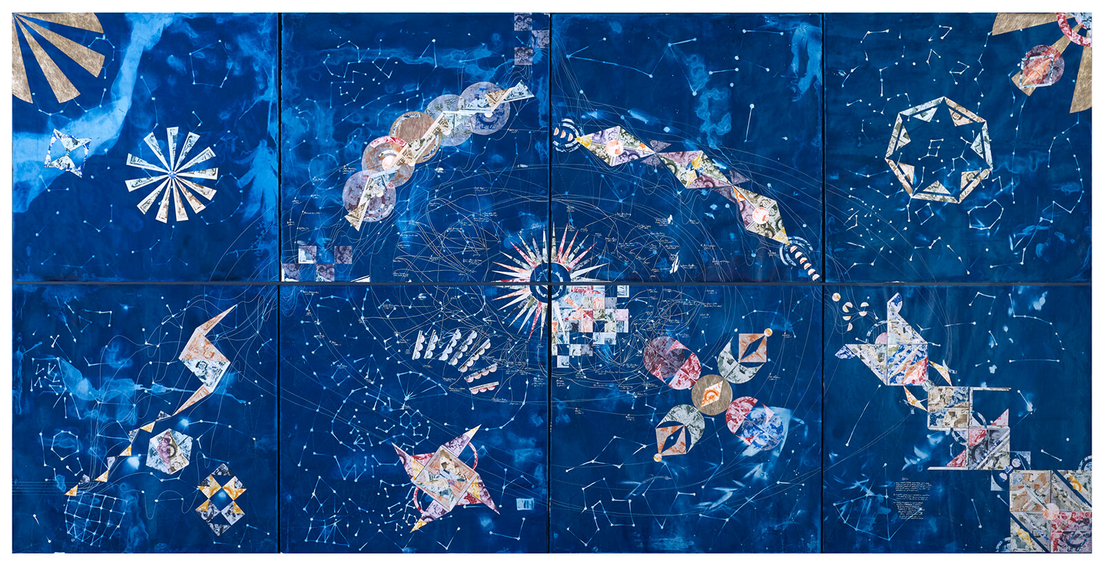 This ‘ghost structure’ is evident in Chinese-American multimedia artist Connie Zheng’s work As It Is: Nothing Lasts Forever (2025). Commissioned for this exhibition, the artwork uses collage and layering to trace the transmutation of natural materials (like tea, rubber and minerals) into commodities, driving the twin engines of colonialism and extractive capitalism. Reimagined imperial currency notes and cartographic lines tracing resources and labour over land and time are contrasted with the artwork’s background—a composite cyanotype depicting 13th century Chinese star maps and shadows of plants from Zheng’s mother’s garden. Through this juxtaposition, Zheng foregrounds the impermanence and ephemerality of capitalist expansion and its financial machinery while simultaneously tracing its history.