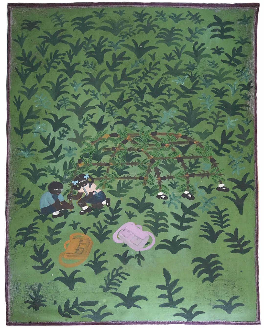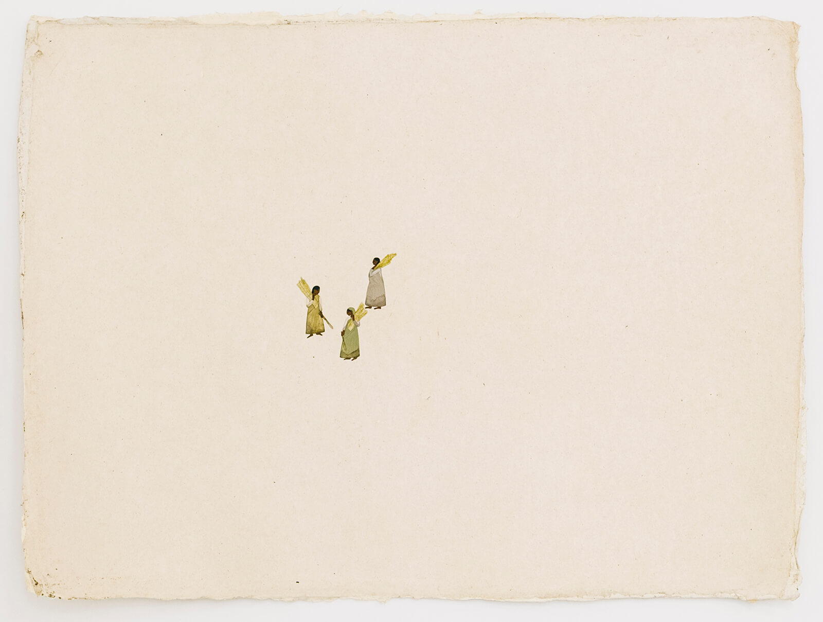 The Plantation Plot moves fluidly between analysis of the plantation system and closer, more personal windows into the lives of labourers. Indo-Caribbean artist Kelly Sinnapah Mary’s acrylic on tapestry work, Notebook 10, l‘enfance de sanbras (The Childhood of Sanbras) (2021), for example, is part of a series focused on the artist’s heritage as a descendant of Indian labourers sent to work on French-owned plantations in Guadeloupe, an overseas region of France, in the 19th century. This weighty history is seen through the eyes of a little girl—Sanbras—encountering the memories, culture and community of the artist and her ancestors. In a similar vein, And words were whispered (2019) by Sancintya Mohini Simpson depicts the lived experiences of Indian women working on tea and sugarcane plantations in late 19th century South Africa using watercolour and gouache on handmade wasli paper. The series highlights the inner lives of these women by depicting moments of quiet and community. The vast negative space surrounding the small figures depicts the plantation setting through its absence. Simpson is thus able to restructure the historical narrative of colonialism, foregrounding the lives and subjecthood of labourers while the plantation, its owners and their violence are relegated to the background.