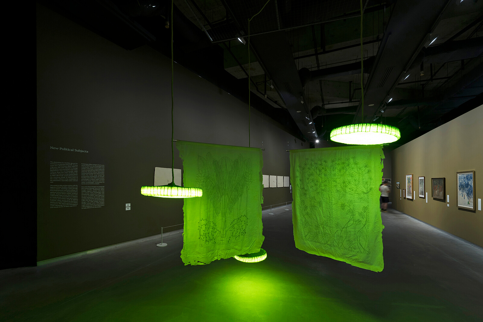 The Women (1950s), an oil painting by Malaysian modern artist Yong Mun Sen, differs from these works aesthetically despite being united in theme. The golden-hued painting shows two female labourers, set against vast fields stretching into the horizon; it draws its influence from the Western canon—particularly post-Impressionist paintings by artists like Vincent van Gogh. Although this might seem like a counterintuitive choice for an ostensibly anti-colonial artwork, unlike many pastoral Western paintings, which are often divorced from the reality of hard manual labour, Mun Sen’s work is based on his experience as a farmer during the Japanese occupation of Malaysia during the Second World War. Additionally, the post-Impressionists were themselves influenced by Japanese art. Similarly, the artworks from the series Belle Époque of the Tropics (2021), by the Brazilian artist Noara Quintana, create a suspended sitting room from lamps and tapestries made using latex (a product of Amazonian rubber plantations), silk organza, acrylic paint, cotton, graphite, resin, metal and LED light. She blends the Art Nouveau aesthetic of European colonists (which lives on in Brazil's architecture) with fabric art made of valuable indigenous materials like rubber and silk. The whole installation is submerged in glowing green light that reinforces the Frankenstein-like collision of aesthetics—a critique of colonial attempts to turn cities bordering the Amazon basin into the ‘Paris of the Tropics’.