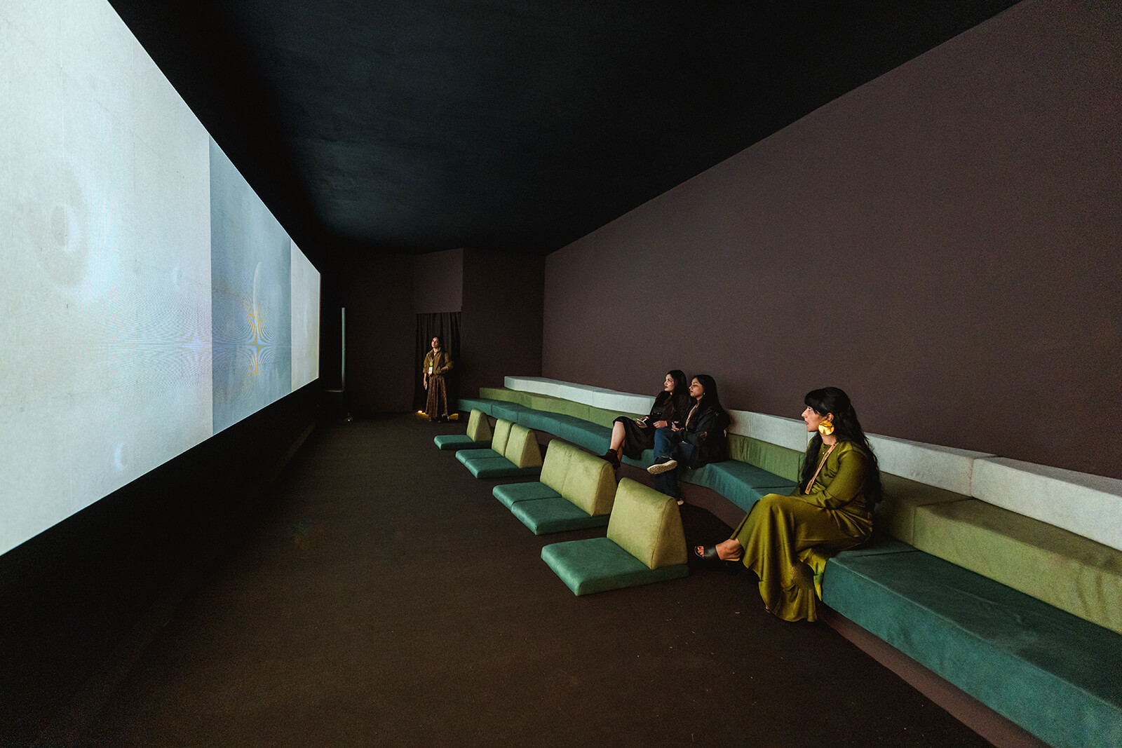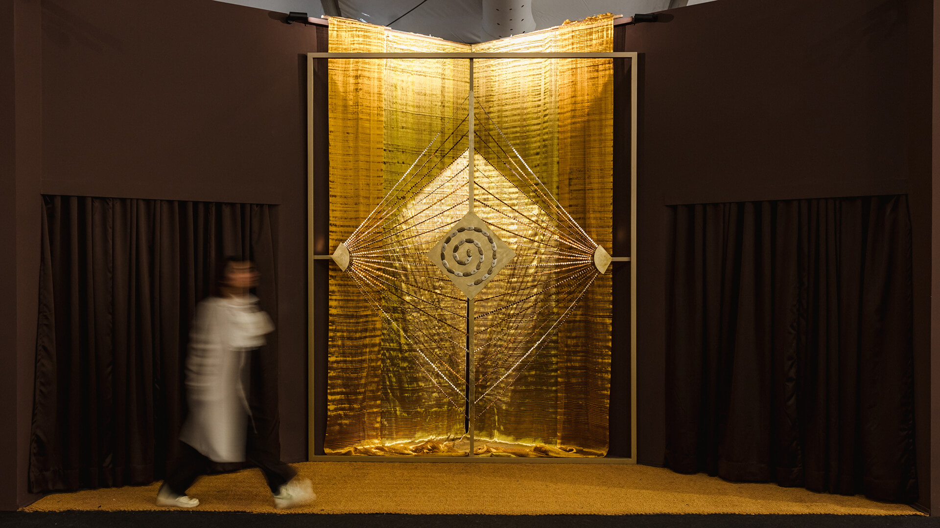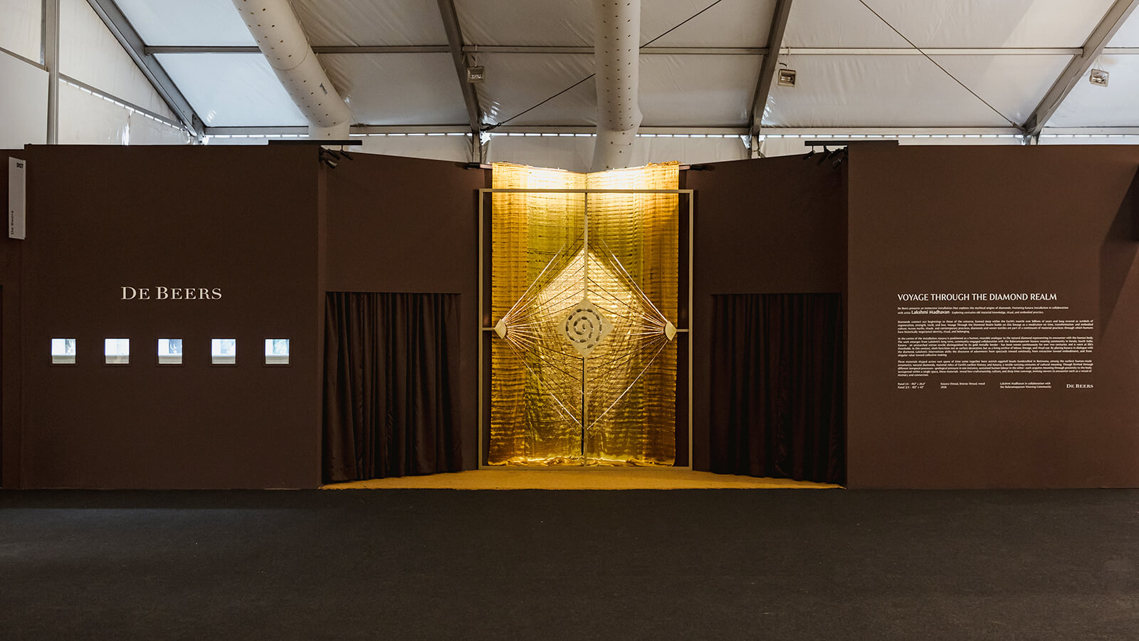 The installation, featuring textile and visual artist Lakshmi Madhavan, proposed a slower encounter with diamonds, presenting their mythical and geological origins as well as accumulated meanings. This materialised through an intervention of kasavu—Kerala’s traditional gold-bordered handwoven cotton/silk textile. “Kasavu is a disciplined material,” the Indian artist noted. “It carries generations of decisions made by hand—how much to hold back, how much to reveal.”