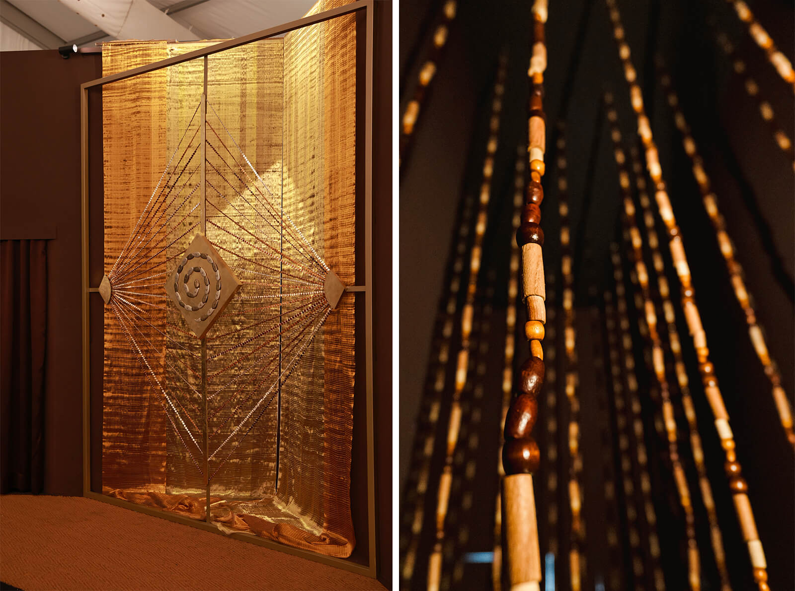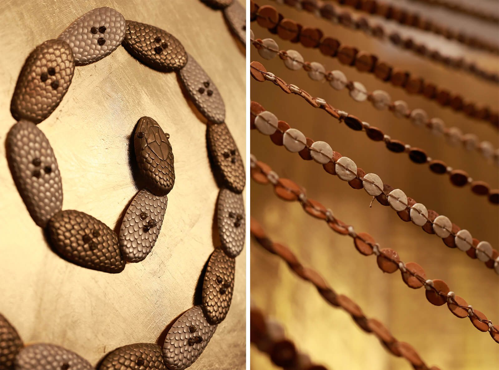In front of this kasavu backdrop stood a diamond-shaped frame holding handmade, threaded ostrich eggshell beads, among the earliest forms of human ornamentation. These converged toward a metallic snake motif studded with unpolished diamonds, which remained deliberately unresolved.