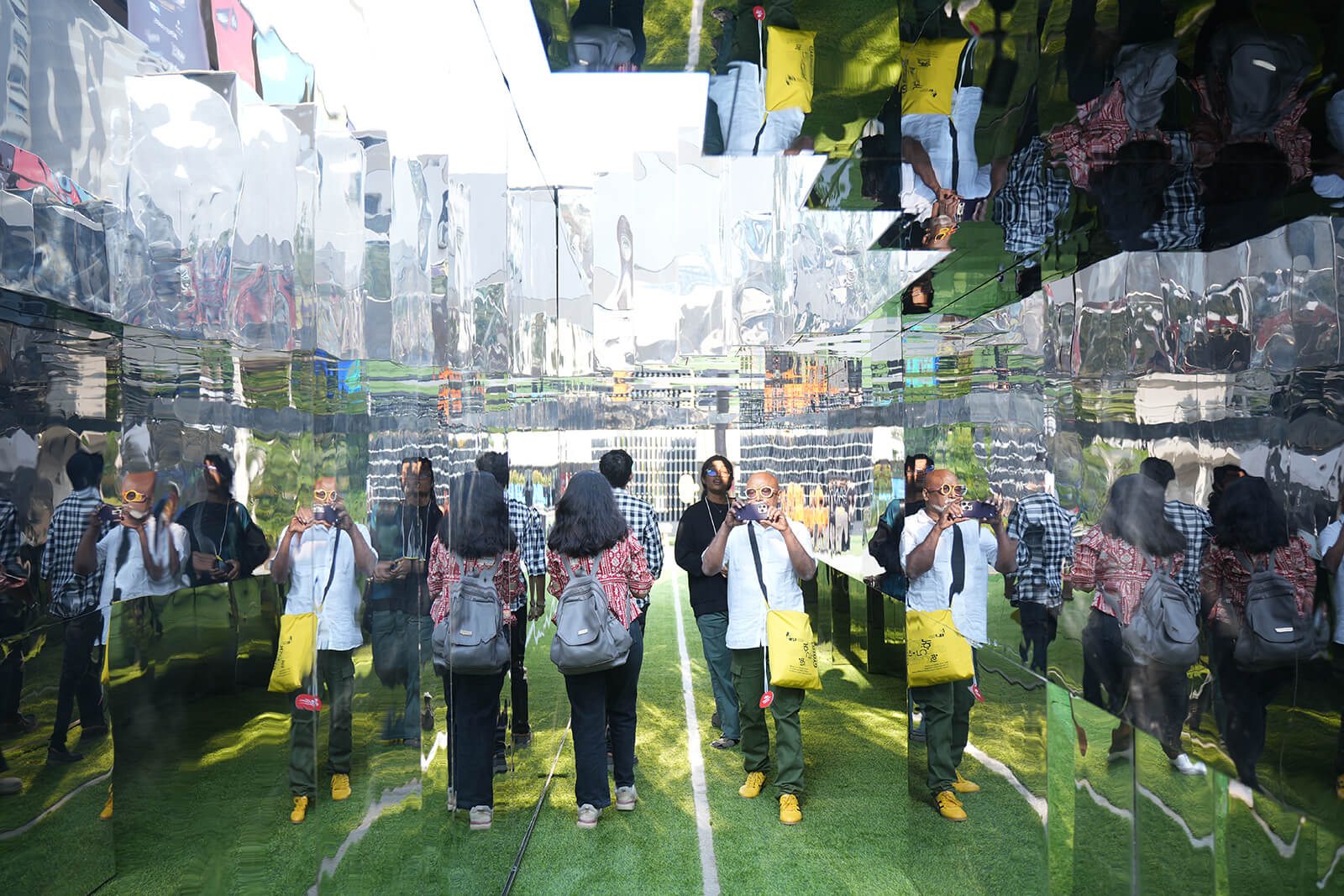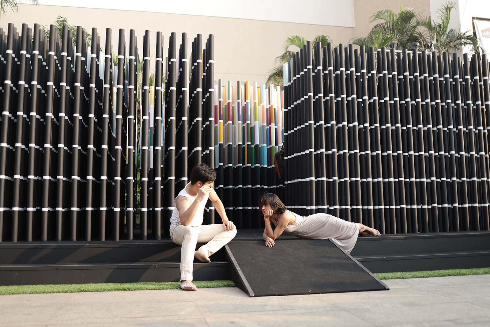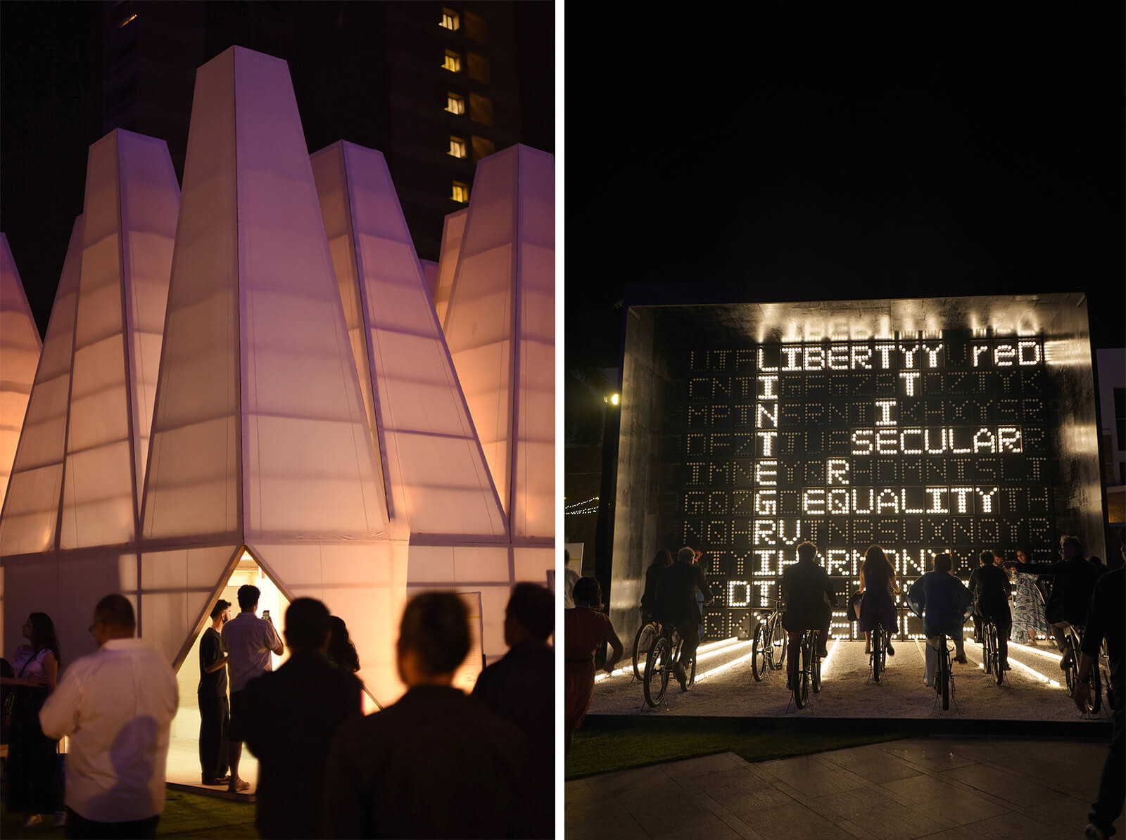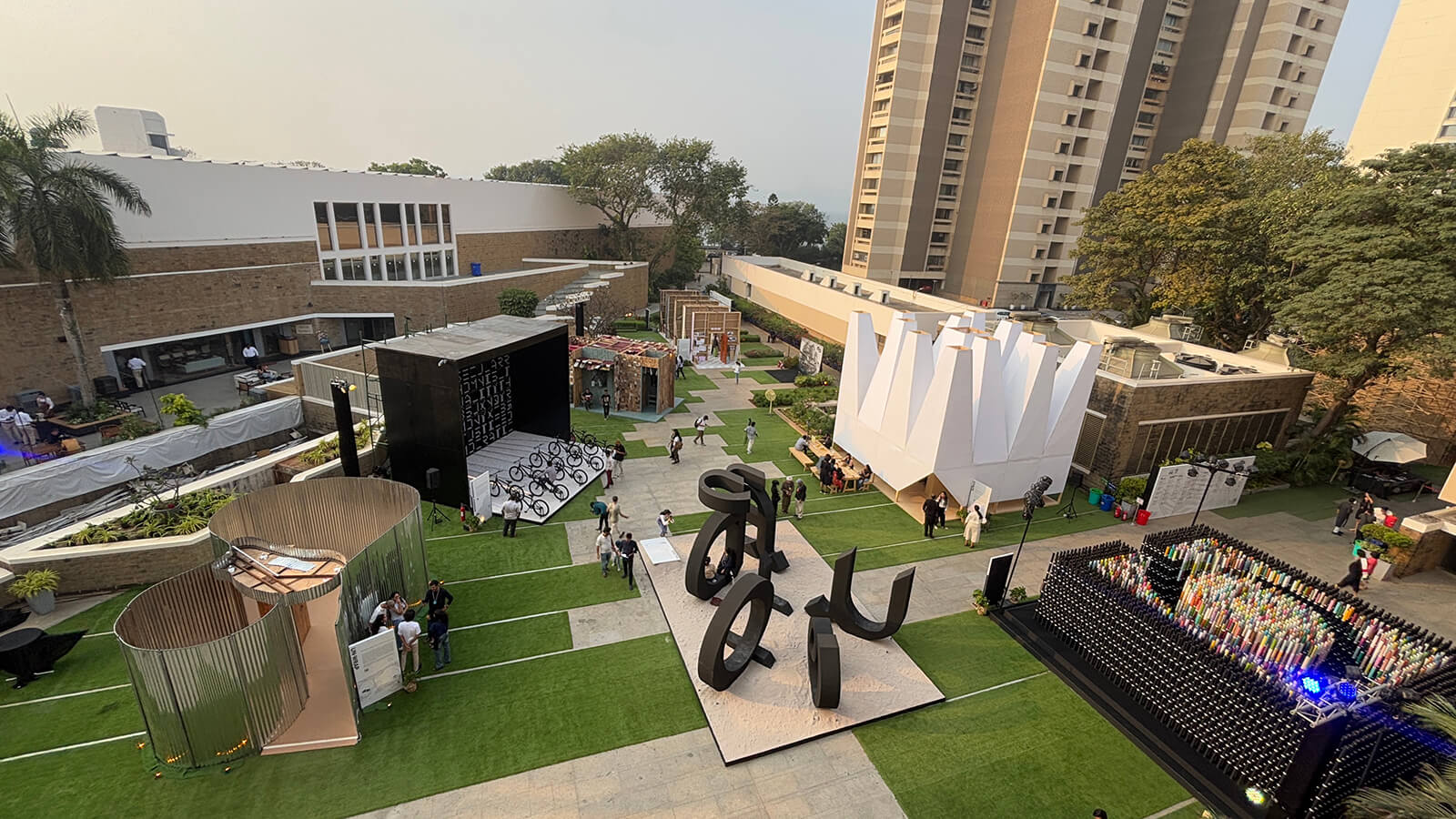 Each pavilion is conceived as a cinematic fragment: an architectural scene that frames the city anew. Designed to be walked through, sat within and performed alongside, these structures are not static objects but ‘spatial provocations’, extending the festival into a porous public encounter on the NCPA lawns.