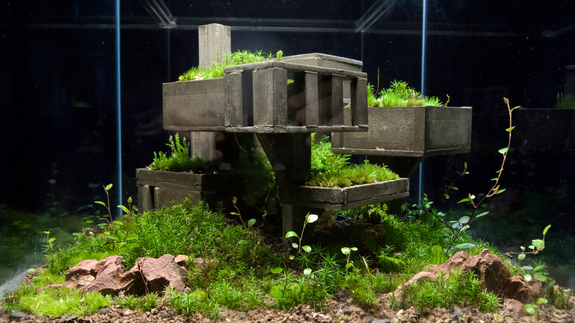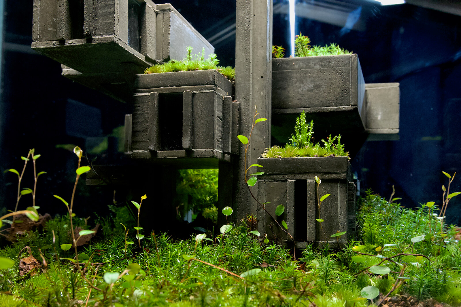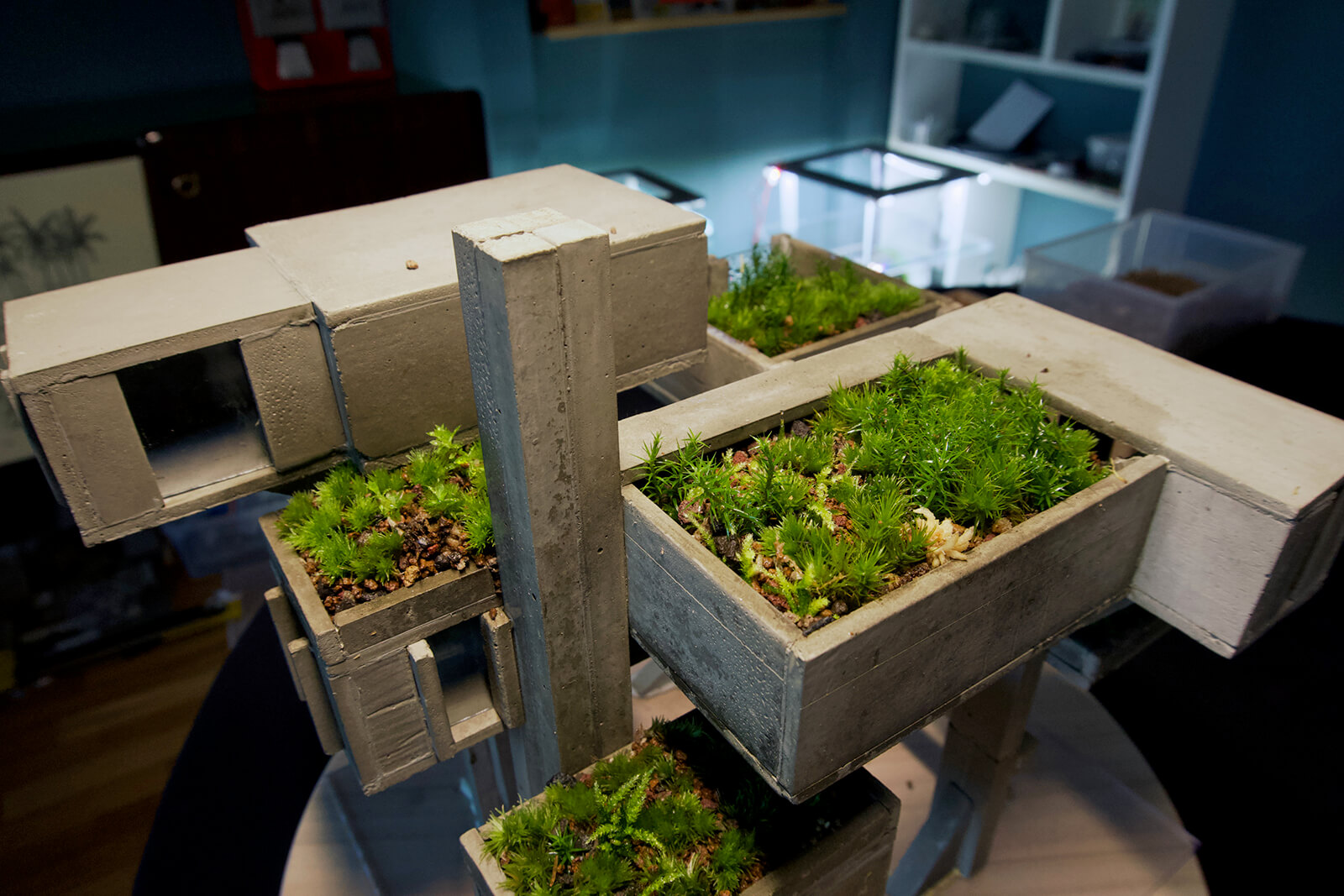 The longevity of each piece depends on ongoing care. While the concrete is durable, the living elements require monitoring. Fava adjusts humidity, trims excess growth and occasionally replaces plant species that fail to adapt. This sustained engagement is part of the work’s identity. The result is an evolving record of interaction, with each habitat carrying its distinctive trajectory shaped by countless small decisions.