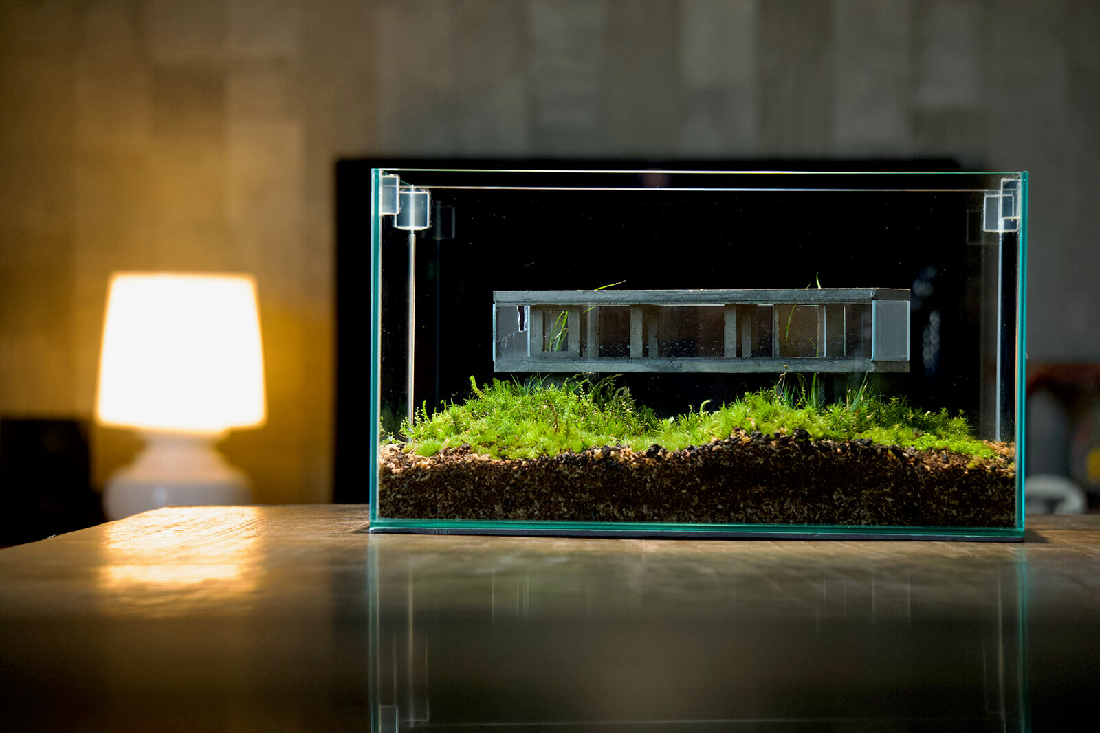 Once complete, the structures are placed in glass terrariums prepared with layered soil substrates, precise humidity regulation and tailored lighting. Plant selection is deliberate, focusing on species whose growth patterns and resilience will create long-term equilibrium rather than an unchecked spread. Adapting methods from Japanese moss culture, Fava manages microclimate variables—fine-tuning moisture levels, filtering natural light and pruning selectively to keep the plants thriving without overtaking the structure.
