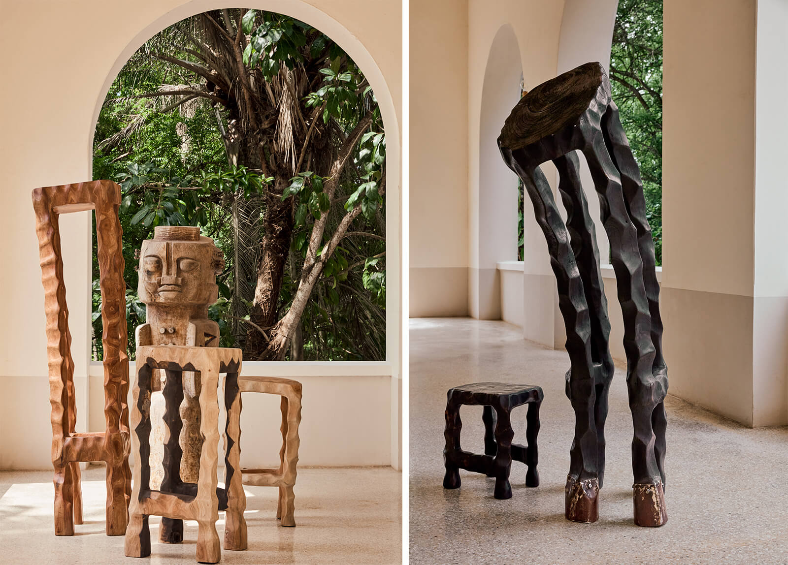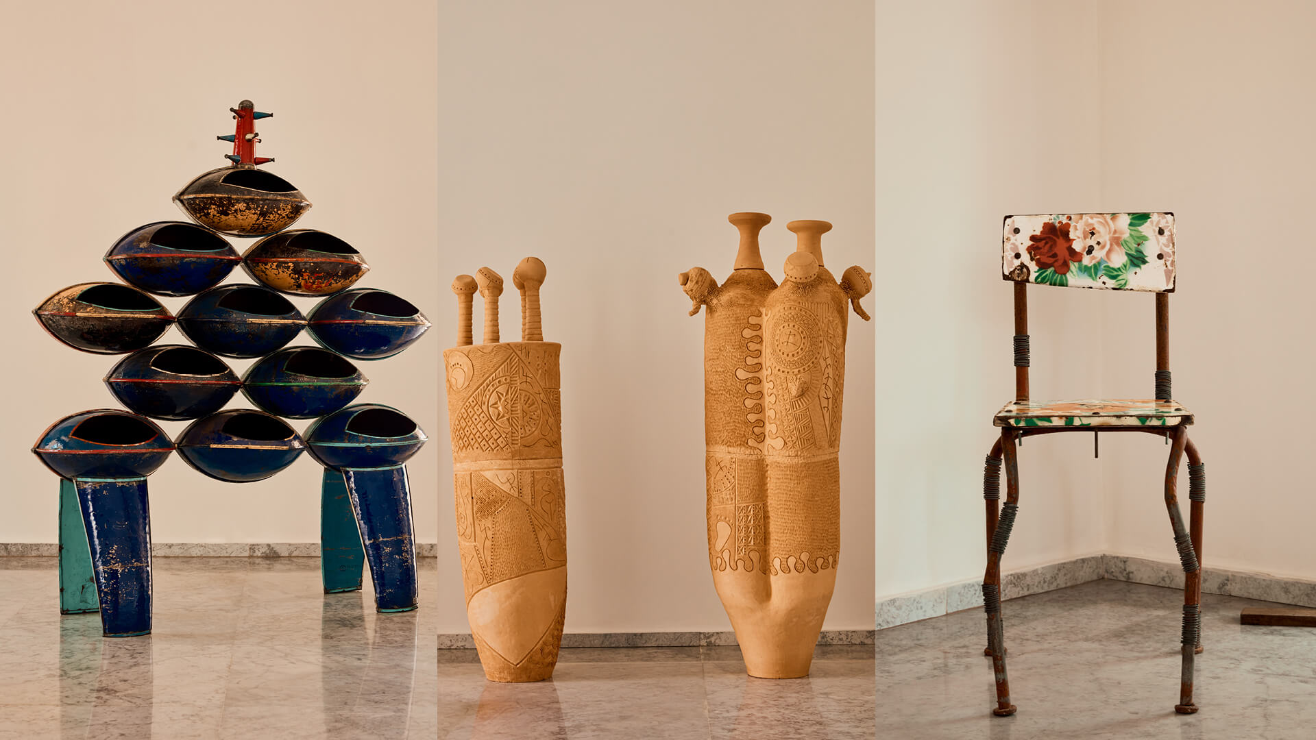 Rufisque-based artist and designer Balla Niang’s chair designs bask in natural light at the exhibition space. Inspired by material transformations, the creative from Senegal creates poetic furniture and sculptural offerings in wood, iron and ox horn. Further, Malinese contemporary African designer Cheick Diallo presents a few armchairs, embodying technical precision, craftsmanship and material intelligence of West Africa, whereas Togolese sculptor and designer Afi Elikplim Akogonya’s wooden sculptures evoke diverse material expressions centring nature and human experience.