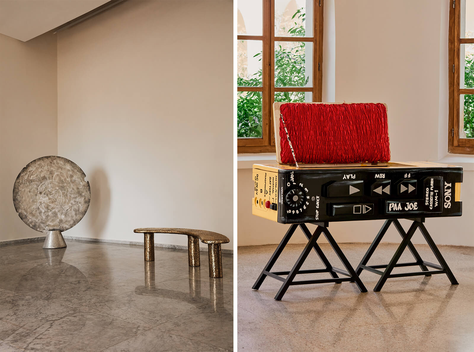 Lagos-born industrial designer Nifemi Marcus-Bello presents a sculpture and a bench made from recycled aluminium. Operating at the convergence of manufacturing, material constraints and cultural contexts, he is known for design collections such as Oríkì (Act III), which challenge global design hierarchies by centring the modes of production and storytelling in Africa. Elsewhere, Ghana-based Paa Joe, an expert craftsman and pioneer of Ghana’s ‘fantasy coffin’ tradition, has transformed funerary art into a sculptural art form ever since he opened his own workshop in Nungua in 1977. For the exhibition, he presents a coffin in the form of a stereo cassette player. Multidisciplinary artist Serge Attukwei Clottey, also from Ghana, showcases his ‘Afrogallonism’ pieces made from yellow plastic jerrycans, transforming waste materials into tapestries and wearable sculptures.