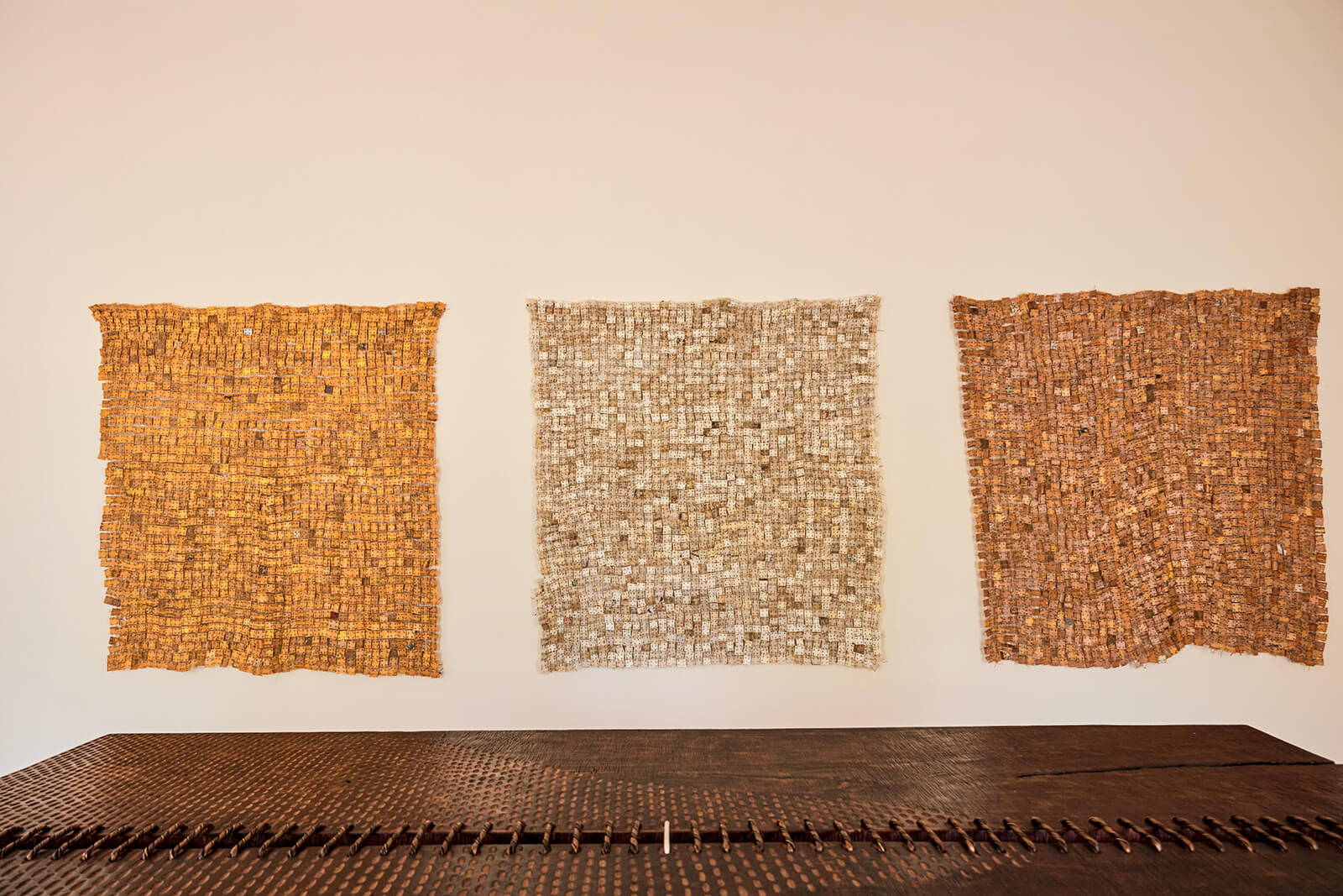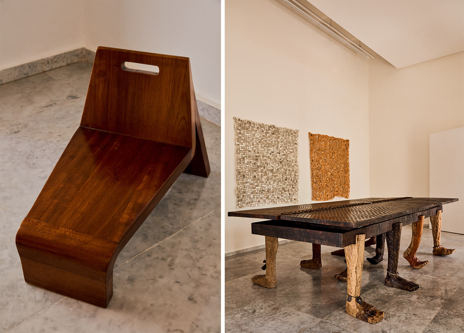 Togolese artist and designer Kossi Assou’s low-lying seats are on display, channelling the traditions of the Sahel region. His practice—comprising sculptures, installations and visual art—is rooted in African traditions and rituals, crafting objects with a profound sense of abstraction. Another Togolese sculpture artist, Steve Kwami Dodji Gbeteglo, presents a wooden table with numerous legs that each honoured various communities of enslaved people. Through the design of wooden objects, his practice draws on allegories from African social imagination and indigenous ritual traditions.
