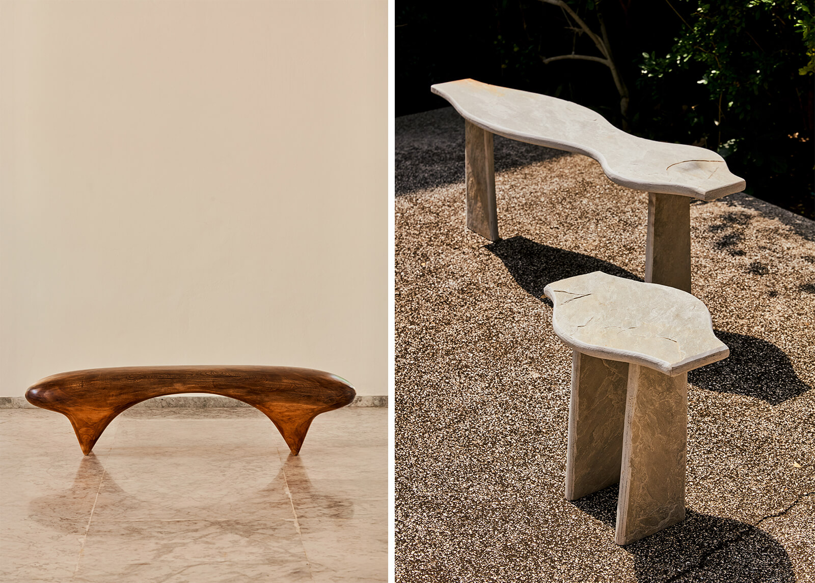 Artist and designer Estelle Yomeda of Franco-Togolese origin presents a series of wooden table designs. Founder of Kente Project ArtLab, she explores traditional crafts through contemporary forms, seeking inspiration from the Kente weaving traditions of Togo and Ghana that feature complex geometric designs. Togolese sculptor Kpedzrokou Kossi, also known as Gona, presents sculptural pieces inspired by creatures such as snakes and alligators, their wooden forms embodying ancestral symbolism and tactile expressions. Elsewhere, Ouagadougou-based Hamed Ouattara—whose works are characterised by distinct transformations of recycled materials such as barrels, metal sheets and industrial remnants into furniture offerings—presents a cabinet in which craftsmanship and circular design principles coalesce.