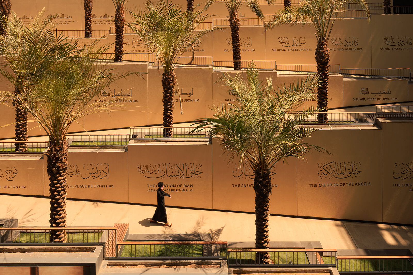 While many developments around the globe seek to balance a profoundly cultural (or culturally profound) landscape with wider appeal and commercial tourism, the dilemma often comes to be a choice between unfettered consumption and fixed reverence; between accounting for global comforts while not just introducing a new culture, but also inspiring similar reverence for it. “For us, the most important decision was to avoid adding another object to the skyline and instead choreograph a landscape that holds together mosque, city and geology,” Ali shares. The As Safiyyah Museum and Park contributes to the debate by offering a slow transition from its urban context—a walk through history, memory, shade and stone—before gently engaging the visitor with culture and commerce in varying measures. “The thick basalt wall, the introverted courtyard and the stepped oasis all work together to hold back the chaos of the street and resist the temptation of pure retail frontage. Inside, the museum tells the story of creation through spatial design rather than literal scenography,” Ali continues. “I believe these decisions create a third condition—not sacred monument, not generic retail, but a grounded civic landscape that is a negotiation between the two.”