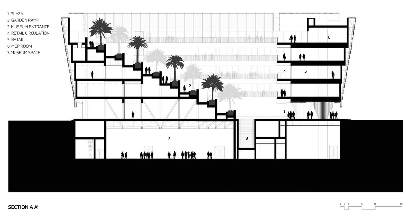 The rest of the five-storey structure is a series of retail spaces cascading down from the rooftop through the stepped public garden, enclosed by a thick boundary wall as a buffer from the intense urban sprawl outside—a reflection of the historic character of Medina’s walled core. The design of the garden is meant to be an ode to the oasis that the city once was, lost over the last few decades to drought and development, revering the elements of water and Earth through terraces adorned with palm trees, stepped planters, courts and water basins to offer rest and respite.