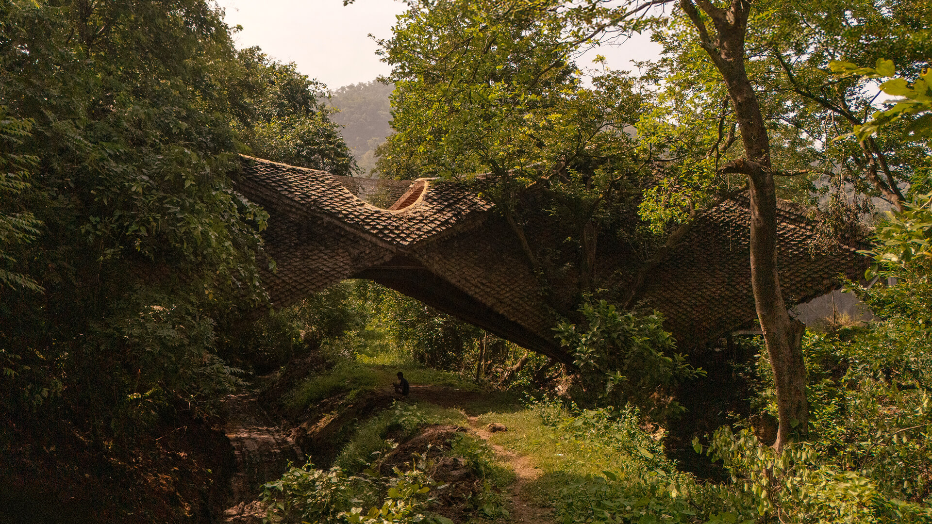 Against the rain-soaked backdrop of Sahyadri mountains in Karjat, Maharashtra—a verdant getaway near Mumbai—a large floating cocoon camouflages itself within a dense natural landscape. Bridge House, designed by Indian architecture practice Wallmakers, is a home born out of numerous topographic constraints and an approach that prioritised problem-solving while being mindful of ecology. It is through these challenges that the project perseveres and emerges, wielding a distinct form and acting as a bridge between natural and built environments.