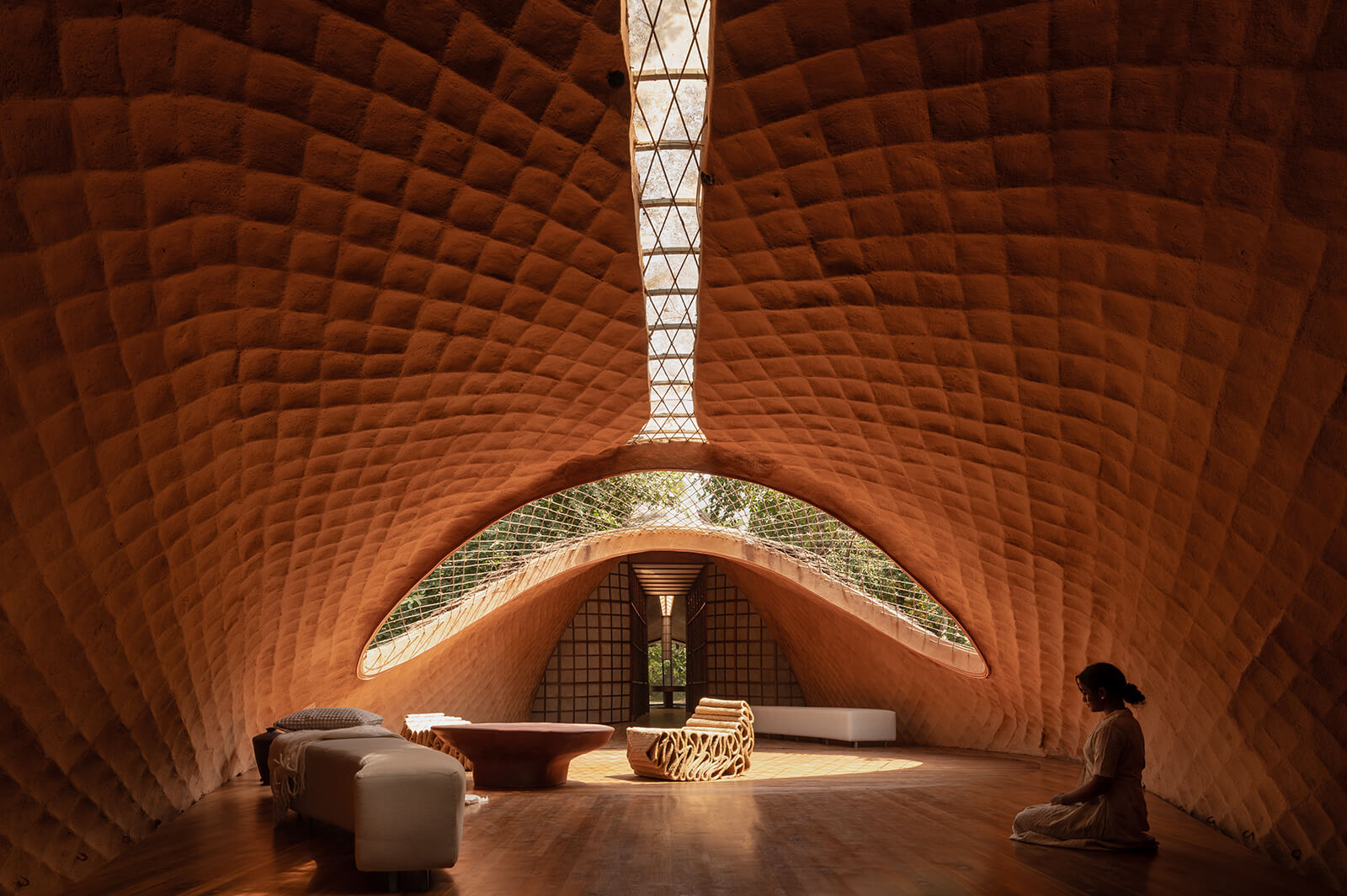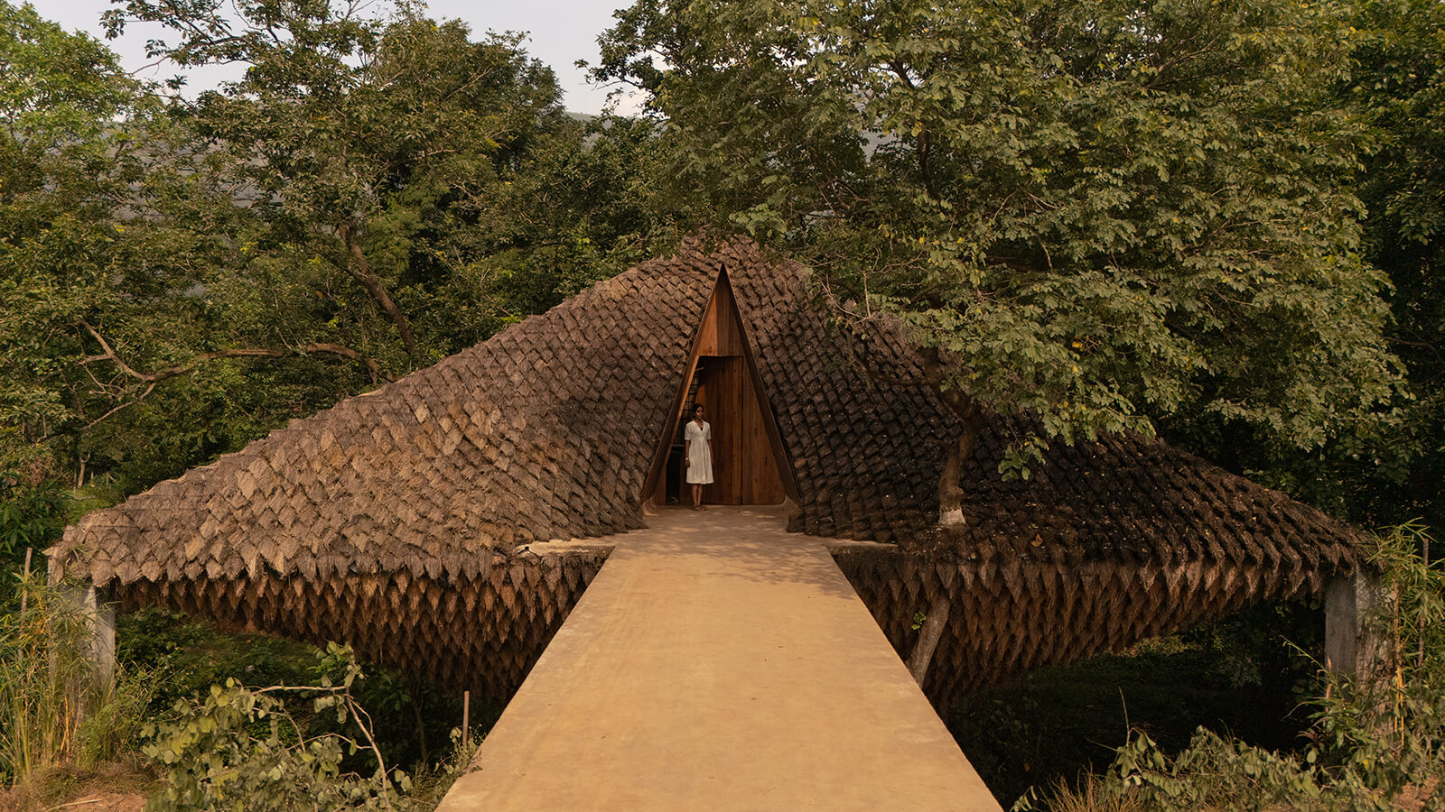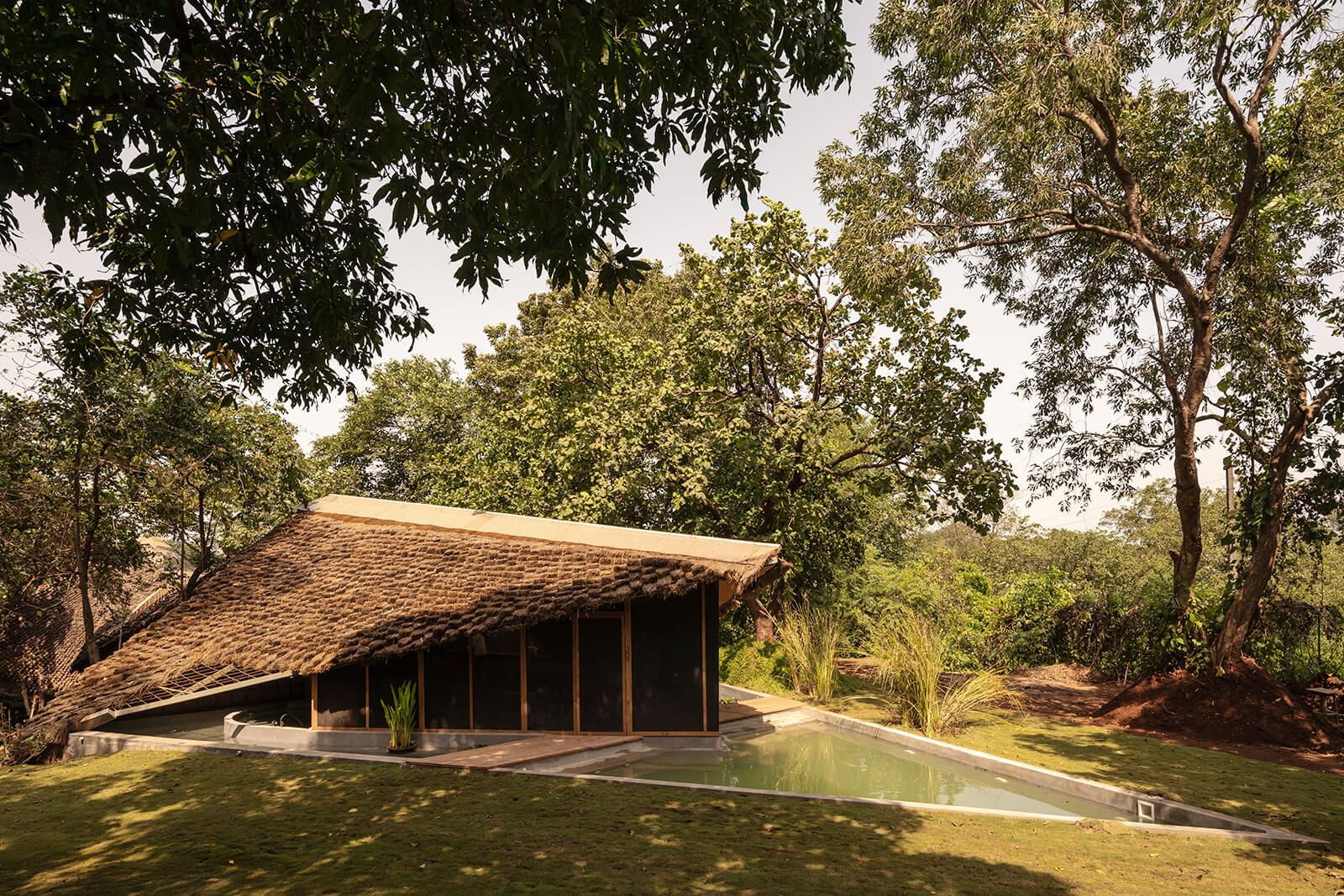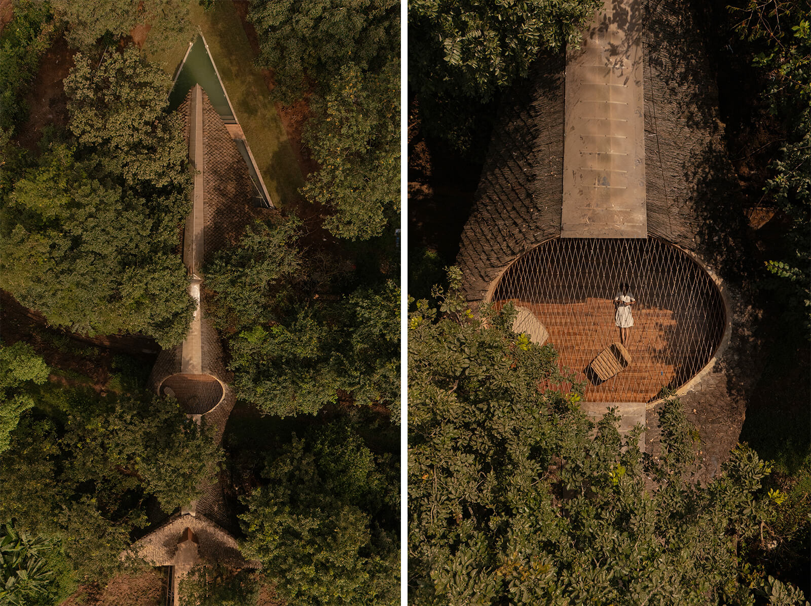 According to the design team, the parabolas derive their tensile strength from a minimal use of steel pipes and tendons, while the thatch-mud composite above provides compressive strength. Inspired by the scales of a pangolin, the thatch layer further provides thermal insulation whereas the mud plaster layer ensures protection from rodents and pests so that they don’t burrow their way inside. The extensive use of locally available, low-embodied-energy materials anchors the project in regional building traditions while their processing and application are articulated through a contemporary design approach. These materials are not deployed nostalgically but performatively, offering a climate-responsive design in a region marked by heavy monsoons and fluctuating temperatures. The layered envelope acts as both a climate moderator and a visual camouflage, allowing the structure to recede into the landscape with a temporal flow.