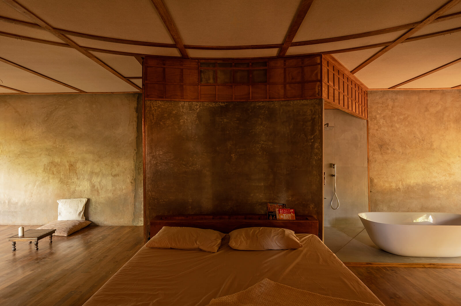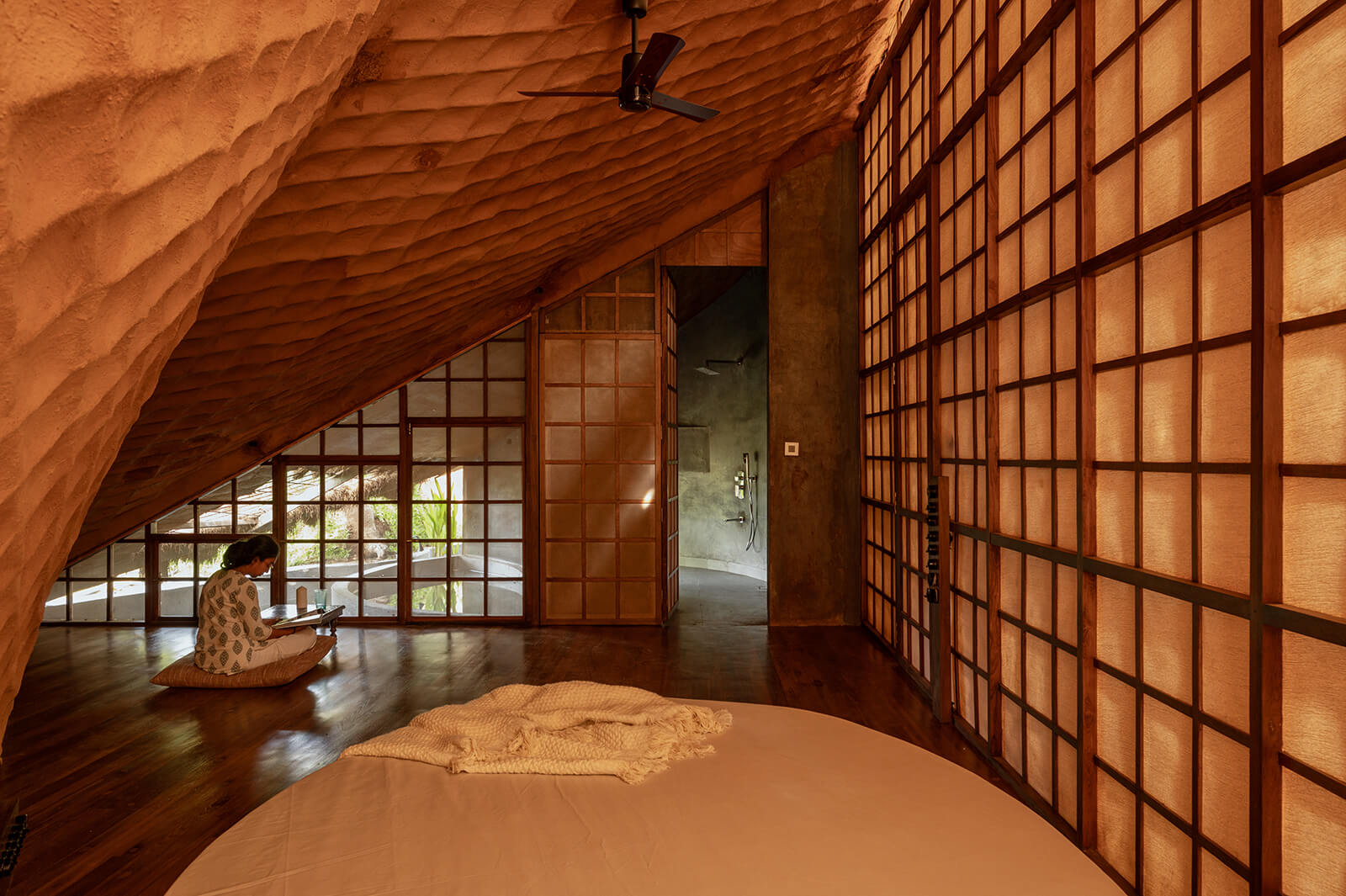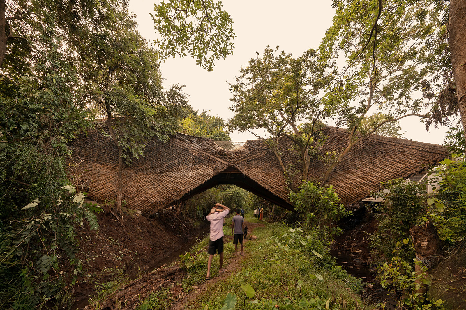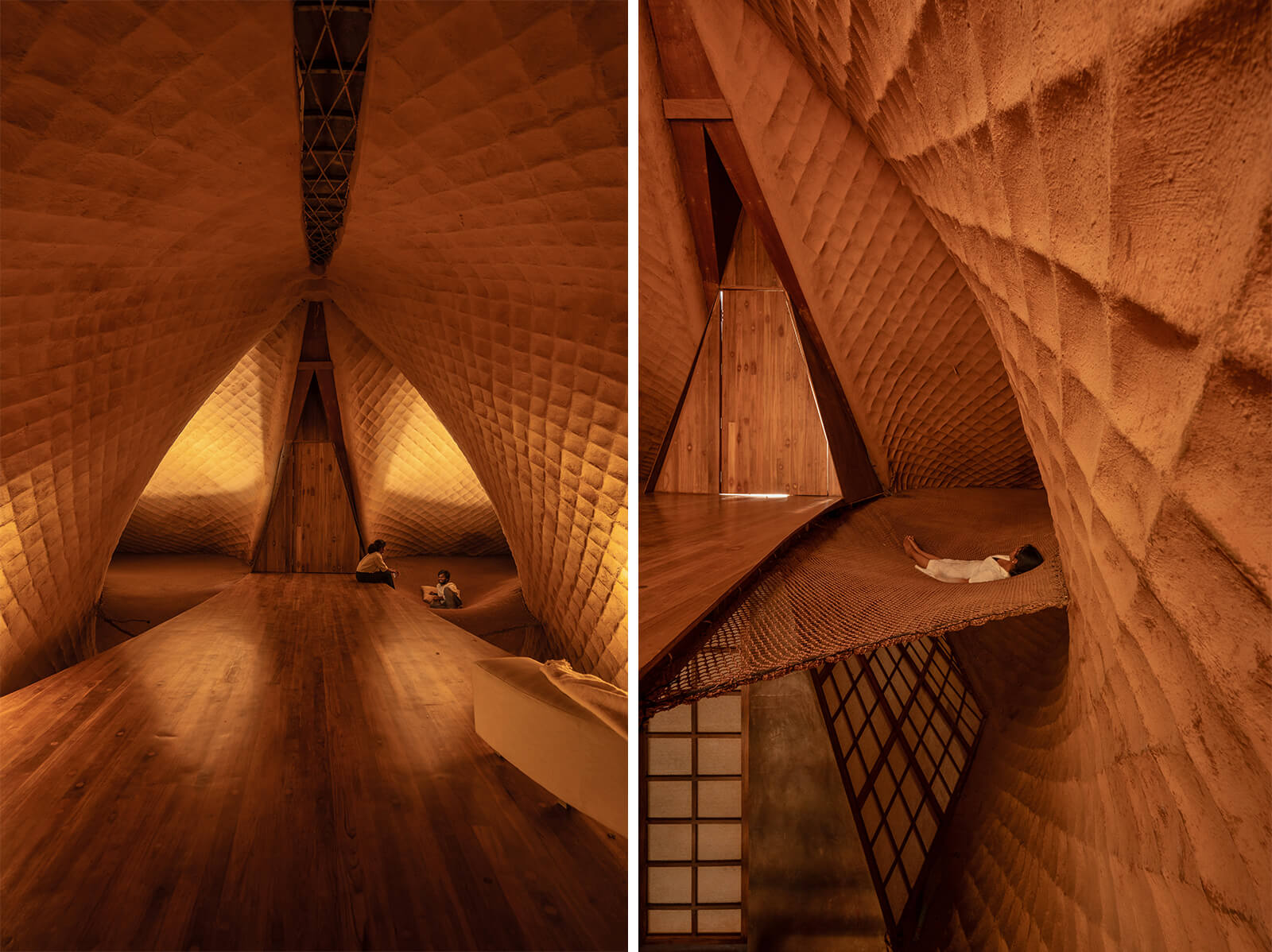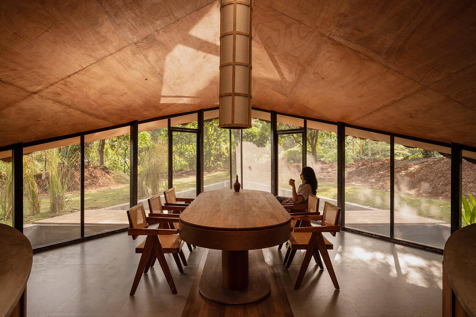 According to the design team, the parabolas derive their tensile strength from a minimal use of steel pipes and tendons, while the thatch-mud composite above provides compressive strength. Inspired by the scales of a pangolin, the thatch layer further provides thermal insulation whereas the mud plaster layer ensures protection from rodents and pests so that they don’t burrow their way inside. The extensive use of locally available, low-embodied-energy materials anchors the project in regional building traditions while their processing and application are articulated through a contemporary design approach. These materials are not deployed nostalgically but performatively, offering a climate-responsive design in a region marked by heavy monsoons and fluctuating temperatures. The layered envelope acts as both a climate moderator and a visual camouflage, allowing the structure to recede into the landscape with a temporal flow.