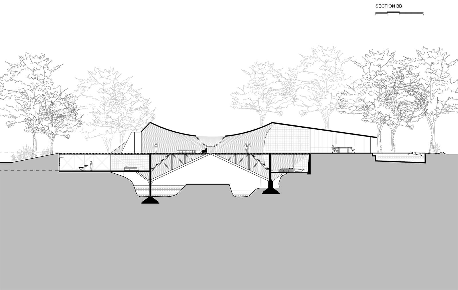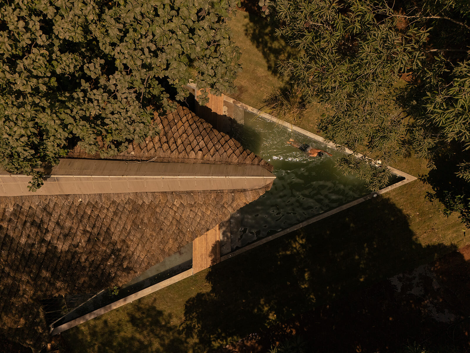 The two built masses on the land, comprising four bedrooms, feature jute and mesh screens alongside reclaimed wooden flooring sourced from ship decks. A vast common area on the upper level spills over to the surroundings through a triangular-shaped pool. In the absence of a vertical suspension pillar and the use of four minimal footings, the bridge becomes a safe haven for the residents to inhabit without disturbing the natural ecosystem they are a part of.