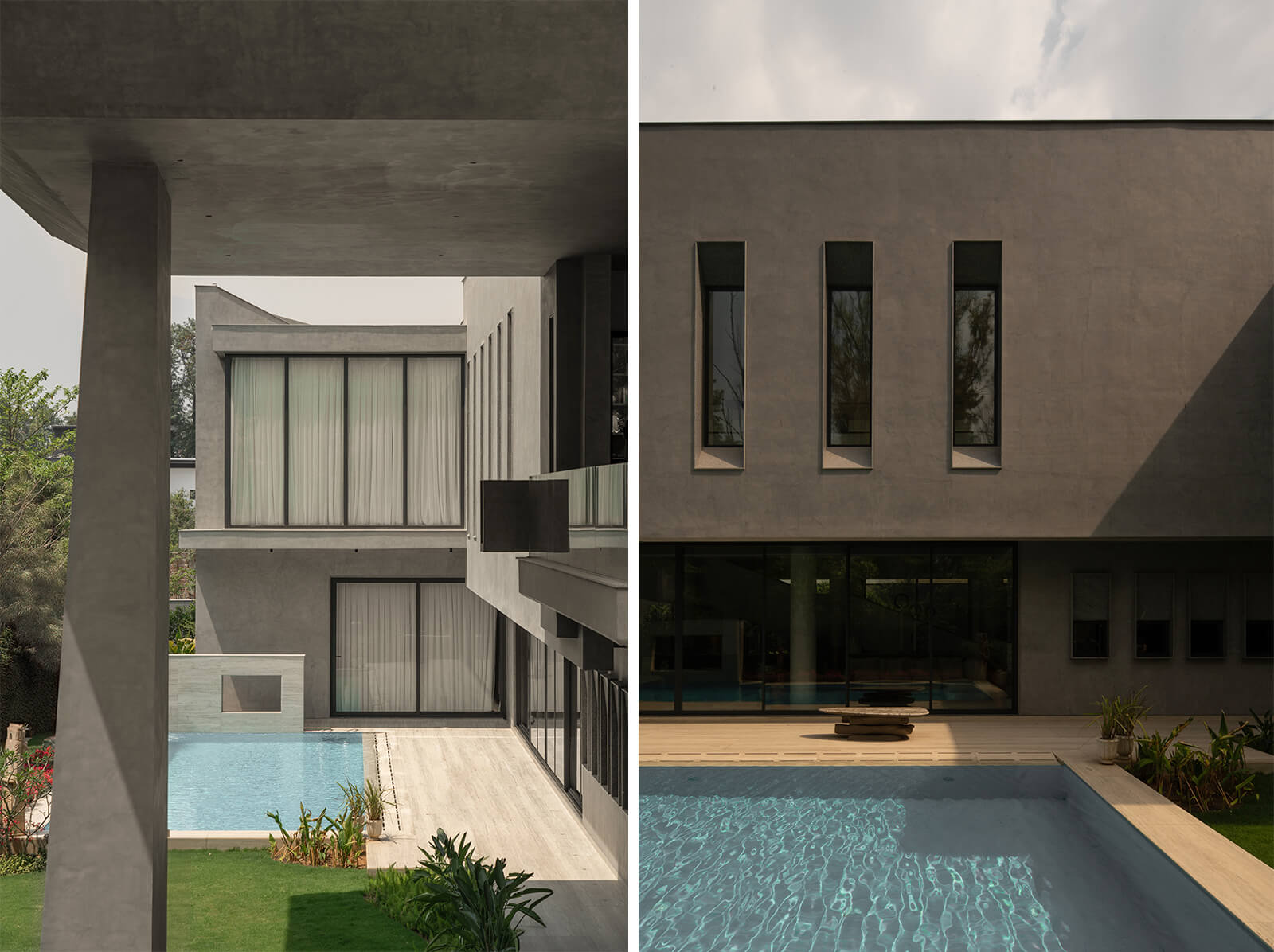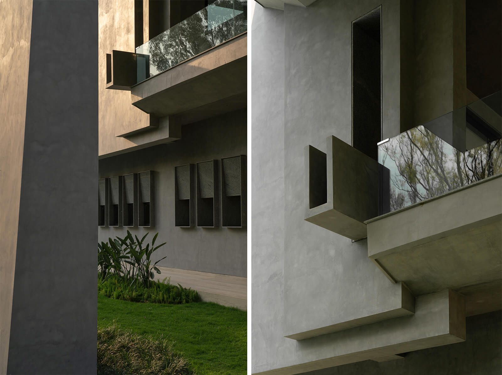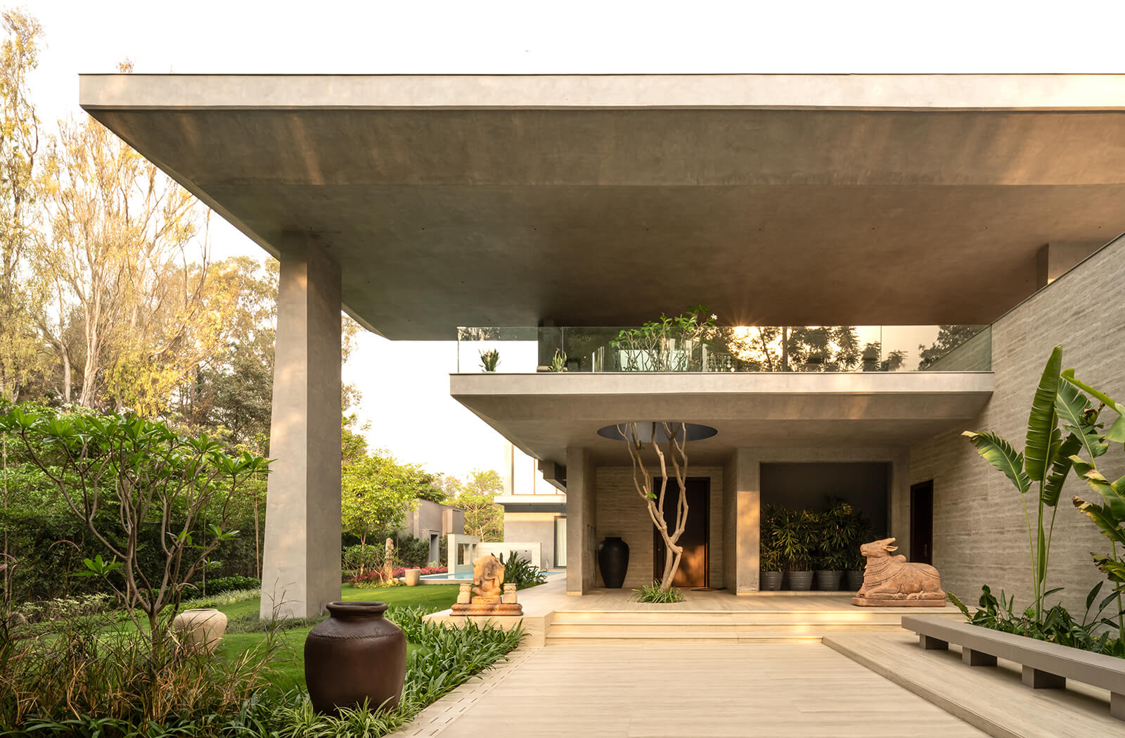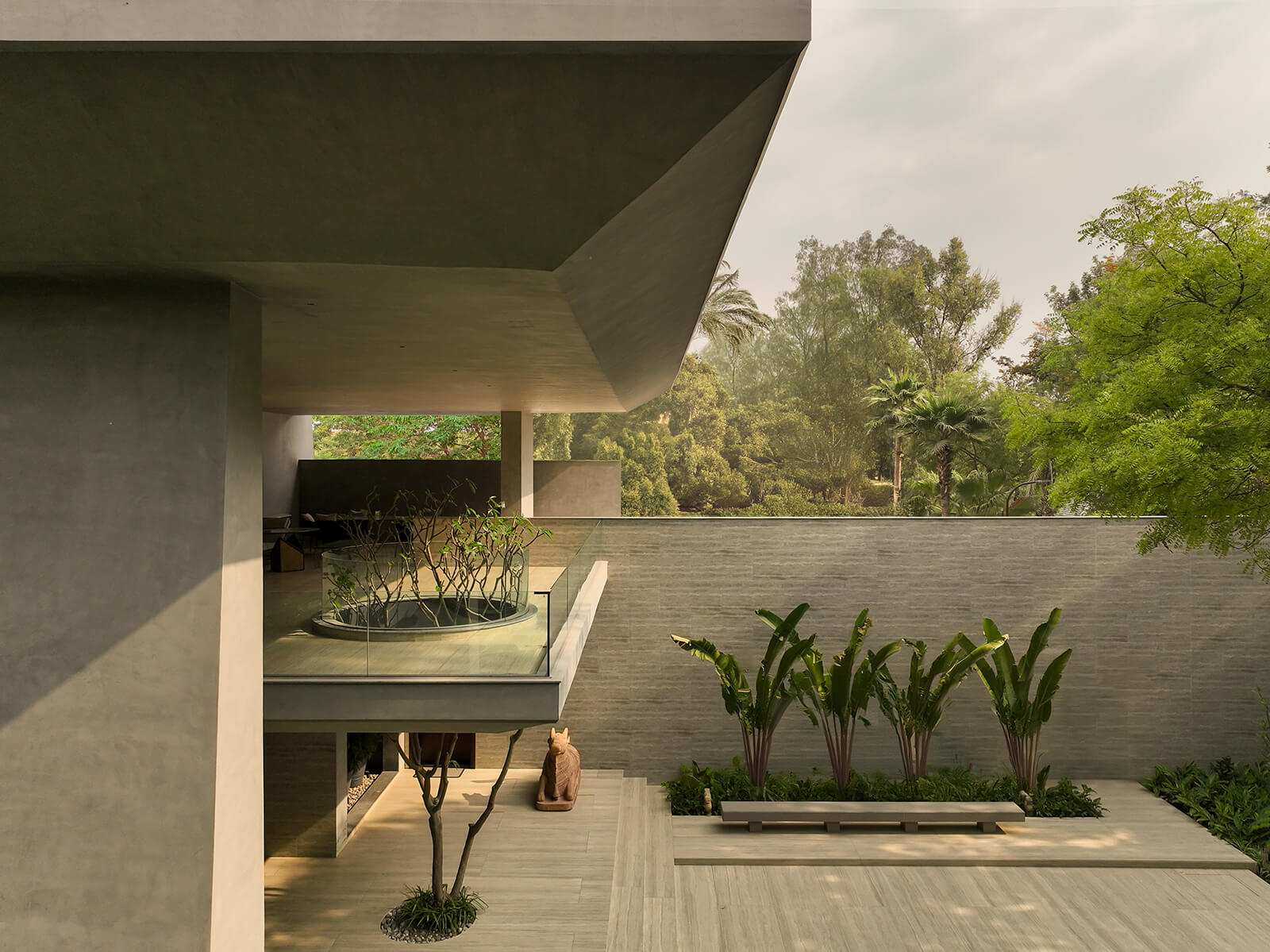 The house interweaves contrast and clarity to function spatially. The entrance gently unfolds to provide framed views that change as one manoeuvres through the building. Public spaces are ample and peaceful, with volumes that softly compress or extend upward to steer use and mood. Massing and placement aid in insulating the more private areas, such as the art studio, bedrooms, sit-out space and gym, while preserving visual connections to common areas. Material changes, portals and shifting lighting accentuate transitions, with each layer calibrated to provide rhythm in the concrete architecture. The home carefully balances order and variation at every scale, between the oblique's lyrical deviation and the grid's rationalism.