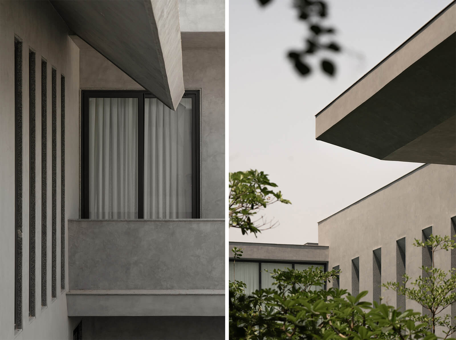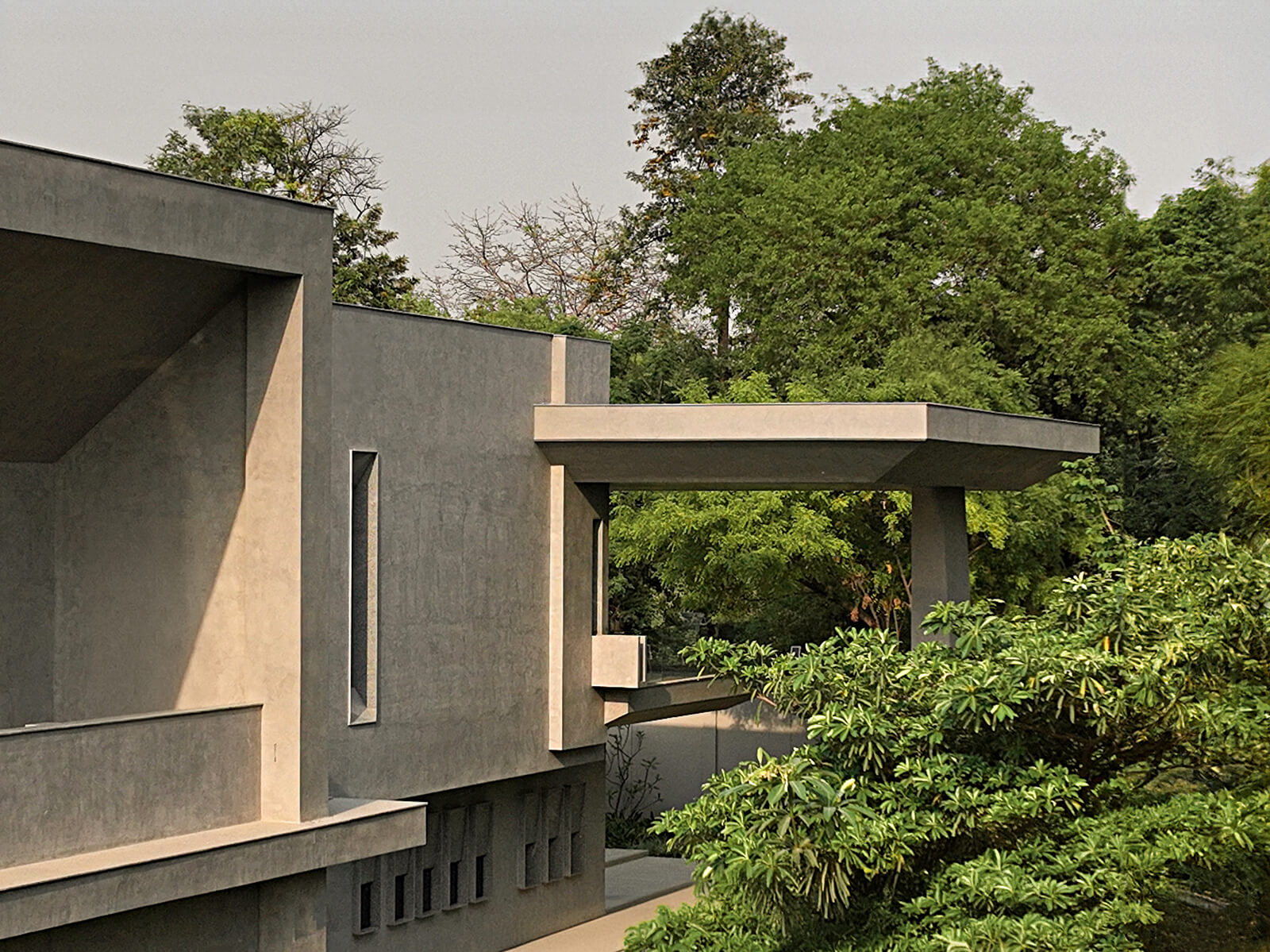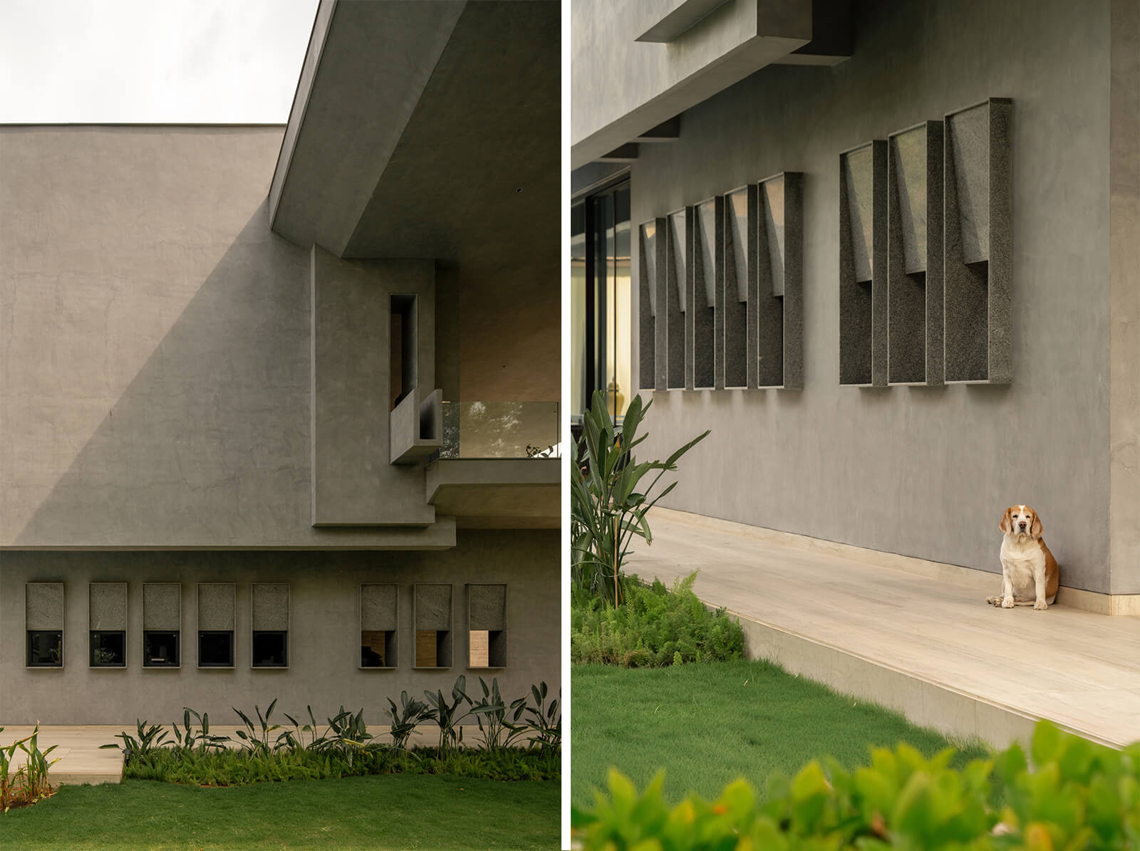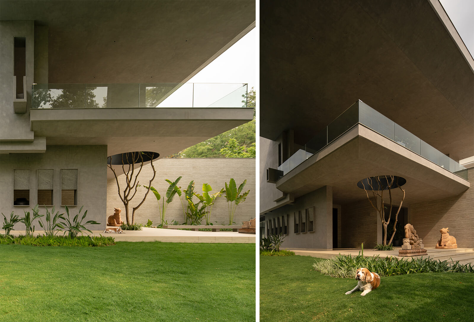 The house interweaves contrast and clarity to function spatially. The entrance gently unfolds to provide framed views that change as one manoeuvres through the building. Public spaces are ample and peaceful, with volumes that softly compress or extend upward to steer use and mood. Massing and placement aid in insulating the more private areas, such as the art studio, bedrooms, sit-out space and gym, while preserving visual connections to common areas. Material changes, portals and shifting lighting accentuate transitions, with each layer calibrated to provide rhythm in the concrete architecture. The home carefully balances order and variation at every scale, between the oblique's lyrical deviation and the grid's rationalism.