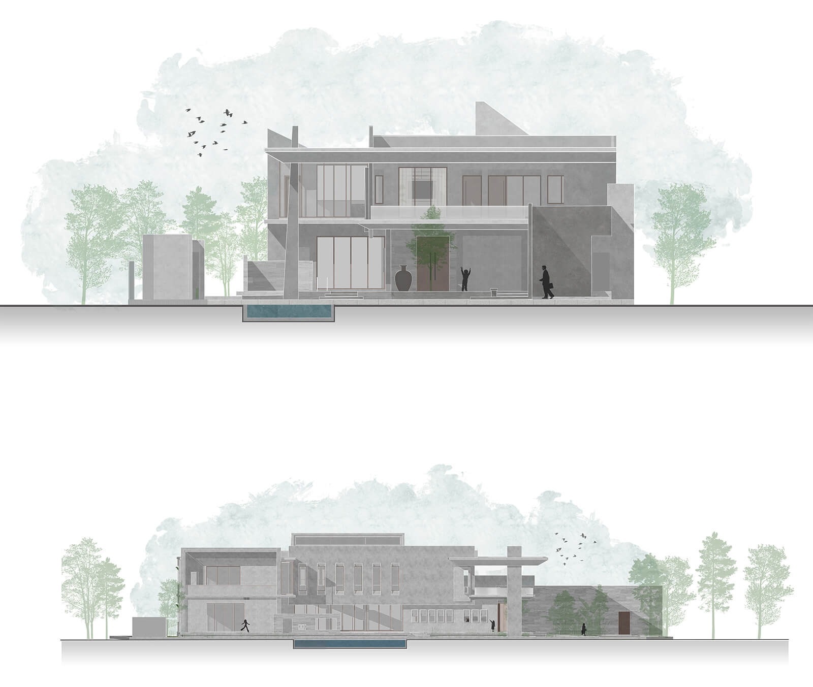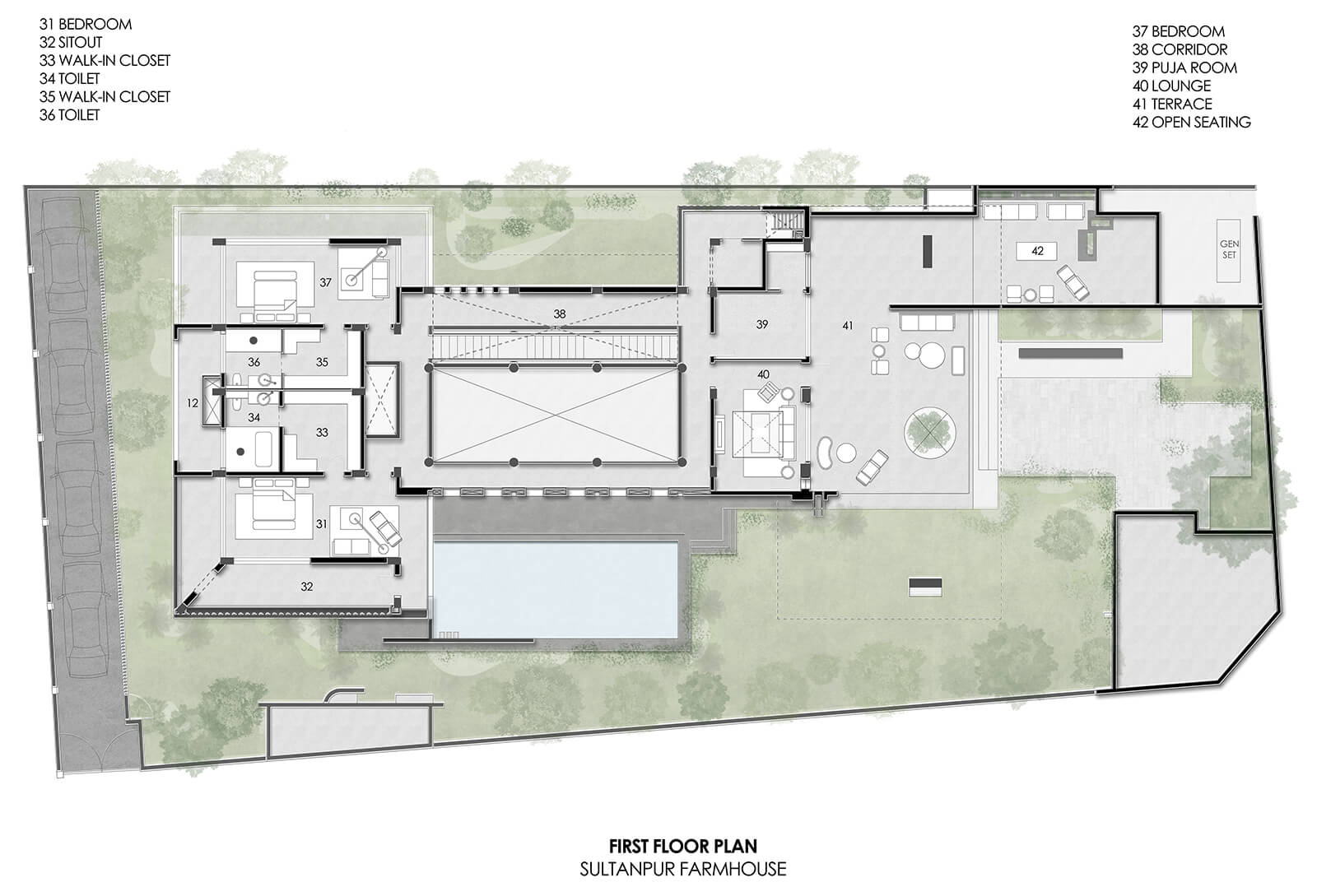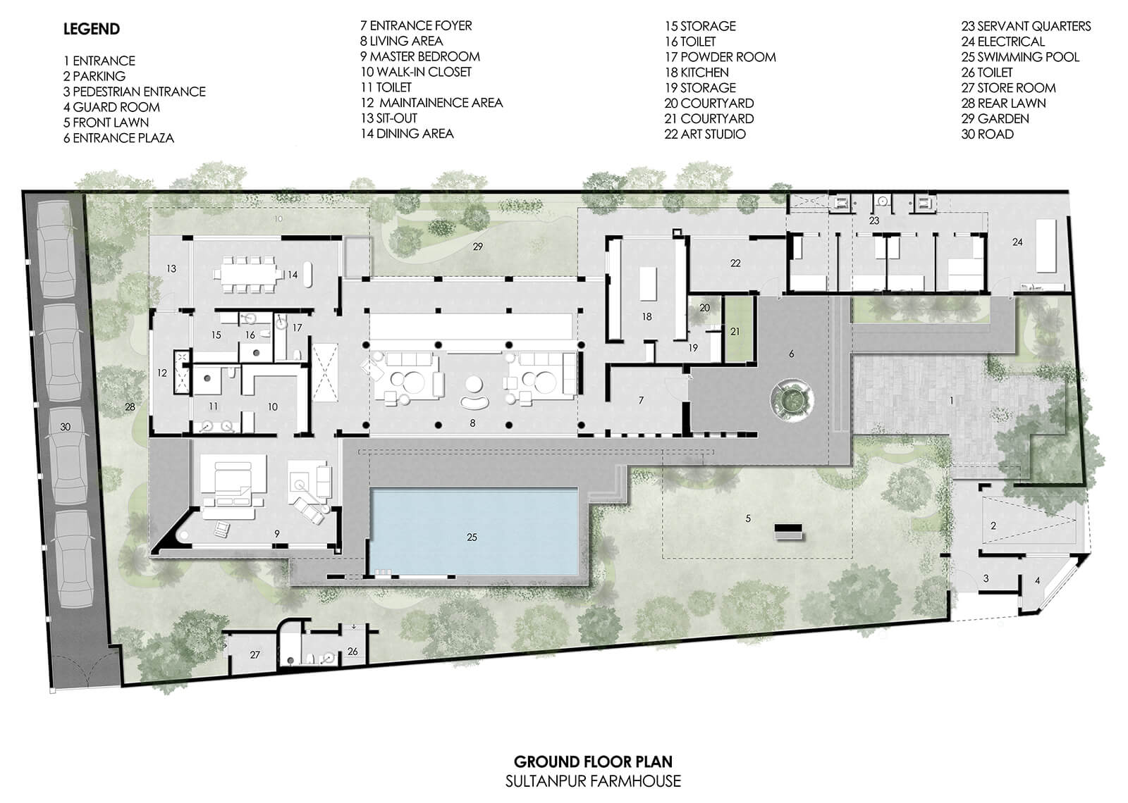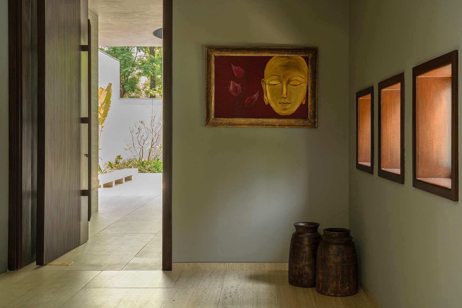 The house interweaves contrast and clarity to function spatially. The entrance gently unfolds to provide framed views that change as one manoeuvres through the building. Public spaces are ample and peaceful, with volumes that softly compress or extend upward to steer use and mood. Massing and placement aid in insulating the more private areas, such as the art studio, bedrooms, sit-out space and gym, while preserving visual connections to common areas. Material changes, portals and shifting lighting accentuate transitions, with each layer calibrated to provide rhythm in the concrete architecture. The home carefully balances order and variation at every scale, between the oblique's lyrical deviation and the grid's rationalism.