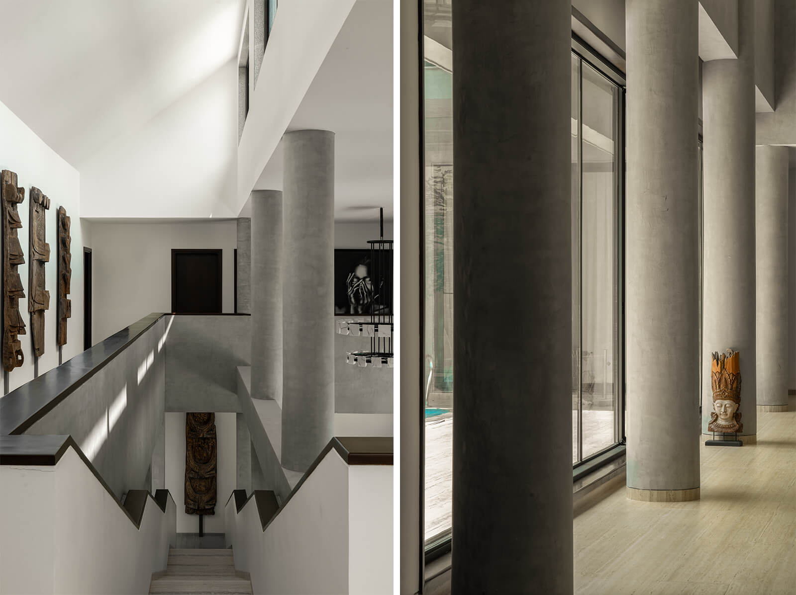 A close dialogue between the studio and the client and a deep understanding of their backgrounds became the reference points for the project. The client’s background in art was central to the brief that called for a structure that transcends domesticity. The house is envisioned to shapeshift as a living art gallery that can harbour, display and respond to creative work. The Indian architects, hence, refrained from compartmentalising functions and instead conceived a flowing sequence of experiences framed by walls and corridors. The oblique column emerges as an intentional disturbance that plays with the spatial complexity and choreographs the movement, views and alignments throughout the plan. “It [the oblique column] serves as a monumental anchor, visually unifying the spaces while challenging traditional notions of vertical support,” Arora explains. “Rather than being a passive structural element, it becomes an artistic statement, symbolising movement and dynamism within the built form,” he adds.