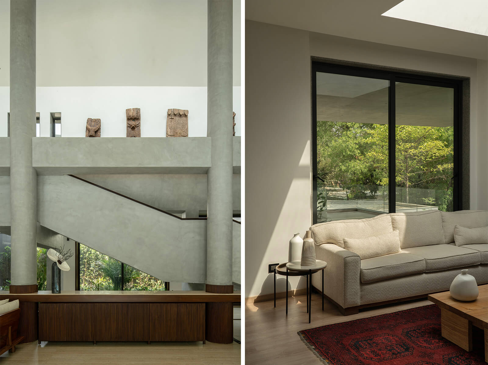 Abiding by the semantics of subtle brutalism, the residence features a material palette that relies on exposed concrete as a primary element, reinforcing a raw, sculptural presence throughout the home. The monolithic language is equalised by the warmth of materials such as sandstone, Kota stone and travertine, all sourced locally to augment textural layers and depth. Expansive glass panels bridge the indoor and exterior areas, enabling the building to engage with the surrounding environment, while metal accents and wooden infills lend a sense of refinement. “The material palette is a refined take on brutalism,” the architect notes, adding that “the approach was to work with materials in their natural, unpolished state, allowing their inherent textures to define the home’s character."