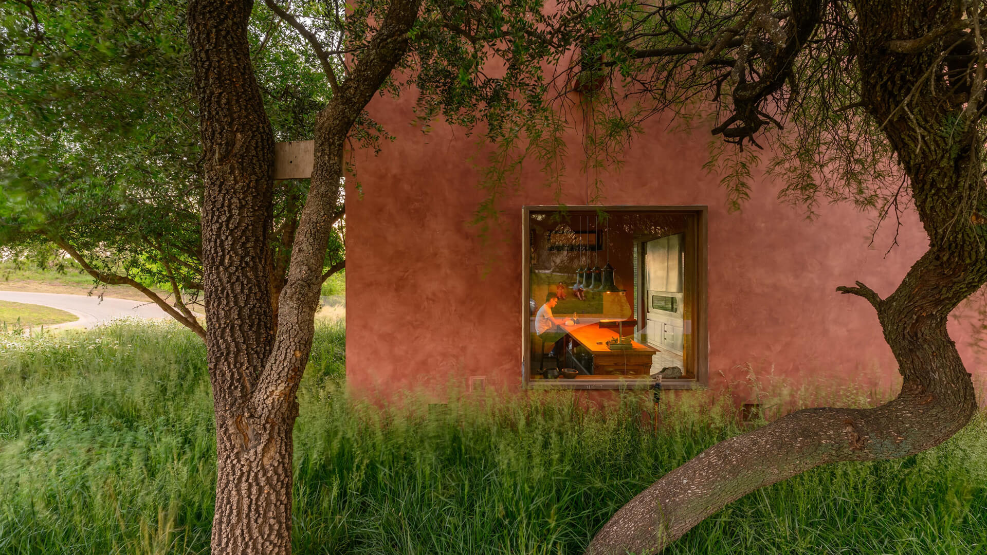 Material choices throughout Casa BP are both contextual and performative. The primary volume is finished in pigmented cement render and applied with a handcrafted texture and mineral finish that gives the walls depth and chromatic unity. These surfaces respond sensitively to changing light conditions like absorbing warm hues at sunrise, deepening into ochres at sunset and flattening into a matte presence on overcast days. The effect is not decorative but temporal, allowing the building to register shifts in climate and atmosphere.