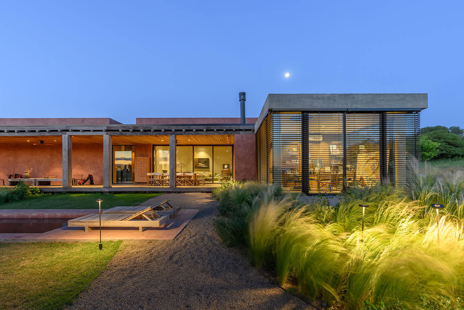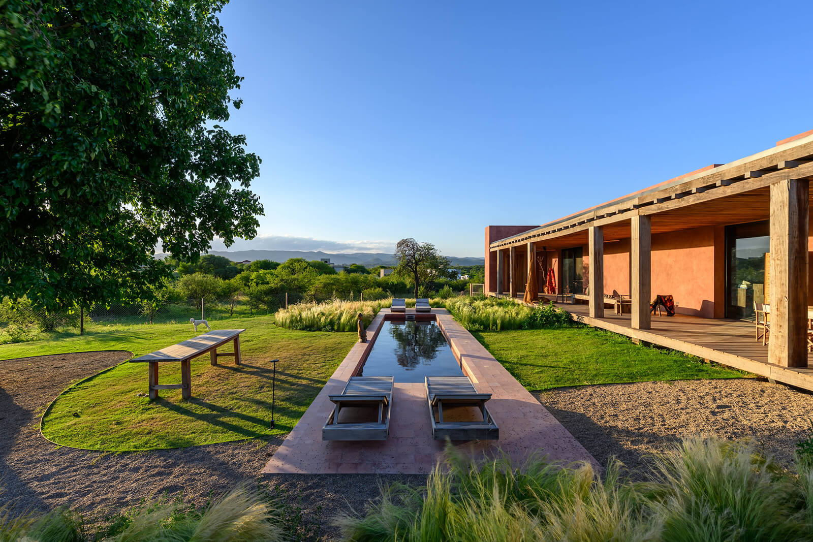 Landscape design plays a crucial role in grounding the project within its context. The garden is composed exclusively of native species such as grasses, herbaceous plants and local shrubs arranged in a loose, naturalistic manner. This approach avoids ornamental excess, instead treating the landscape as an extension of the Serrano ecosystem: a terrain characteristic of central Argentina’s hilly regions. The ecosystem belongs to a transitional dry woodland and grassland bioregion and is shaped by seasonal dryness, strong solar exposure and thin, mineral-rich soils. The selected plant communities reflect these conditions, reinforcing ecological continuity while ensuring resilience and low maintenance over time. The planting reinforces existing topography, softening the transition between built form and terrain while allowing the house to recede visually into its environment.